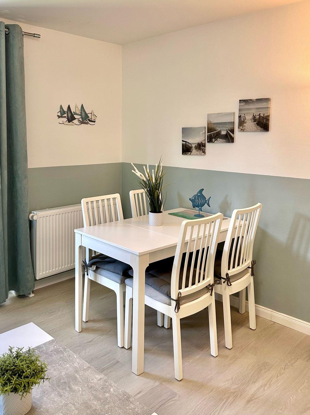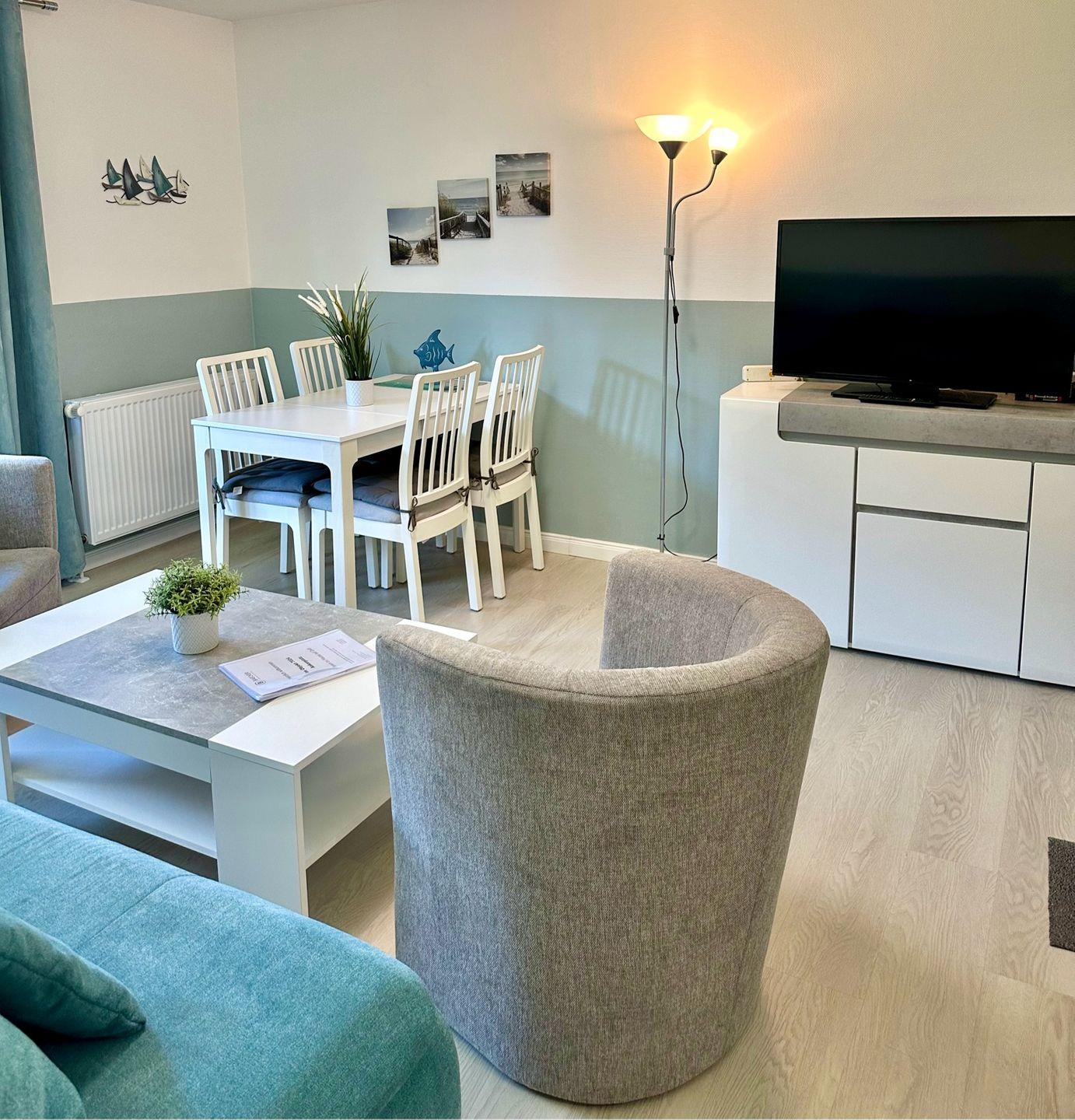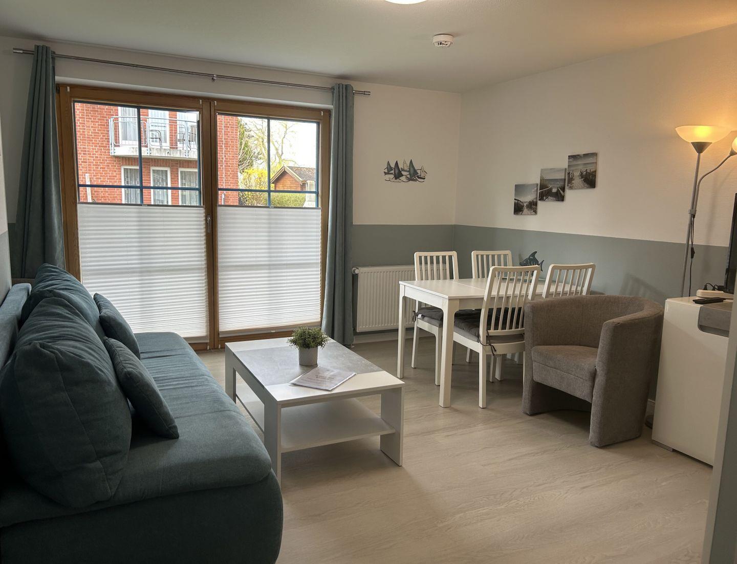 Die moderne Ferienwohnung in der Ferienanlage Domicil im idyllischen Ostseebad Dahme lädt zu einem erholsamen Aufenthalt ein. Im Erdgeschoss gelegen, bietet sie ein stilvolles Wohn- und Esszimmer mit einer gemütlichen Schlafcouch für zwei Personen und einem Esstisch mit Sitzgelegenheit für 4 Personen. Hier dürfen auch gerne 2 Hunde mit einziehen. Von hier aus gelangt man direkt auf die sonnige und möblierte Terrasse zur Südwestseite, die zum Entspannen einlädt.