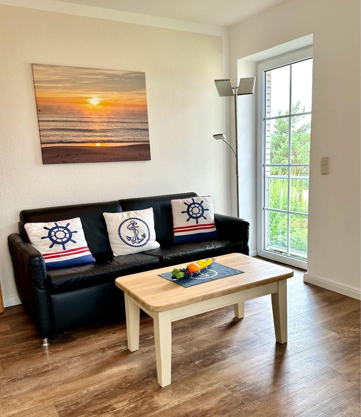 Das Wohnzimmer ist offen gestaltet und bietet durch seine großen Fenster einen herrlichen Panoramablick auf die Ostsee – an klaren Tagen reicht die Sicht sogar bis zur Insel Fehmarn. Der Wohnbereich ist stilvoll mit einem bequemen Ledersofa, einem Esstisch für gemeinsame Mahlzeiten und einem modernen Sat-TV ausgestattet. Das separate Schlafzimmer - ebenfalls mit sensationellem Blick auf die Ostsee - verfügt über ein komfortables Doppelbett, Nachttische, einen geräumigen Kleiderschrank mit Spiegel und einen direkten Zugang zum Balkon zur Westseite, sodass Sie den Tag mit Meeresrauschen beginnen und ausklingen lassen können.