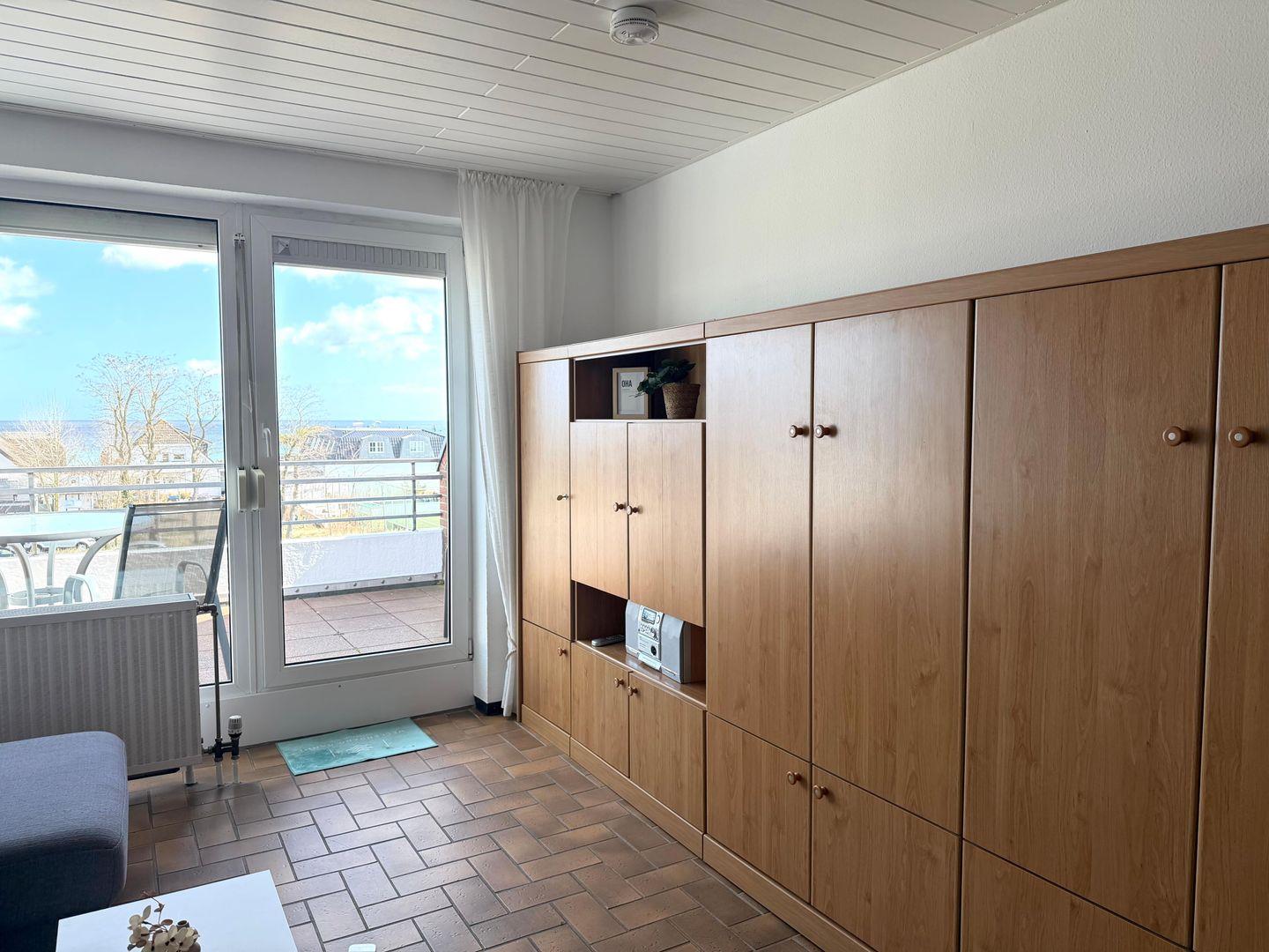 Im hellen Wohnzimmer mit großem Fenster zur Ostsee genießen Sie den freien Blick auf das Meer. Hier erwarten Sie: