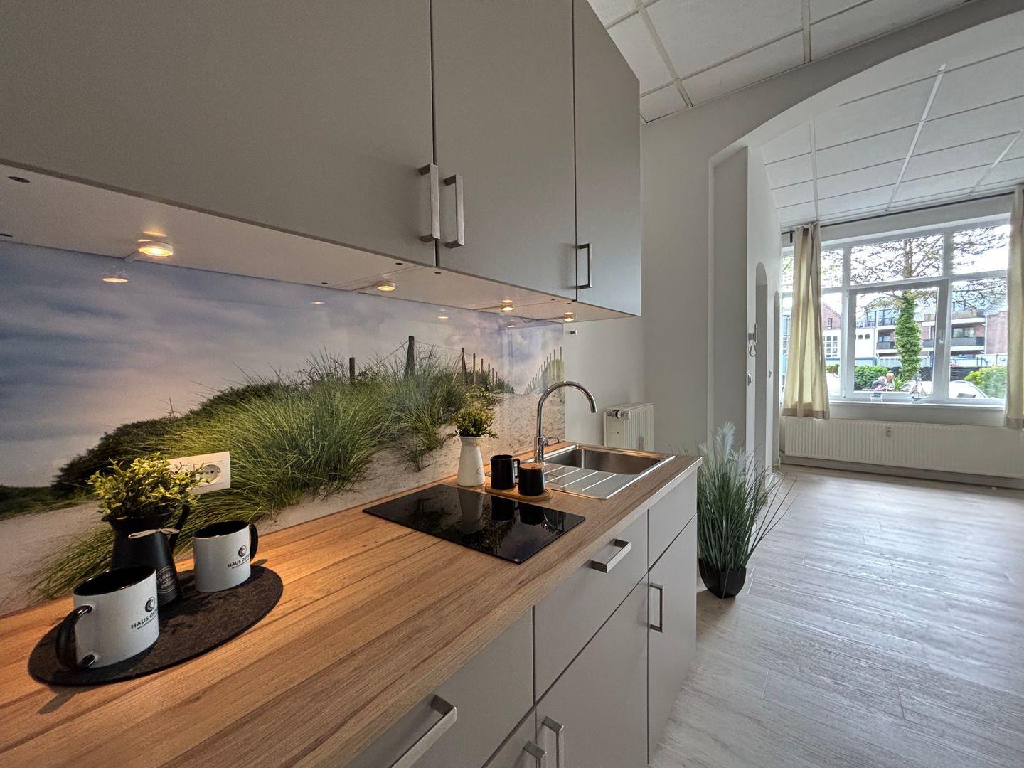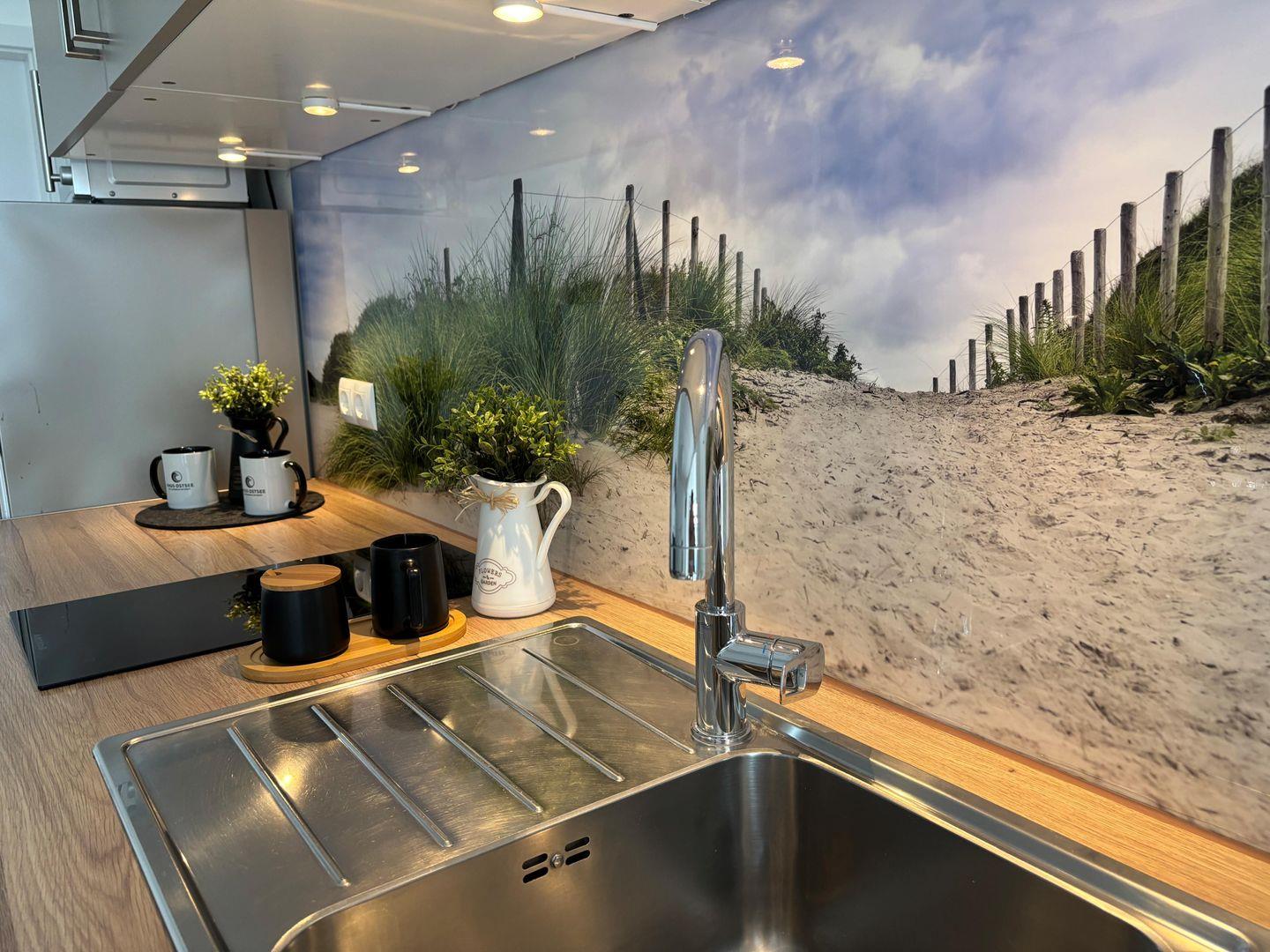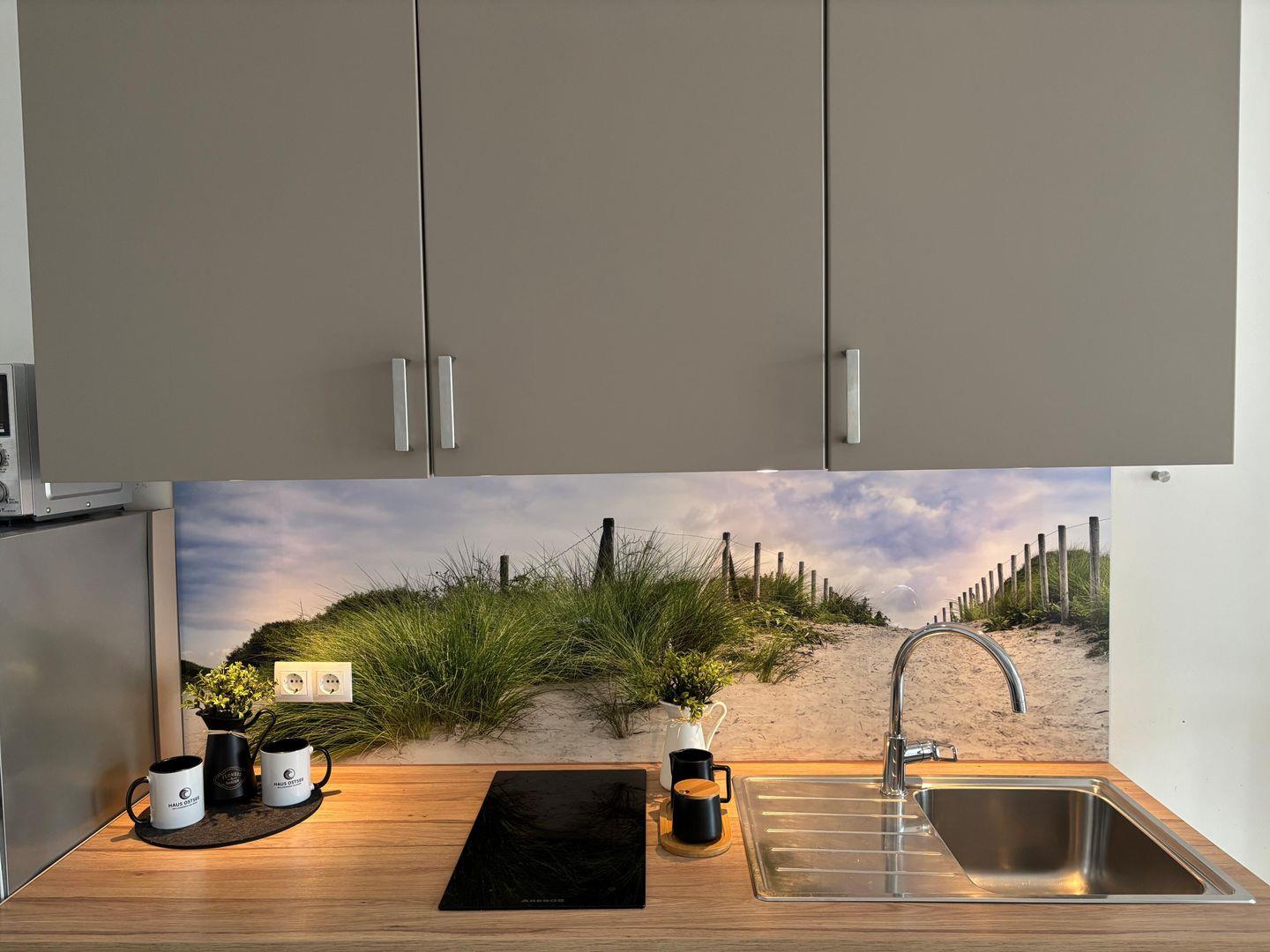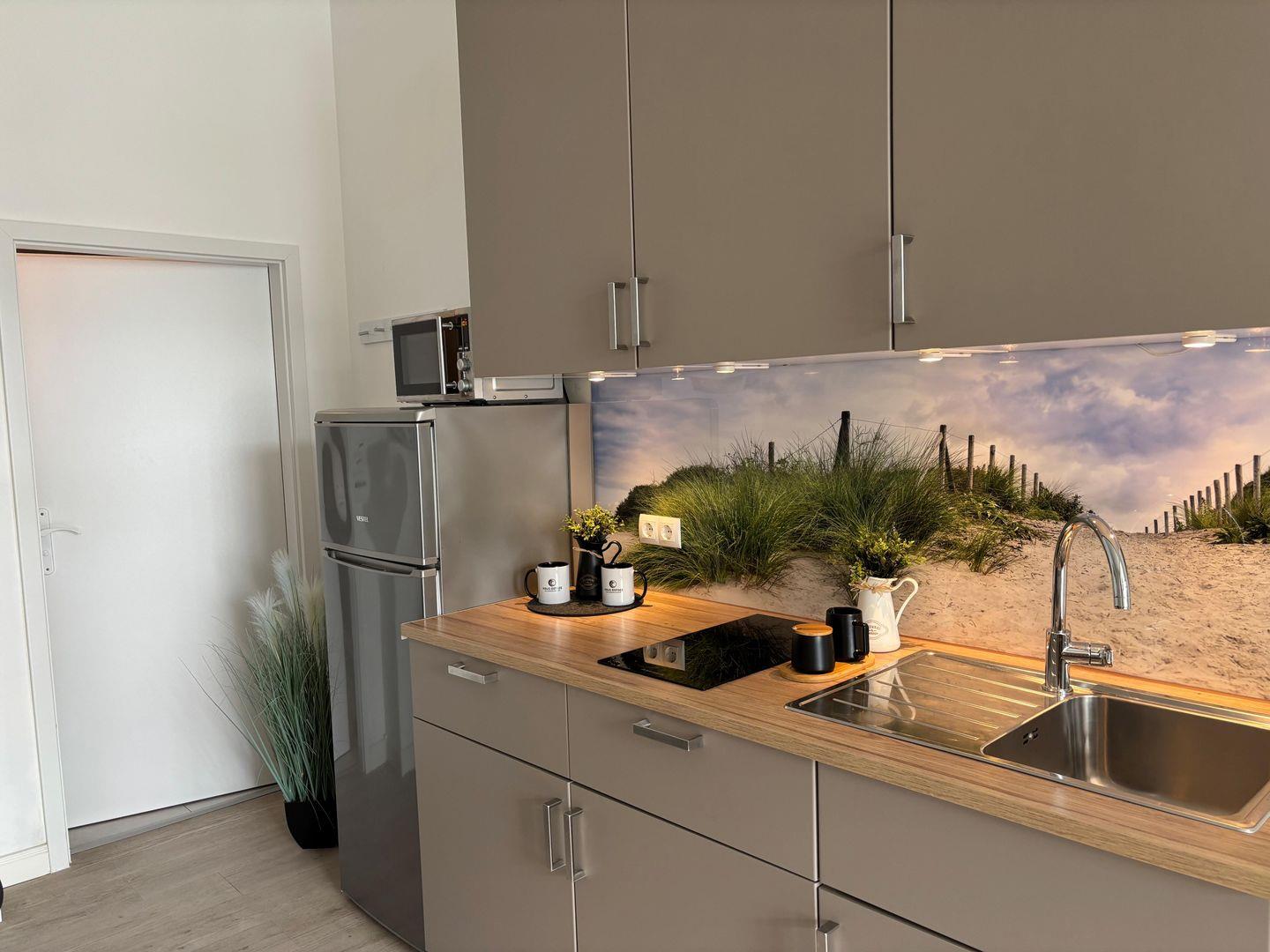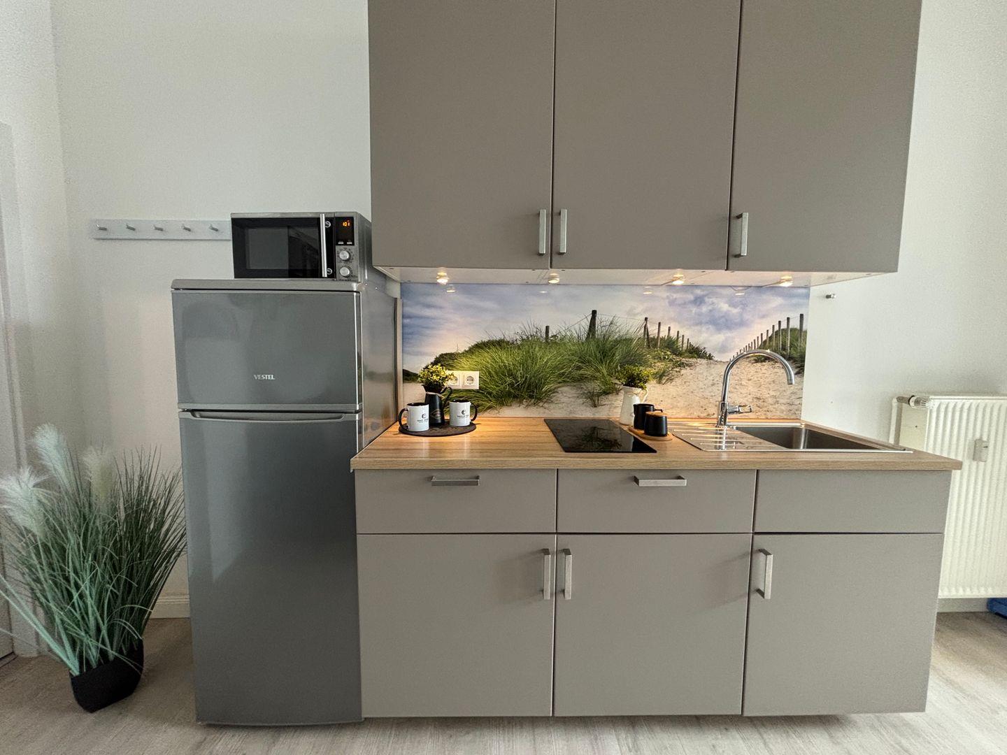 Ceranfeld mit 4 Kochzonen. Kaffeemaschine. Toaster. Eierkocher. Mikrowelle.