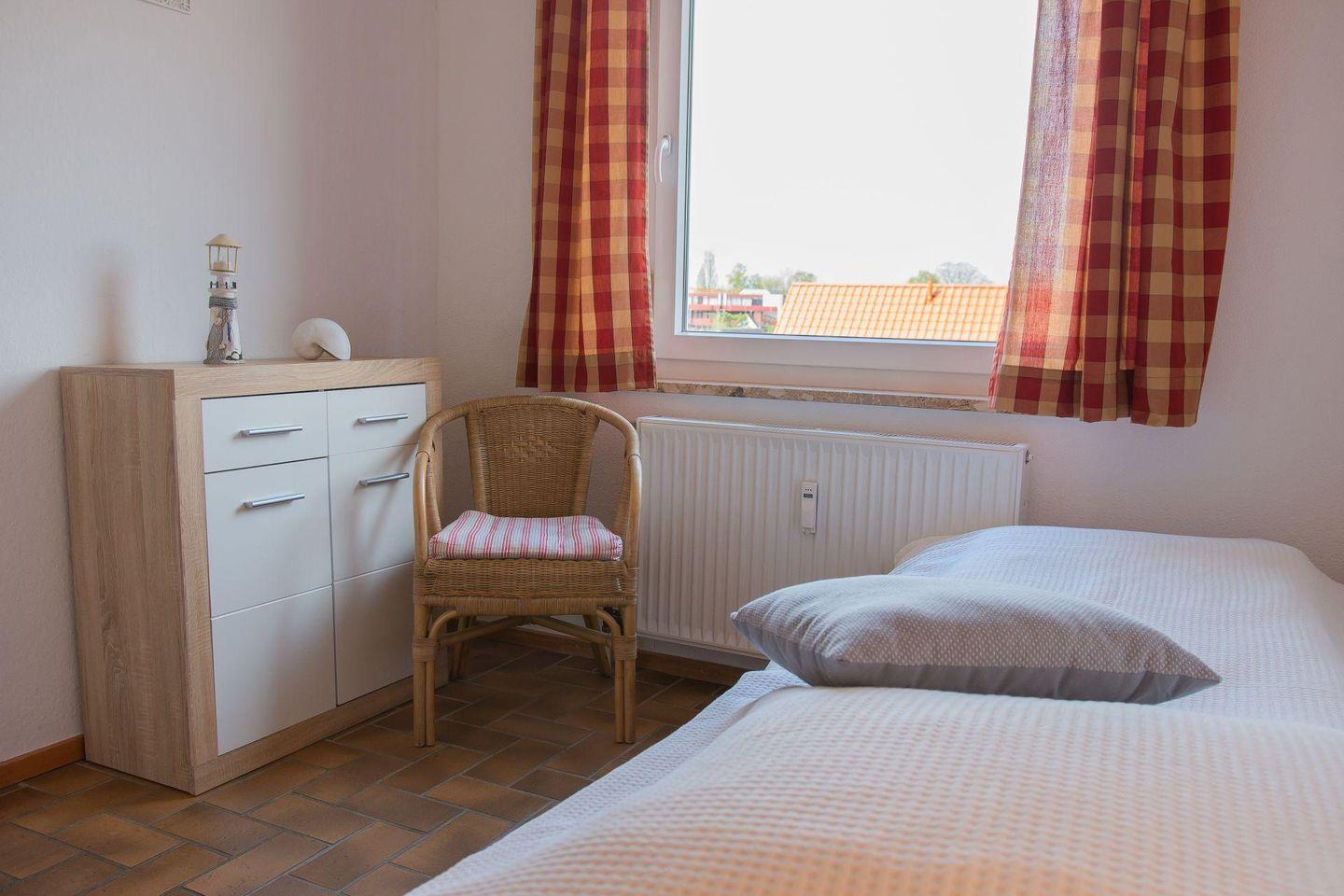 - Schlafzimmer mit zwei über Eck stehenden Einzelbetten