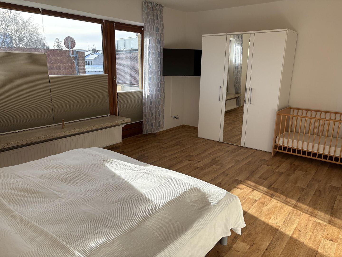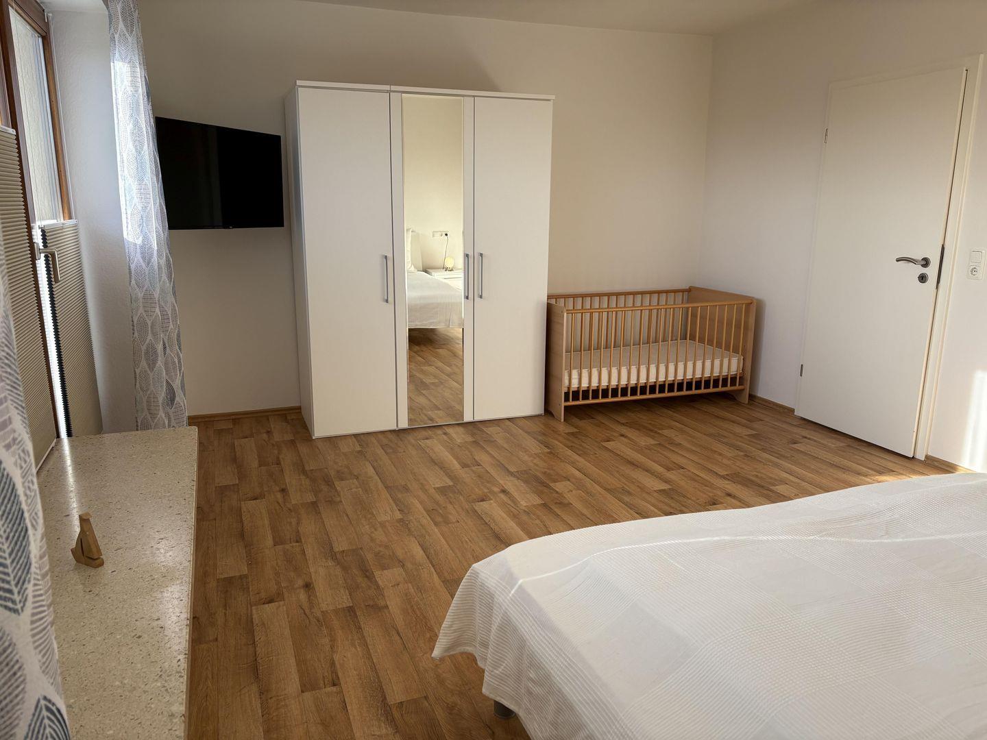 - ein Schlafzimmer mit Doppelbett und Gitterbett für das "Kleinste"