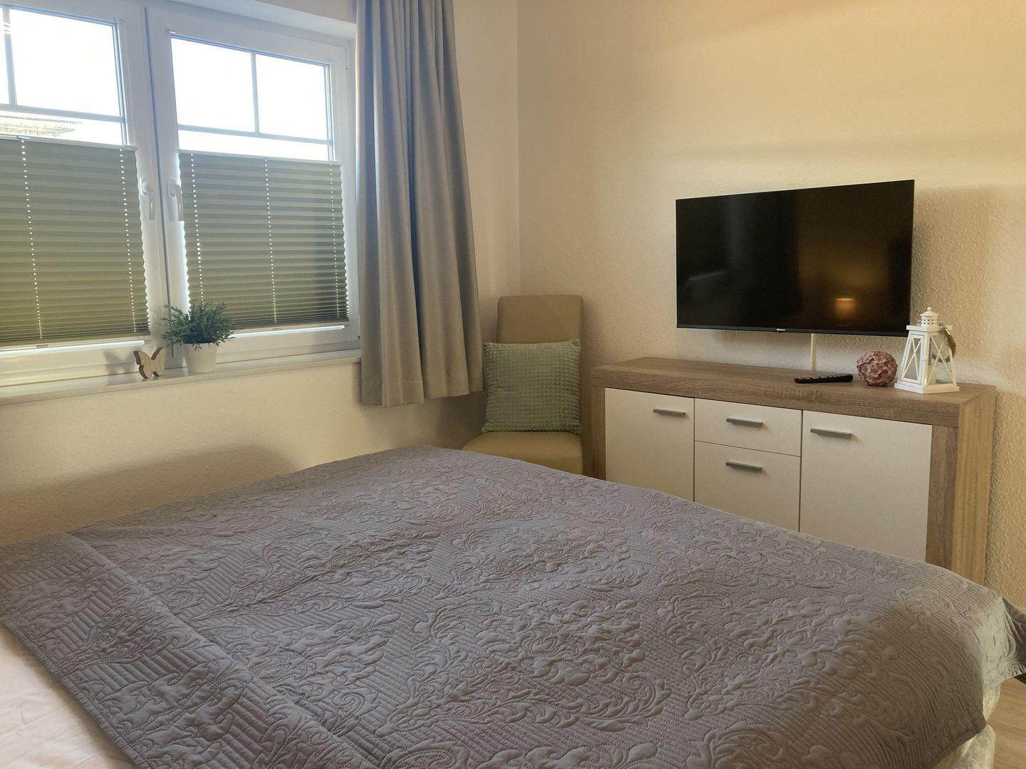 - Schlafzimmer mit Doppelbett, Kleiderschrank und TV