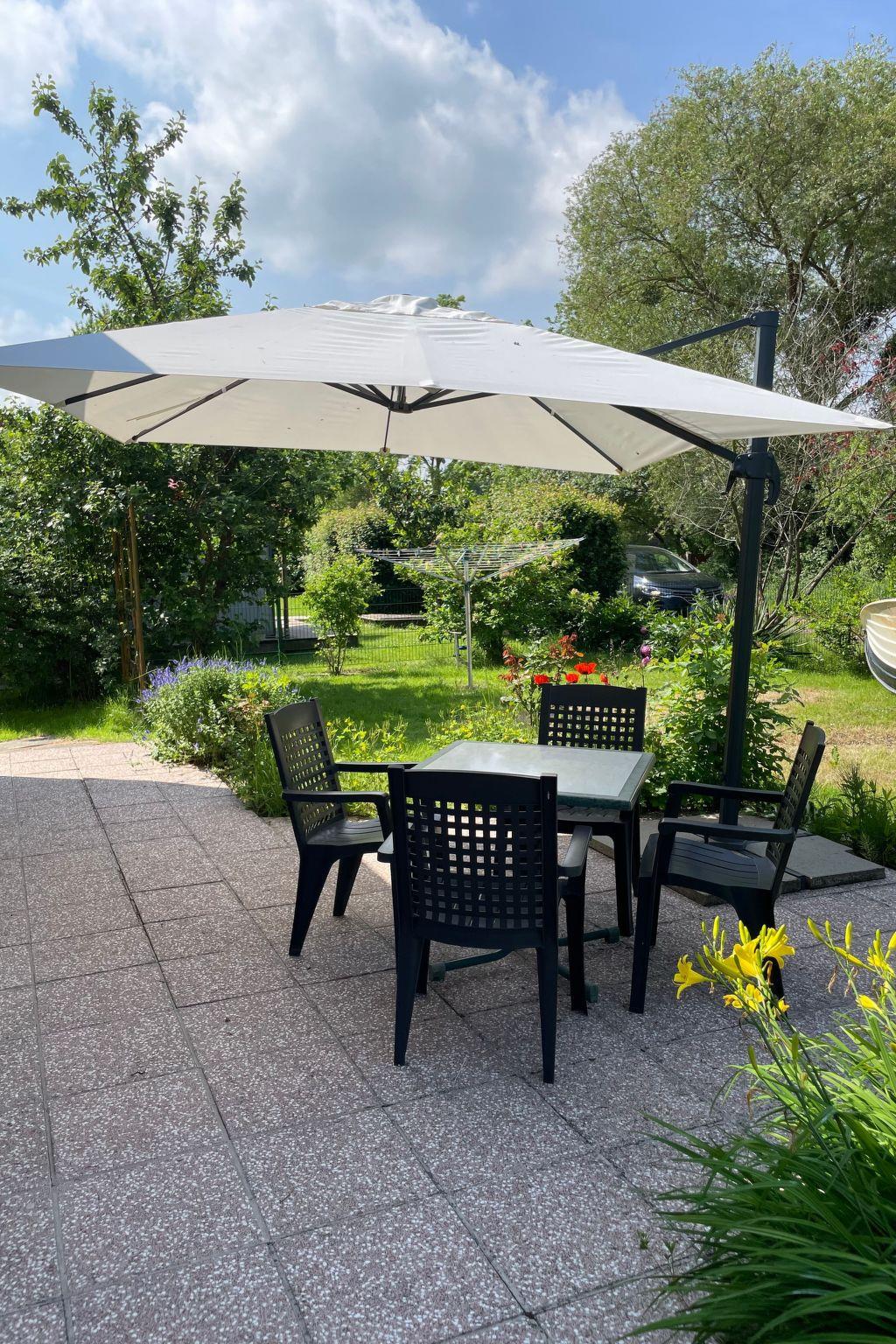 Terrace with garden furniture and parasol.sun loungers are available.charcoal grill is available.rotary dryer