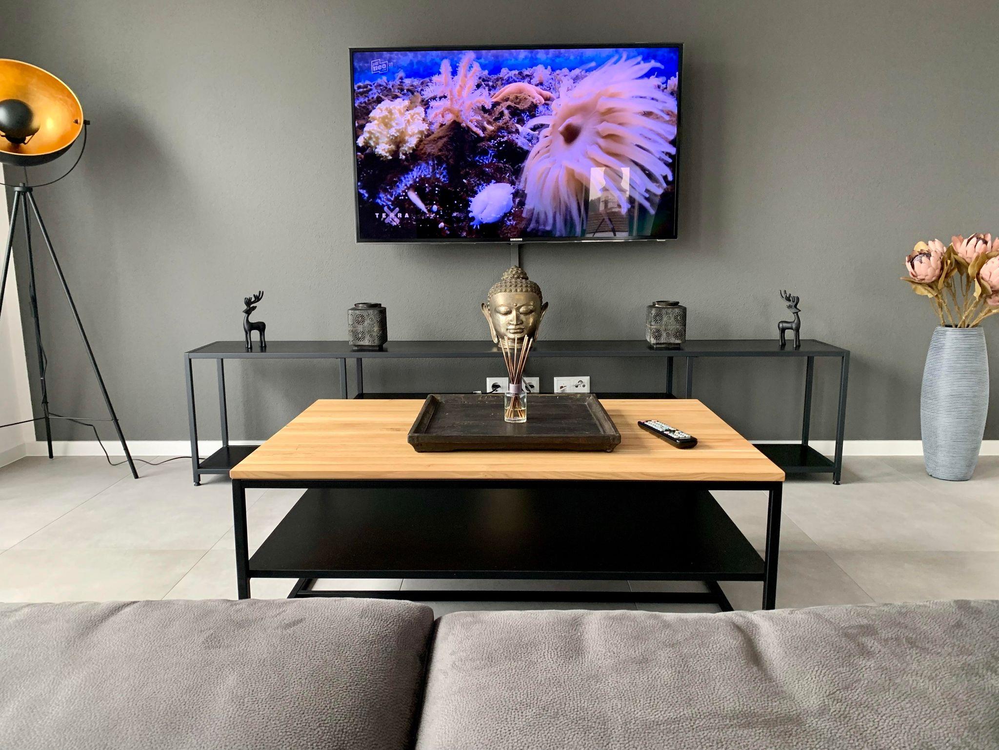 ausgestattete Küche, der Essplatz sowie der Wohnbereich mit TV.