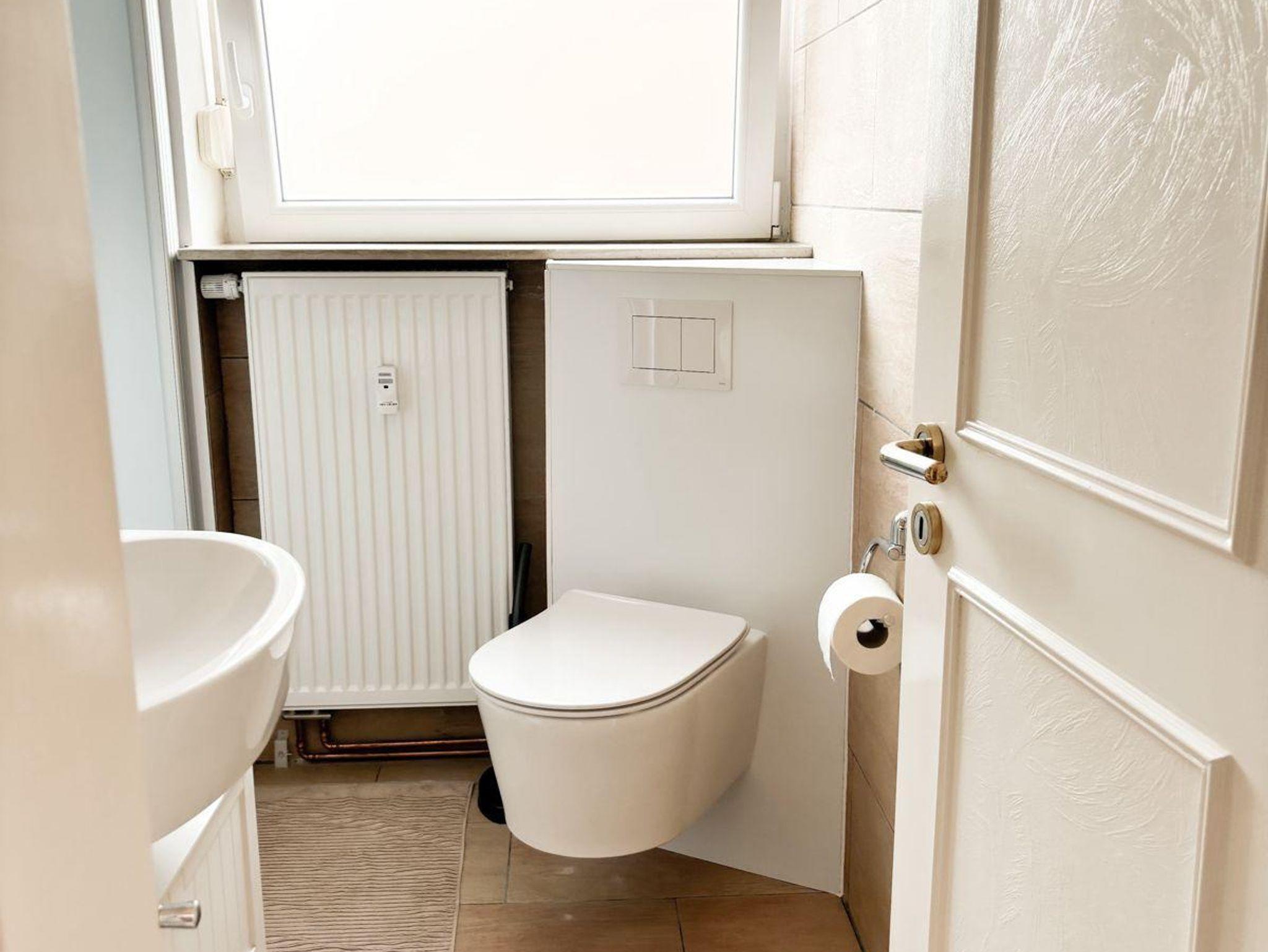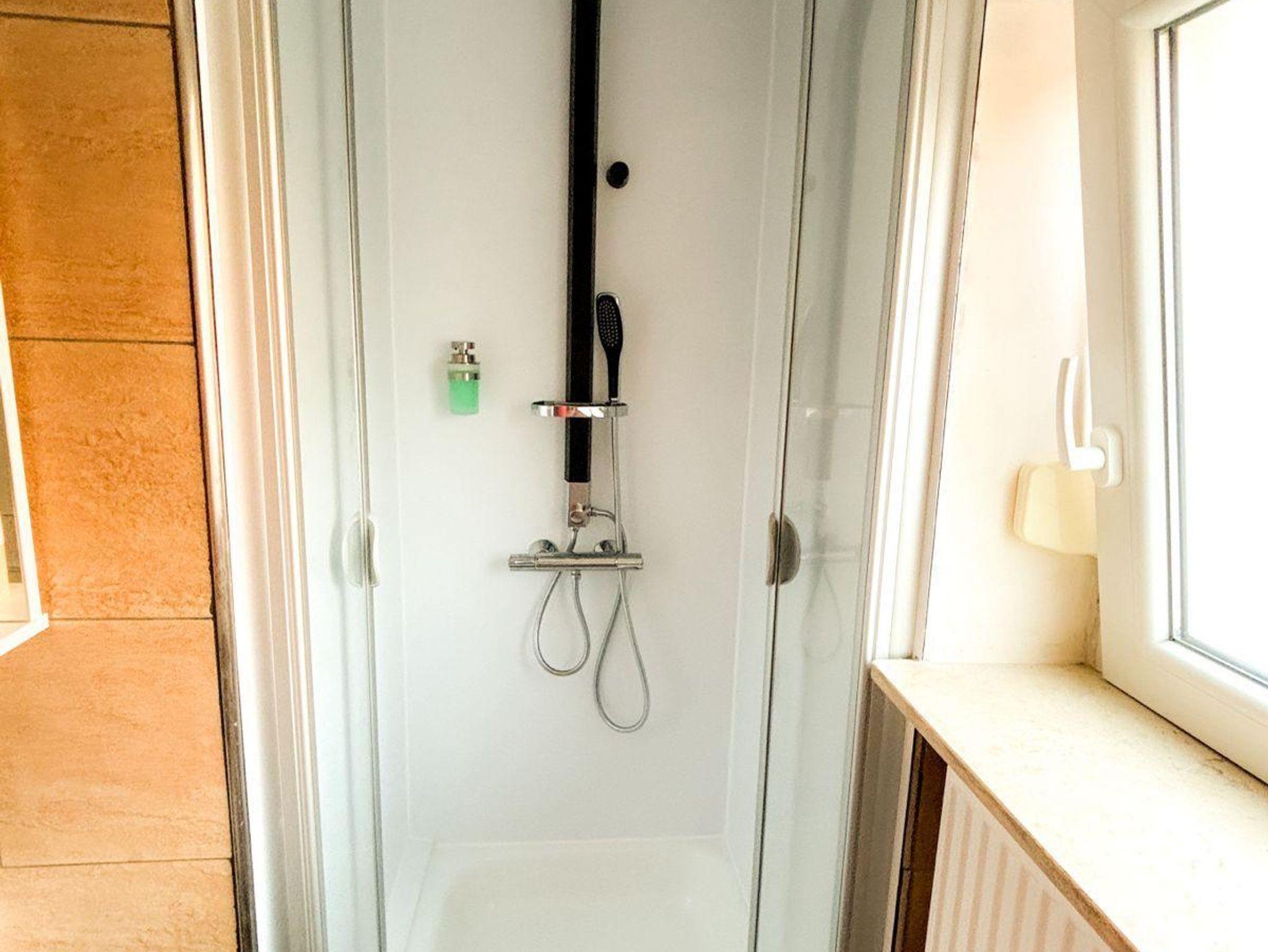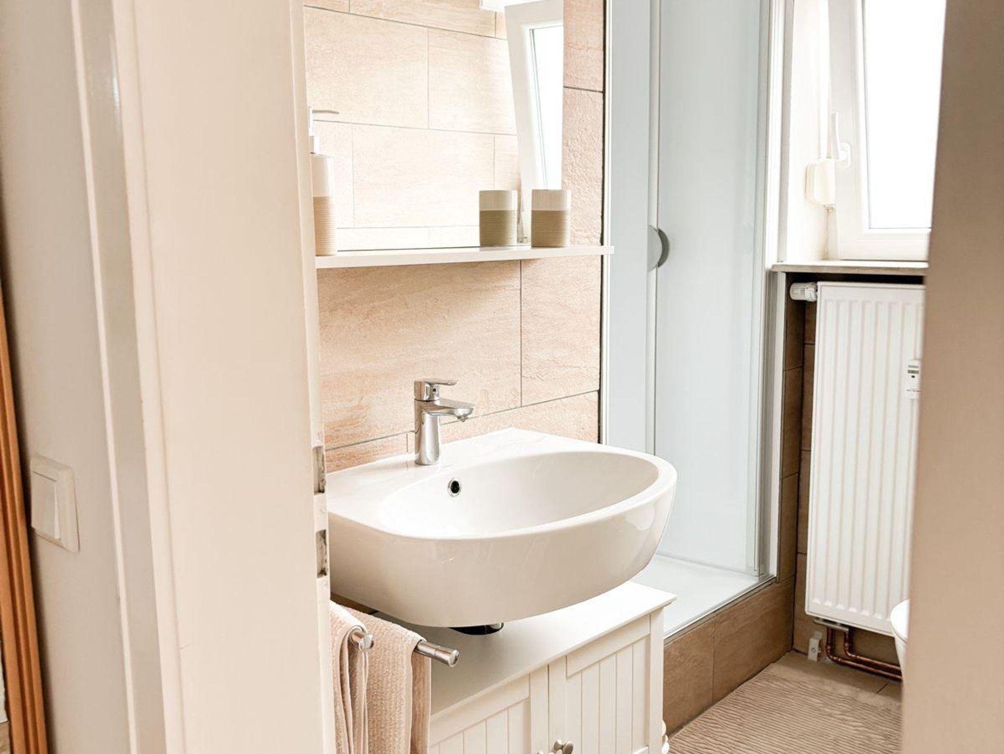 Das Badezimmer schließt ebenfalls an das Schlafzimmer an. Die Dusche ist frisch renoviert und verfügt neben einer Handbrause auch über eine Regendusche. Im Badezimmerschrank befindet sich ein Fön. Seife und Duschgel werden ebenfalls gestellt.