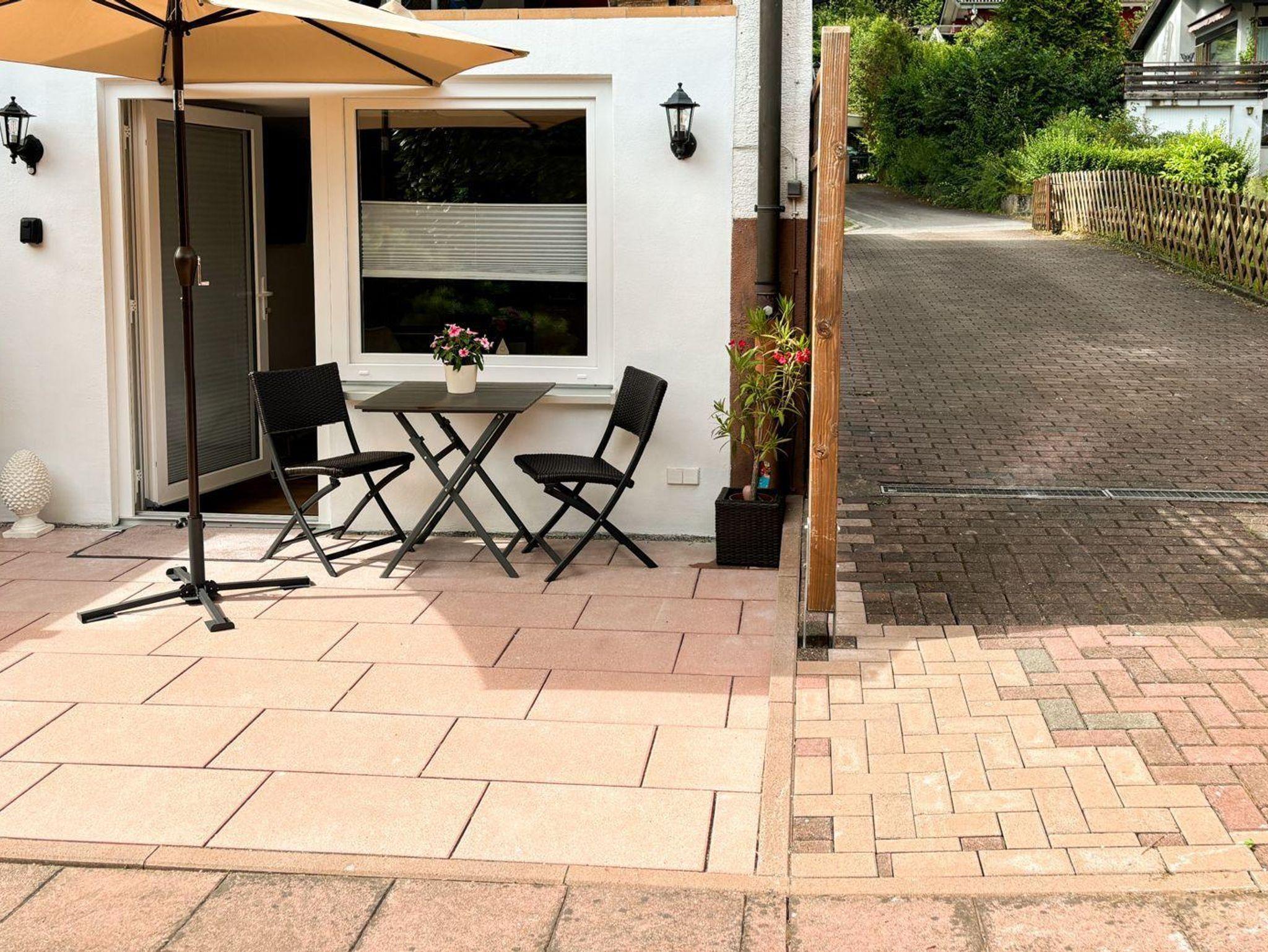 Die 15m2 große Terrasse ist mit zwei Stühlen, einem Tisch und einem Sonnenschirm mit LED ausgestattet. Die Terrasse mit Südausrichtung nimmt jeden Sonnenstrahl mit. Dort können Sie geschützt am morgen eine Tasse Kaffee trinken, ein Buch lesen oder abends ein Glas Wein aus den guten Dubbegläsern genießen.
