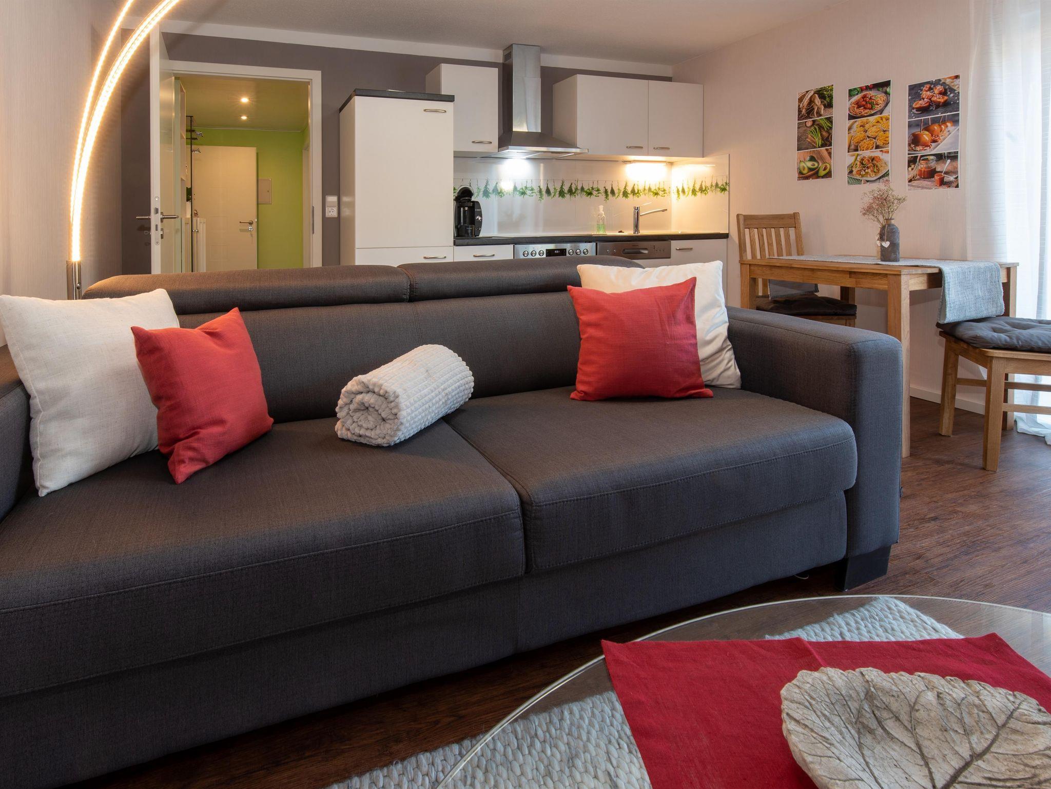 Die Küchenzeile ist ausgestattet mit einem Kühlschrank mit Gefrierfach, einem 4 Platten-Cerankochfeld, Backofen, Kaffeemaschine und Spülmaschine. Für den Erstgebrauch sind Kaffeepads, Milch und Zucker vorhanden, ebenfalls einfache Gewürze, Essig und Öl. Im Wohnbereich befinden sich eine gemütliche Couch und ein SAT-TV.