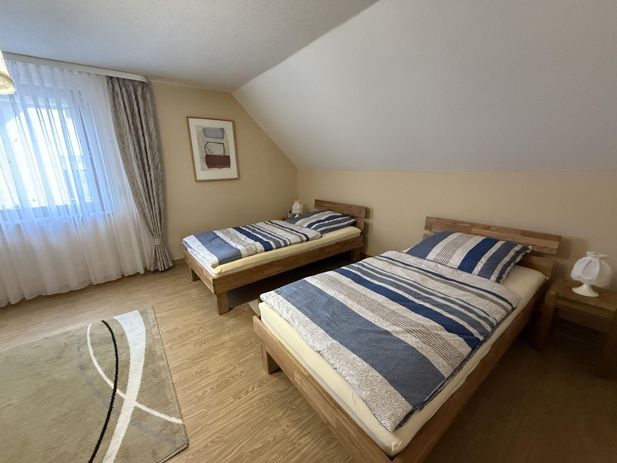 Über eine Treppe erreichen Sie das Obergeschoß. Hier finden Sie ein weiteres Schlafzimmer mit 2 Einzelbetten sowie ein Durchgangszimmer, welches auch als Spielzimmer für Kinder genutzt werden kann. Hier steht eine Schlafcouch für eine 5 Person zur Verfügung (auf Anfrage).