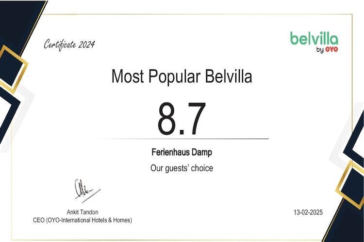 Koselig innredet røykfritt telttakhus med plass til 6 personer i ferieområdet til det populære feriestedet Damp ved Kielbukta. I tillegg til et fullt utstyrt kjøkken - inkludert vaskemaskin - og et dusjrom, er huset utstyrt med peis og en koselig sittegruppe. Interiøret ble utstyrt med ekte treparkett og fliser. Til trappen er det festet barnesikring som er laget antiskli med teppefliser. I tillegg inneholder huset barnevennlig utstyr, inkludert reiseseng og barnestol. Huset har en stor hage som byr på god plass å leke. En liten overbygd terrasse rett ved huset og en ekstra terrasse, som er svært egnet for grilling, fullfører tilbudet av dette innbydende feriehuset. Stranden og havnen ligger kun 600 meter fra den redesignede ferieparken Damp, som ligger på en av de vakreste strendene i Østersjøen. Det er en parkeringsplass for en bil foran huset og sykler kan også parkeres der. Mot en ekstra avgift kan du bruke de varierte og spennende fasilitetene, som for eksempel sjøvannsbassenget og velværeområdet i feriesenteret i nærheten. Det finnes også en innendørs lekeplass, en bowlinghall, et vannskianlegg og en minigolfbane mot en ekstra avgift. Ostseebad Damp ligger 16 km nordøst for Eckernfoerde på Schwansen-halvøya, mellom Eckernfoerder-bukten og Schlei. Damp ligger rett ved den vakre, 4 km lange sandstranden. Det er også en actionstrand med spill, en hundestrand og en nudiststrand. Strandstoler kan leies på stedet. Det er omtrent 50 km til delstatshovedstaden Schleswig-Holstein, Kiel. Aktiviteter i nærheten: Moro for hele familien er garantert ved et besøk til det fuktige oppdagelsesbassenget, hvor barn er velkomne gjester, med utsikt over Østersjøen. Fra en enorm begivenhetssklie med lysprojeksjon over badstulandskapet, Sa