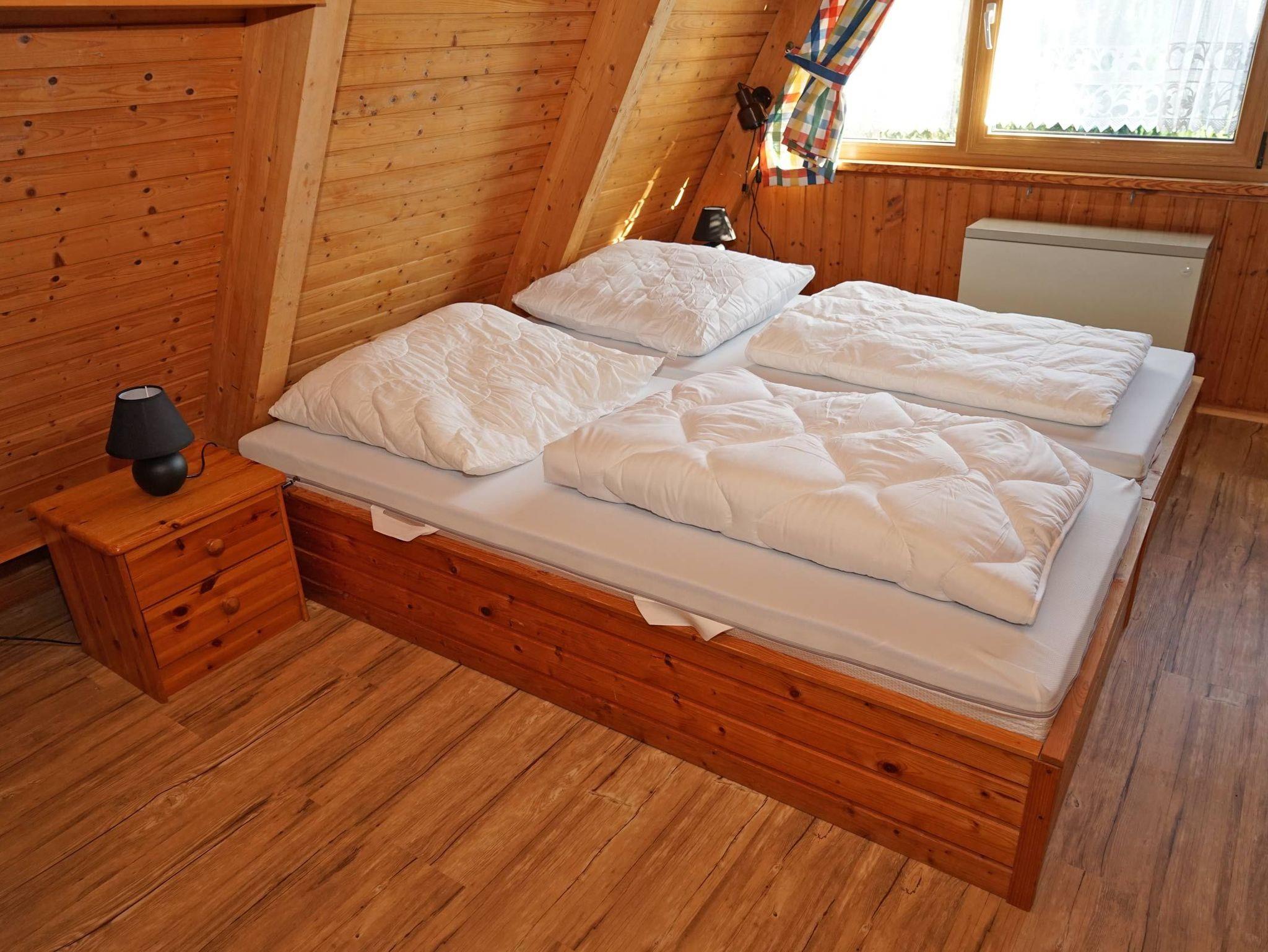 Das Zeltdachhaus verfügt über zwei getrennte Schlafräume (im oberen Bereich des Hauses), kombiniertes Wohn- und Esszimmer, vollwertige Küche und Terrasse. Ein Kinderreisebett und Kinderhochstuhl sind immer vorhanden und kostenlos nutzbar.