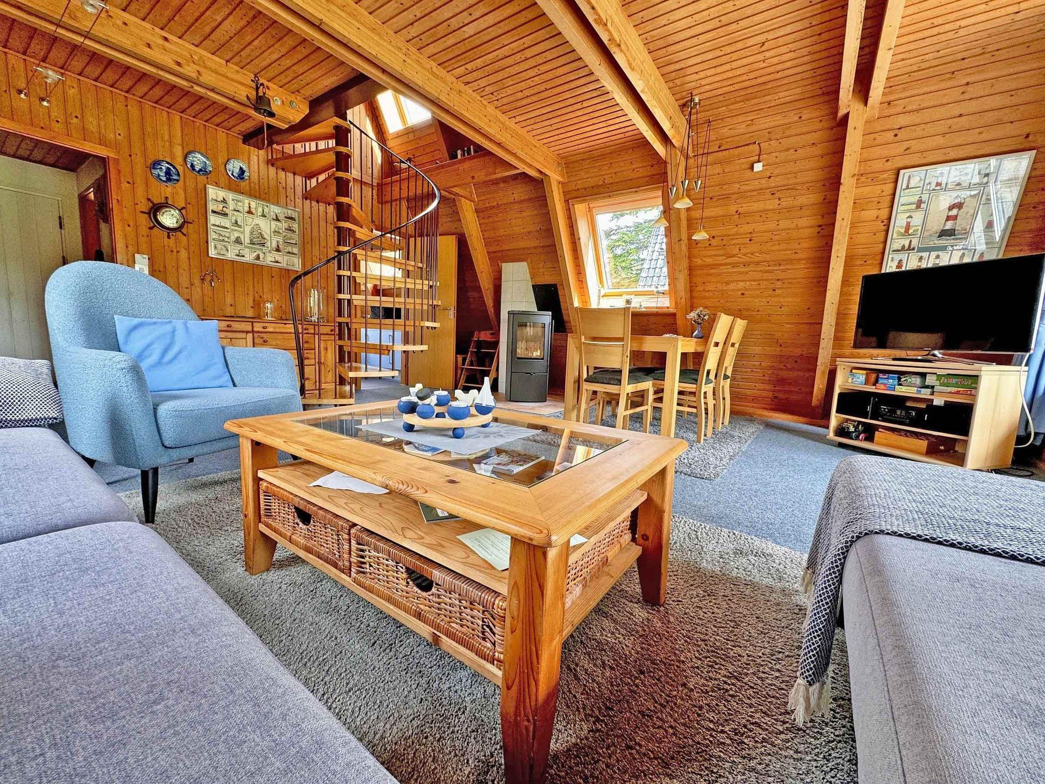 Das Zeltdachhaus verfügt über zwei getrennte Schlafräume (im oberen Bereich des Hauses), kombiniertes Wohn- und Esszimmer, vollwertige Küche und Terrasse. Ein Kinderreisebett und Kinderhochstuhl sind immer vorhanden und kostenlos nutzbar.