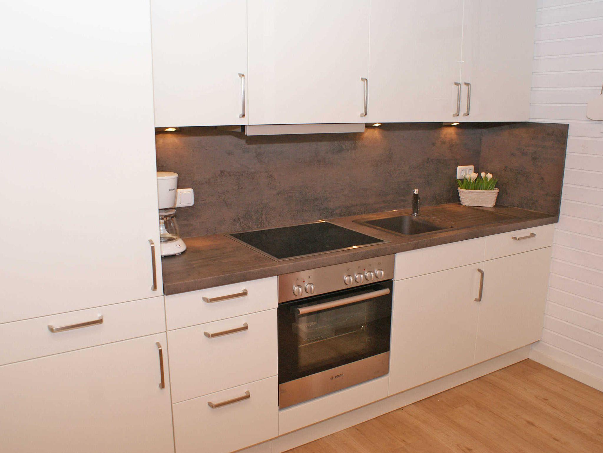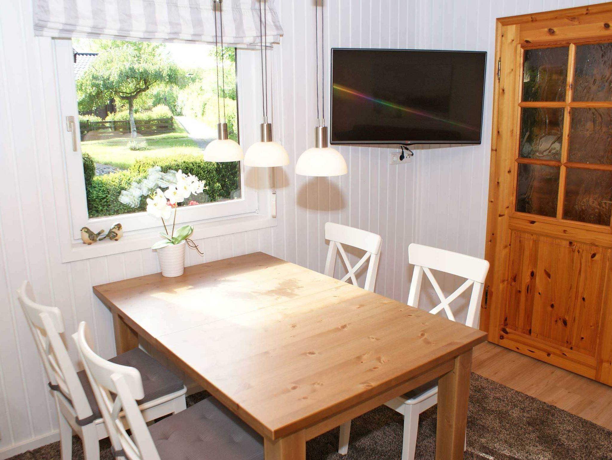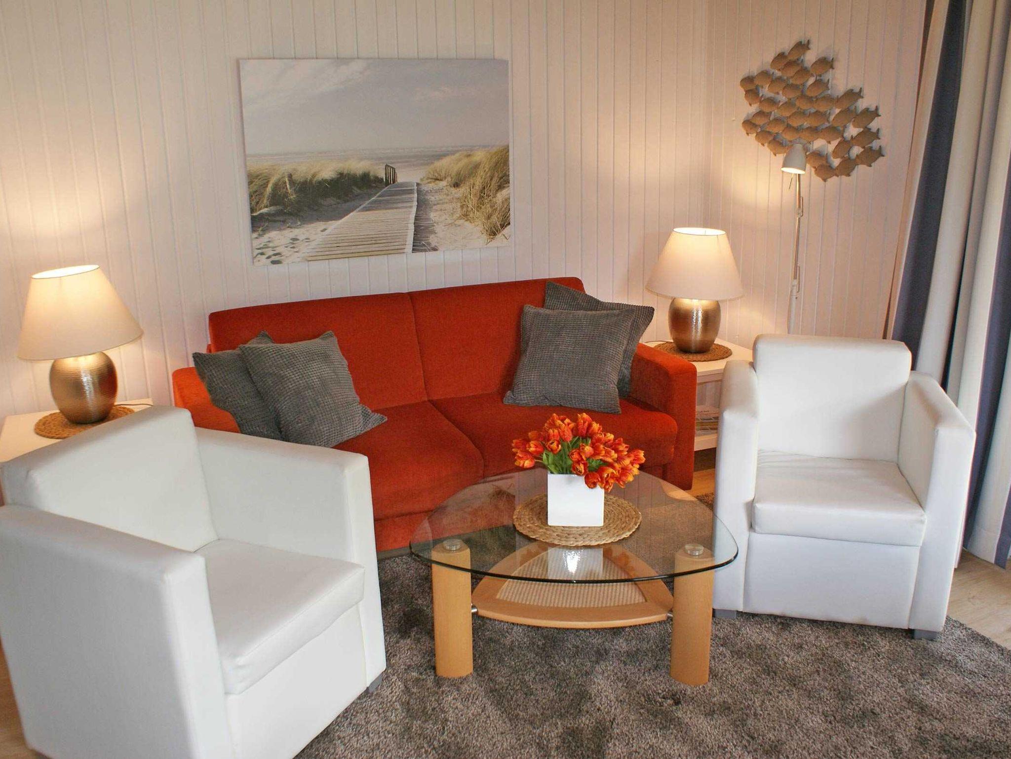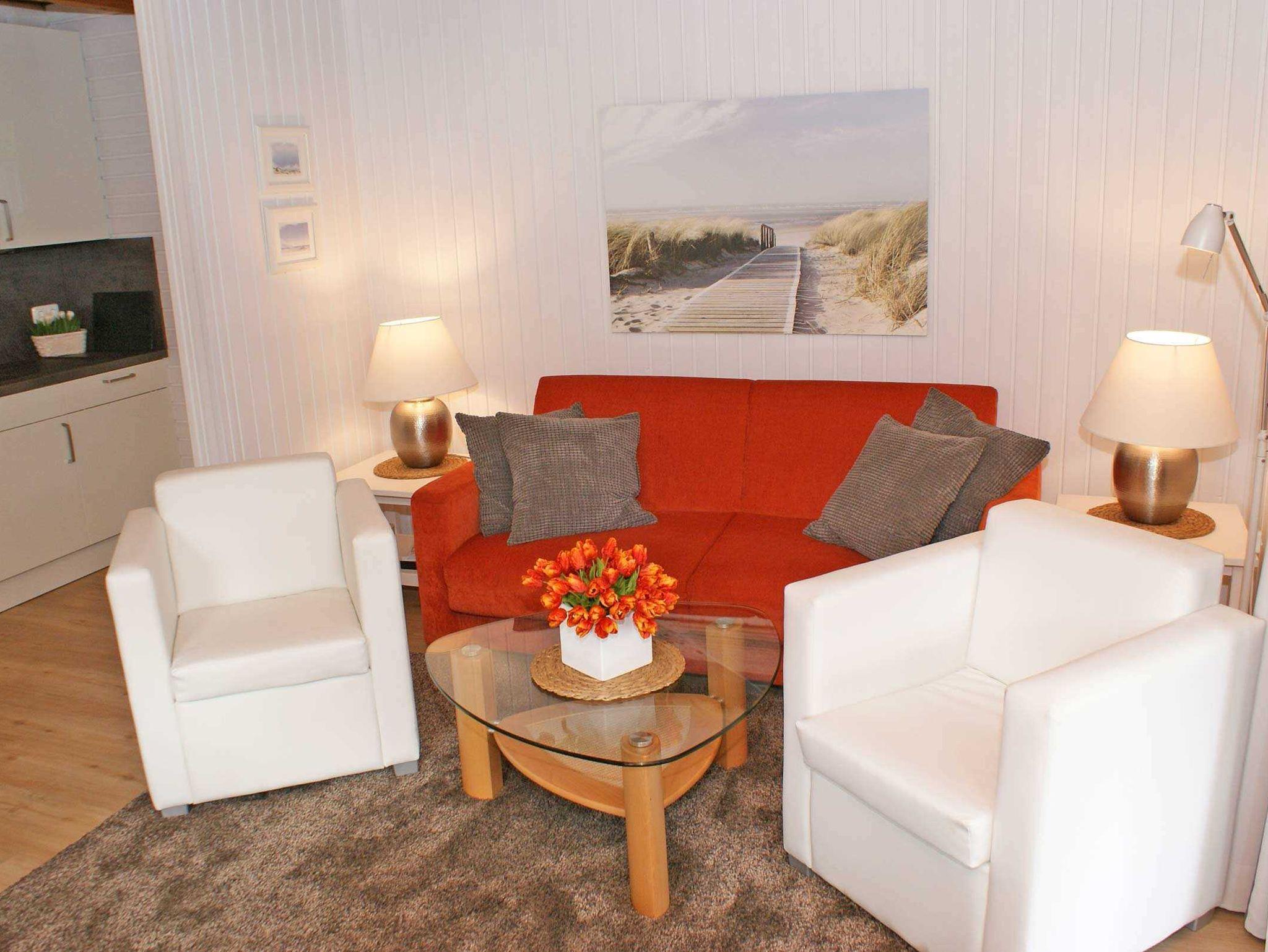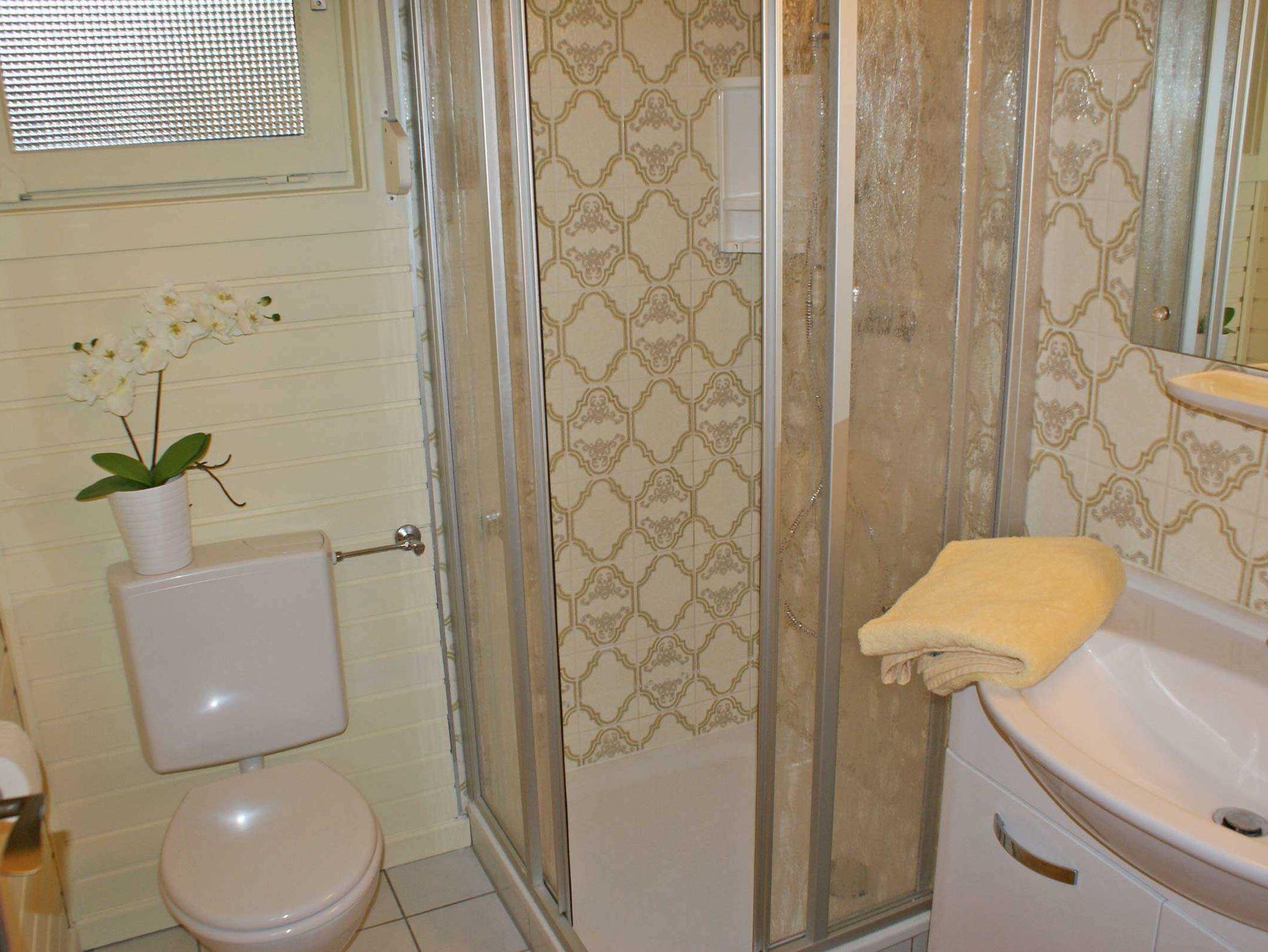 Wohnen auf einer Ebene. Zur Ausstattung gehört eine vollwertige Küche (mit Geschirrspüler), 2 getrennte Schlafzimmer (in einem Schlafzimmer befindet sich ein Etagenbett für 2 Personen), Flur, Bad mit Dusche und Wohnzimmer mit Essecke. Grosse überdachte Terrasse mit Gartenmöbel und Markise.
