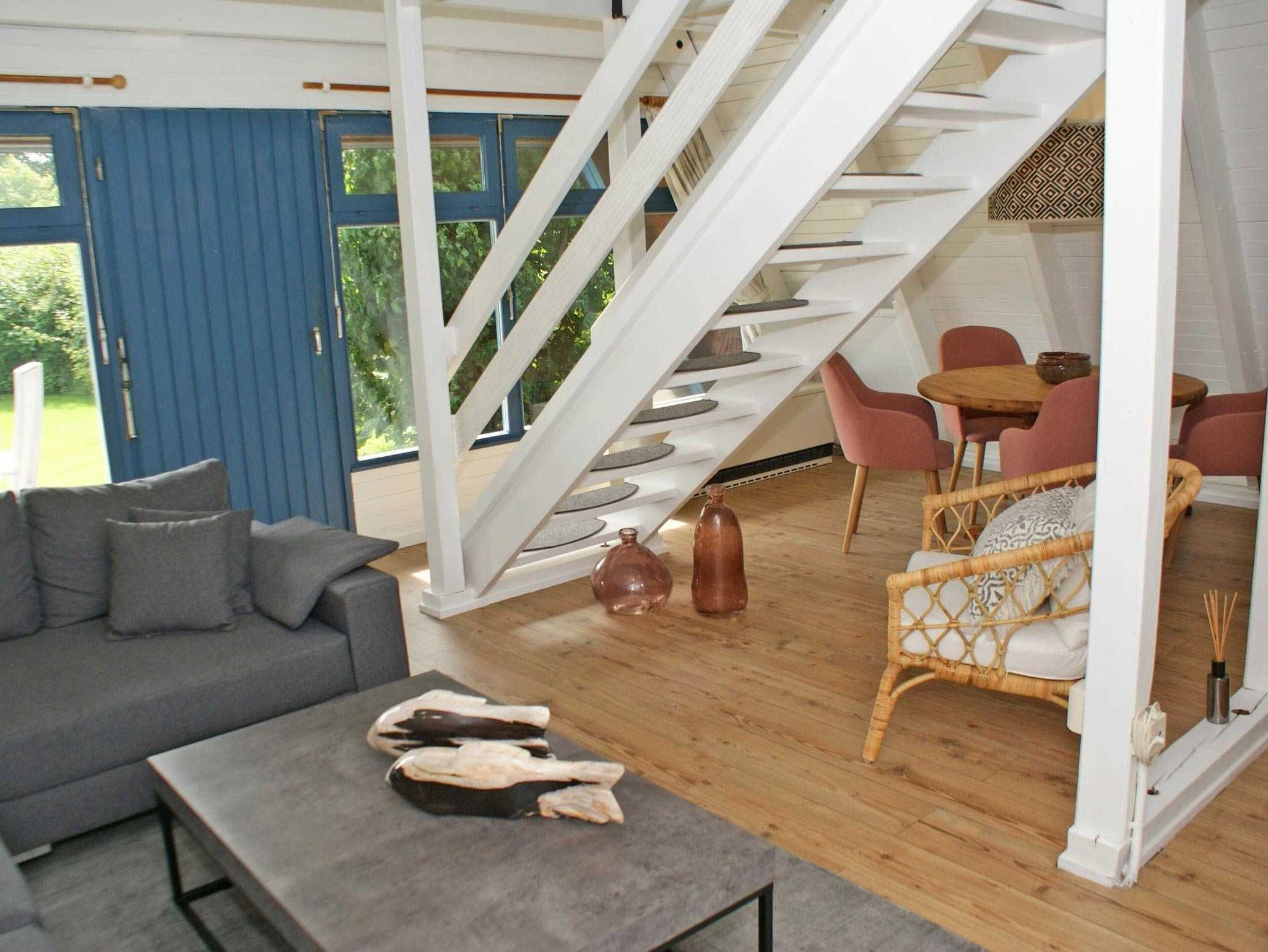 Unser Zeltdachhaus (mit W-LAN) verfügt über zwei getrennte Schlafräume (im oberen Bereich des Hauses), kombiniertes Wohn- und Esszimmer, vollwertige Küche und Terrasse. Ein Kinderreisebett und Kinderhochstuhl sind immer vorhanden und kostenlos nutzbar.