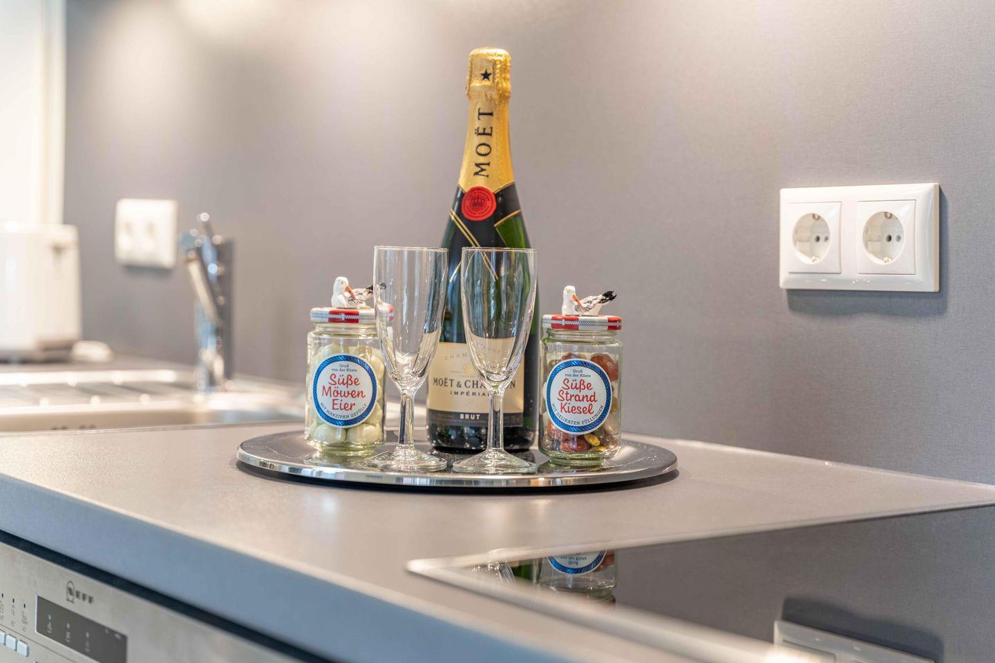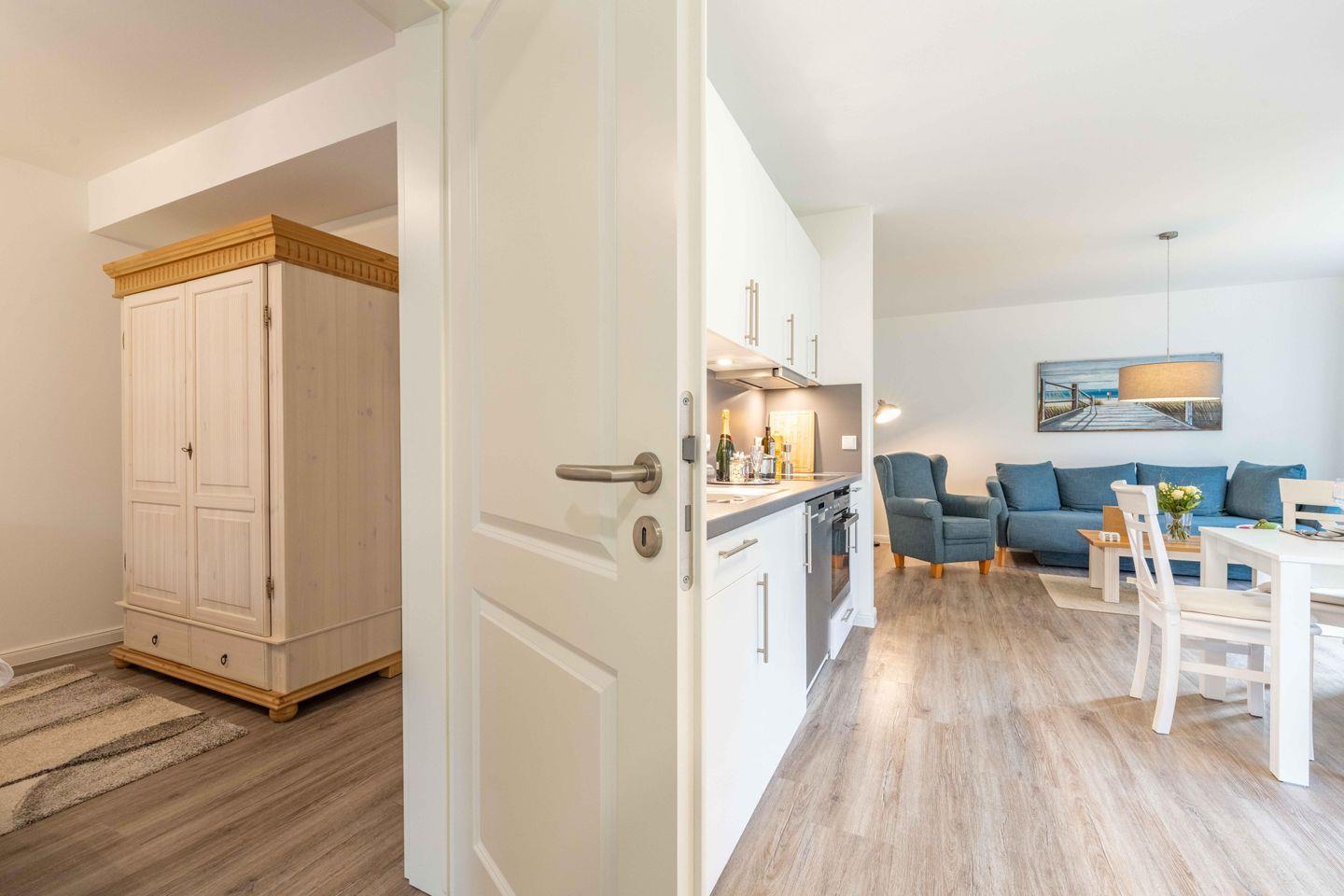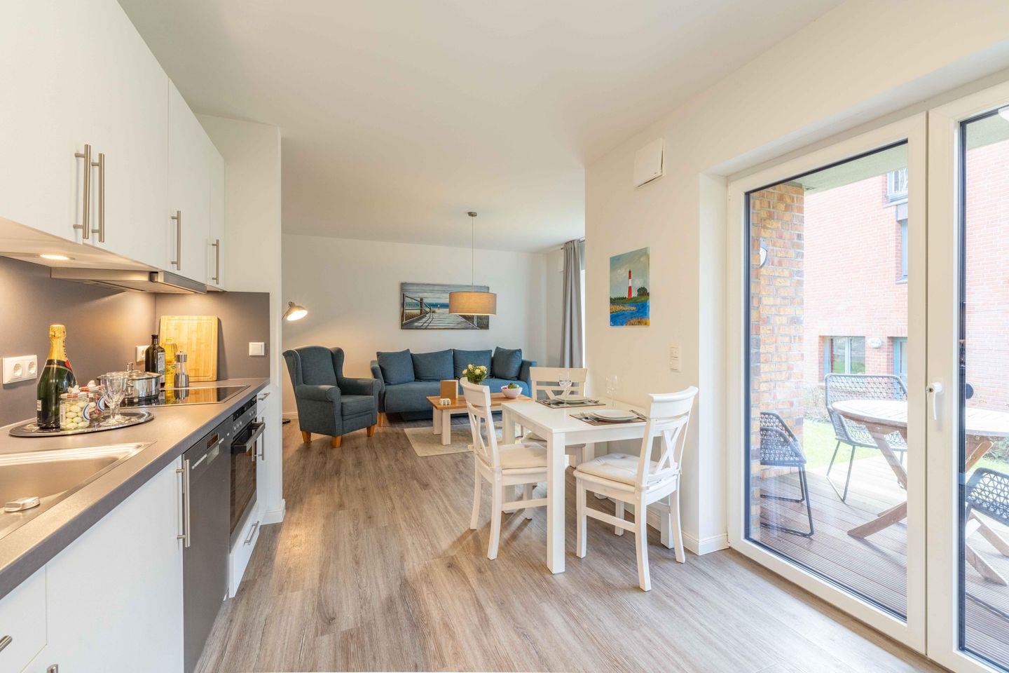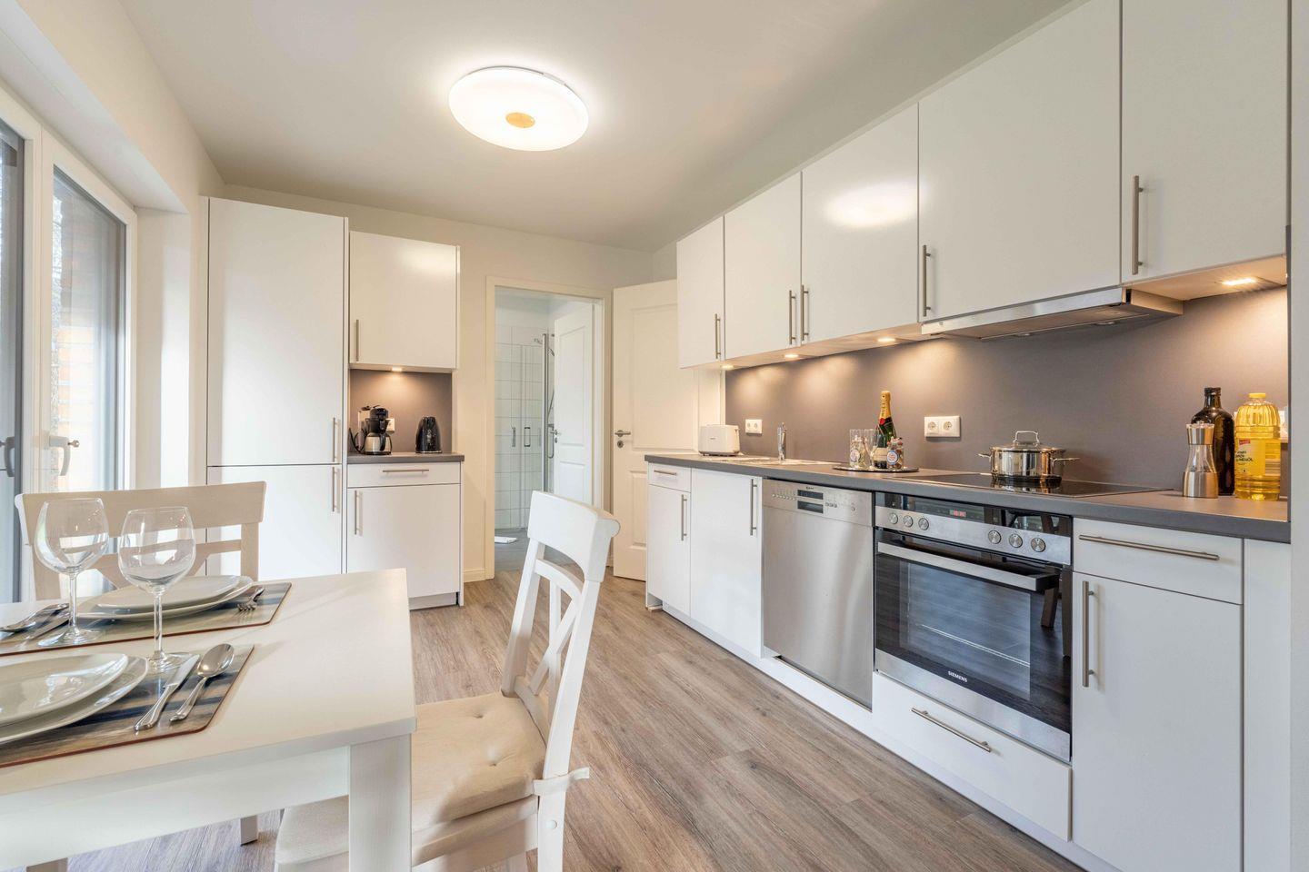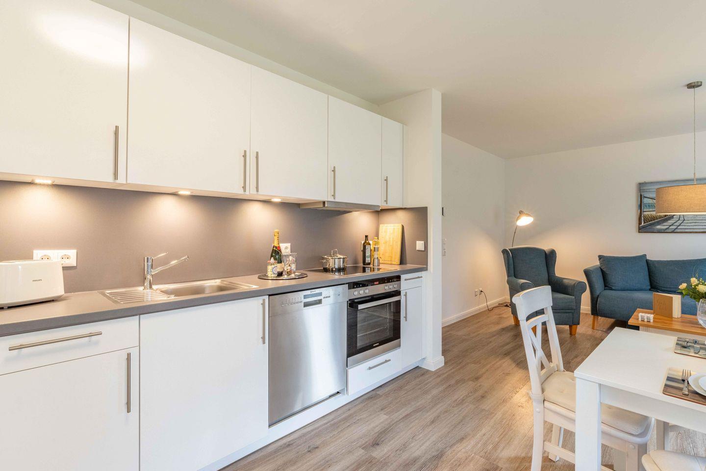 Die hochwertige Ausstattung der Ferienwohnung lässt keine Wünsche offen. Eine vollständig eingerichtete, offene Küche, die direkt in den Wohnbereich übergeht, verfügt unter anderem über einen Backofen, Geschirrspüler, Kühlschrank mit Gefrierfach und zahlreiche Küchengeräte wie eine Kaffeemaschine, einen Wasserkocher, einen Toaster und sogar eine Espressomaschine. Hier können Sie hervorragend selbst für Ihr leibliches Wohl sorgen, während Sie sich in dem gemütlichen Essbereich zusammenfinden.