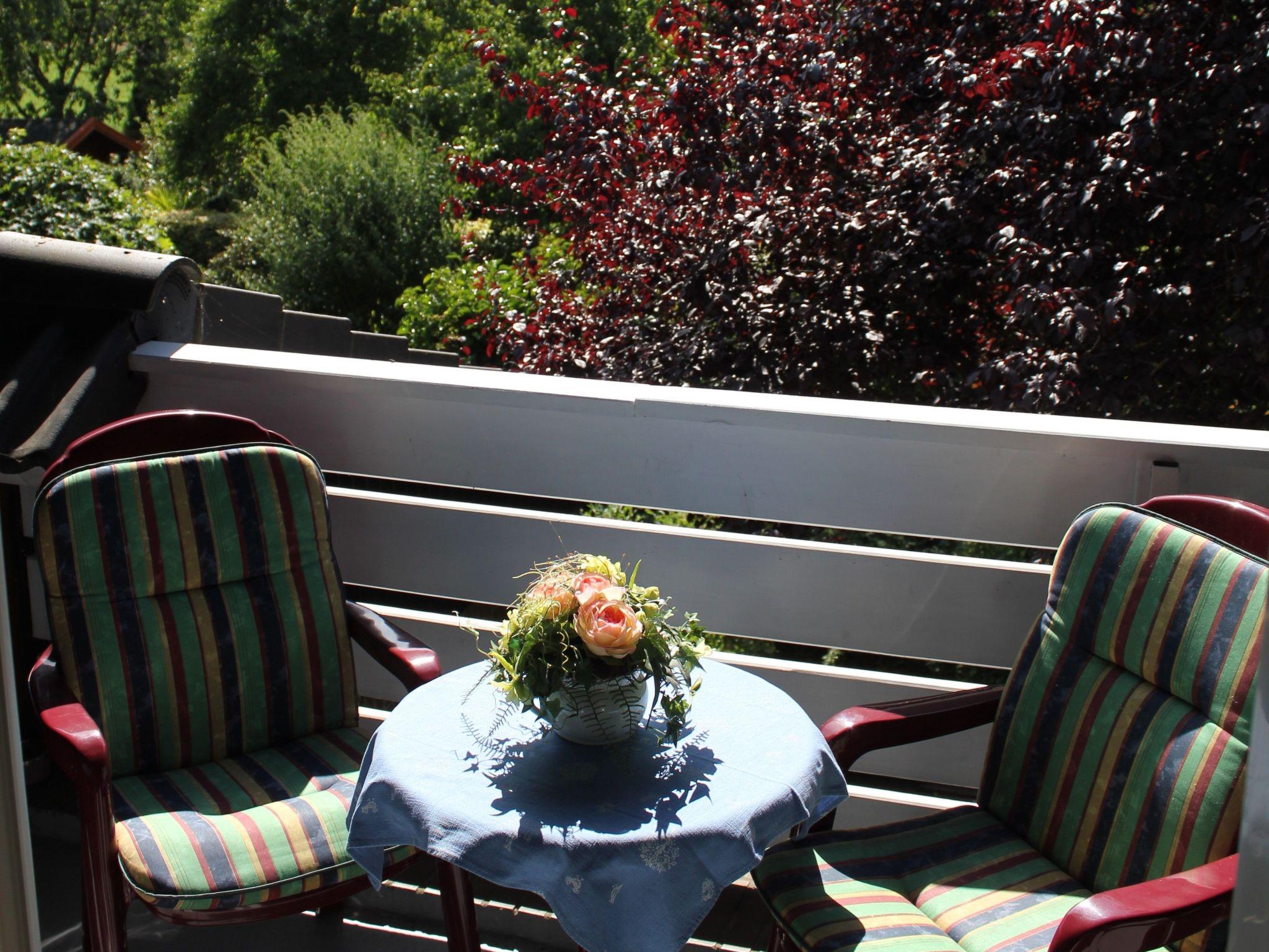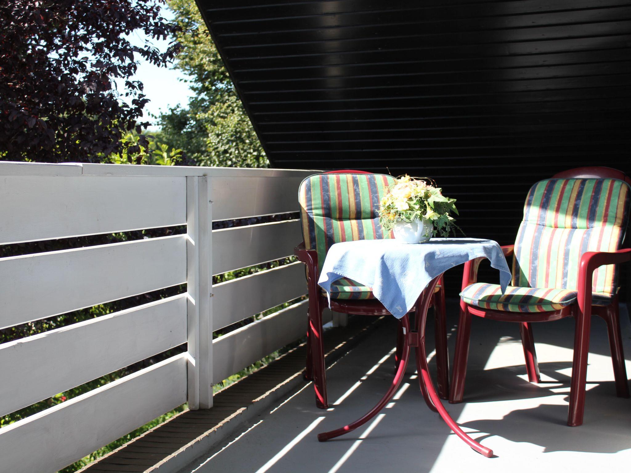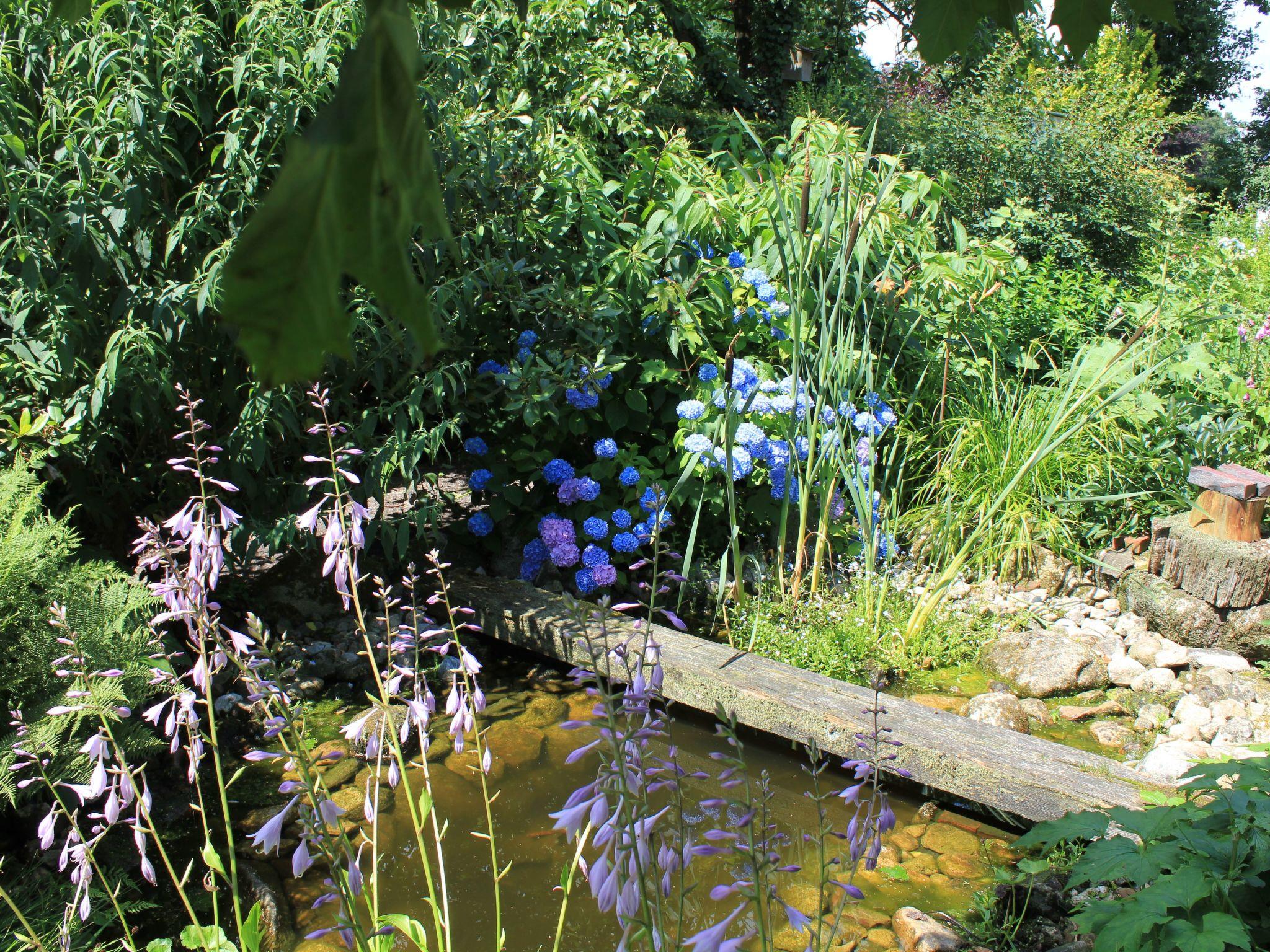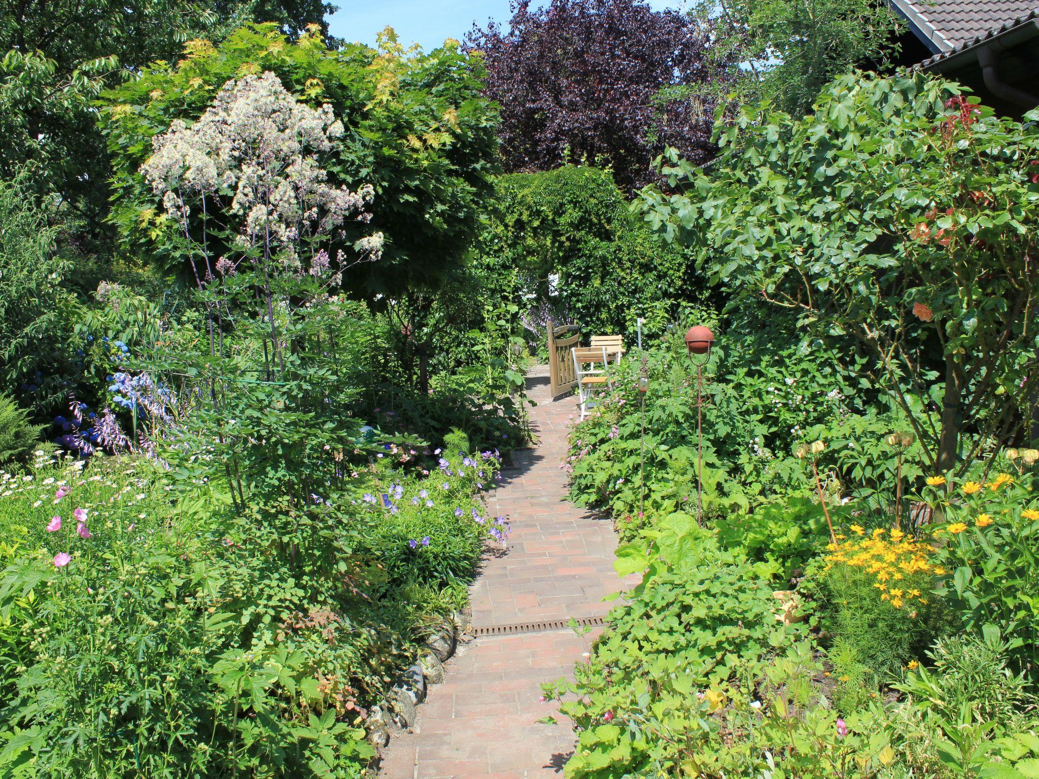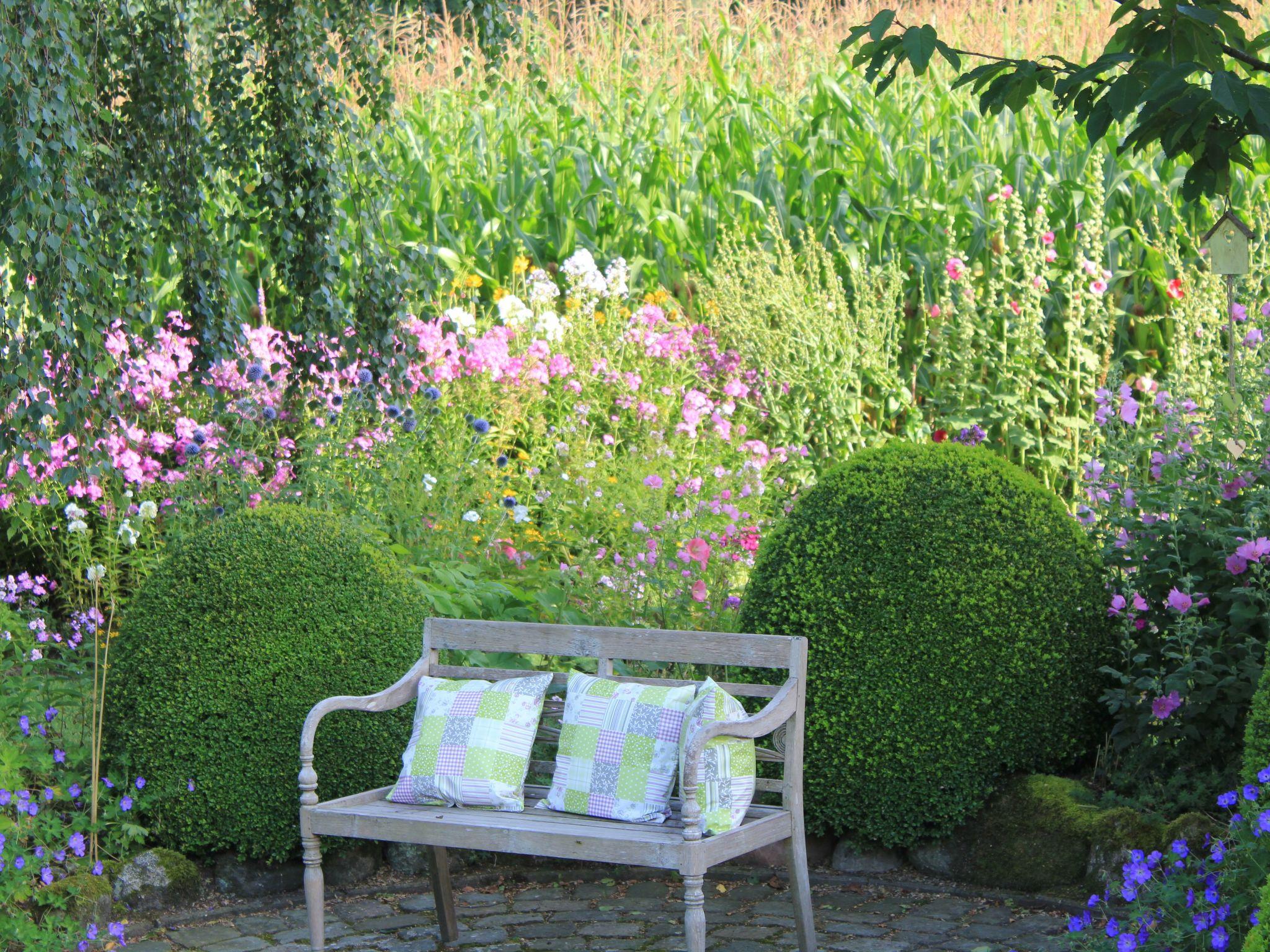 You can enjoy the sun in the afternoon on your large private west-facing balcony. The house with the holiday flat is surrounded by a beautiful garden for communal use. The various garden spaces have been created with a lot of love and energy over the past 30 years. The garden is a cheerful sea of colour from February to October. Boxwood hedges surround the herbaceous beds. A 20 metre long stream babbles past the perennials and flows into a small garden pond with goldfish. Cherries, apples, pears, currants, figs and the vegetable garden invite you to snack. Thanks to the many seating areas, you can always find a sunny or shady place to sit, depending on your needs. A large insect nesting house (bee hotel, insect hotel) provides a home for many hymenoptera, for example, and invites you to observe nature in a special way. Relax on the large furnished terrace for five people, on the garden lounger or in the beach chair. A barbecue and an electric barbecue are also available. The holiday flat also has a separate entrance, a car parking space and a ground-level bicycle garage, and we have recently planted a flowering area of 1000 square metres with 150 different flowers.
