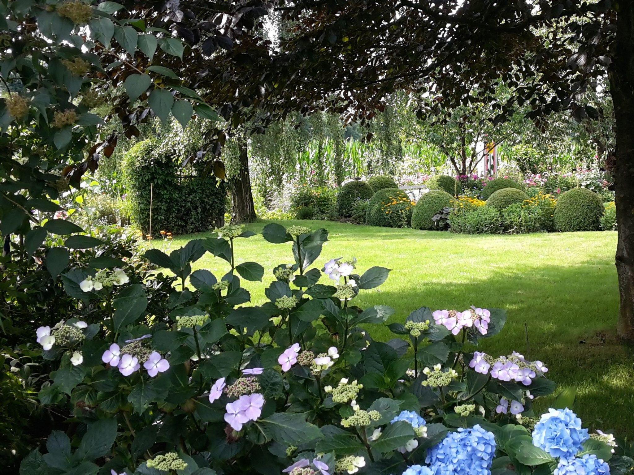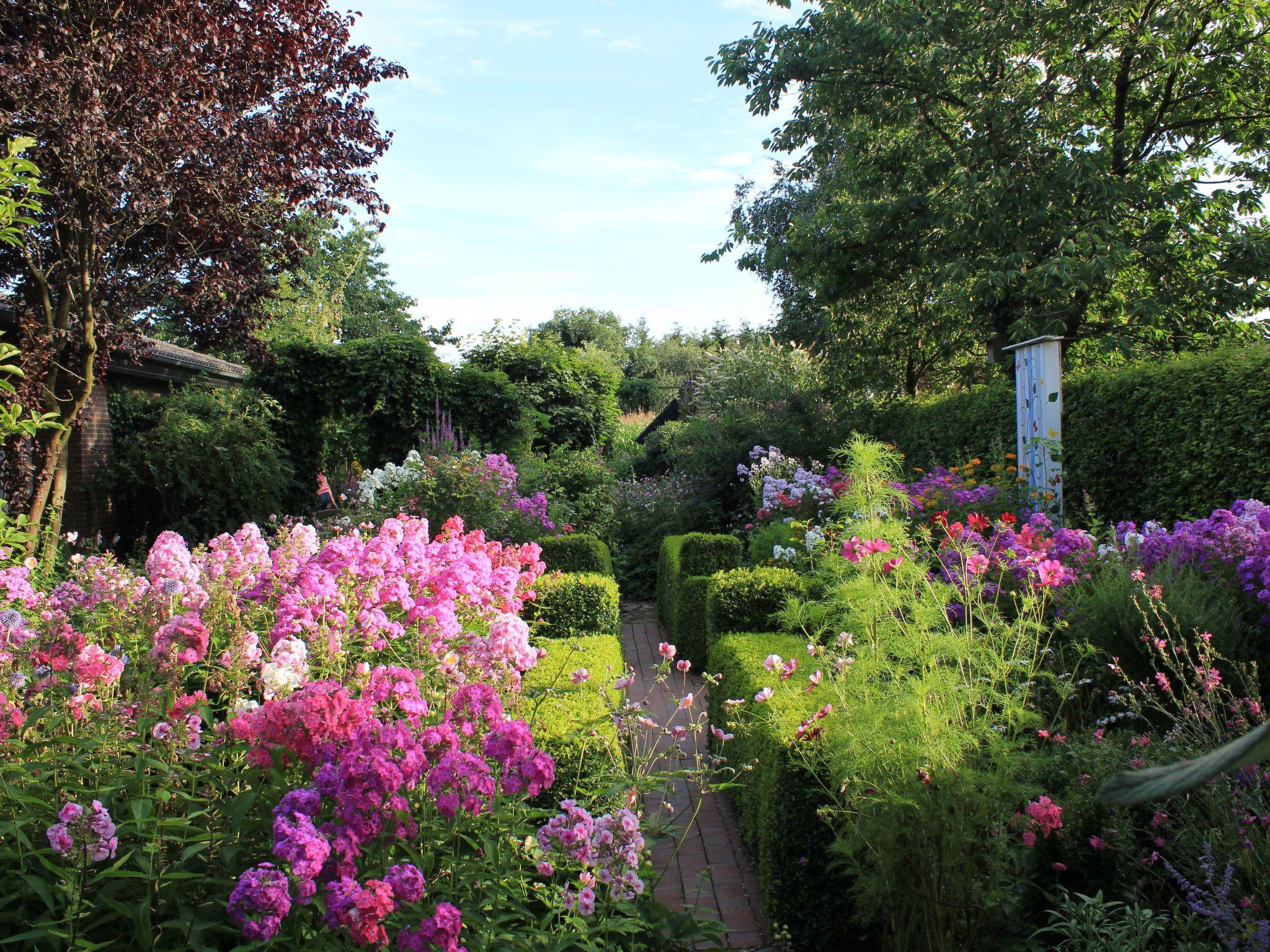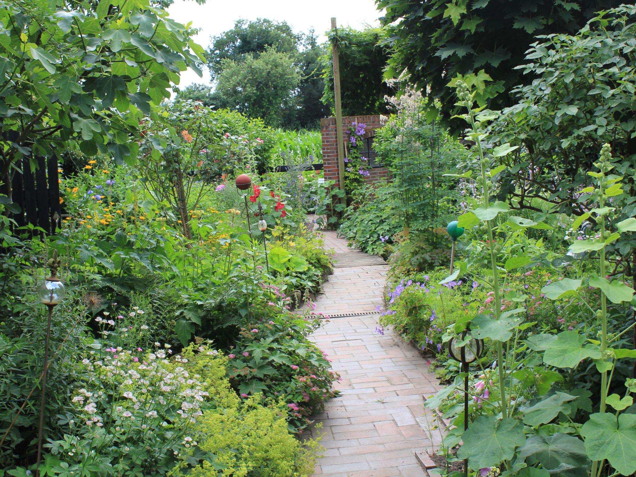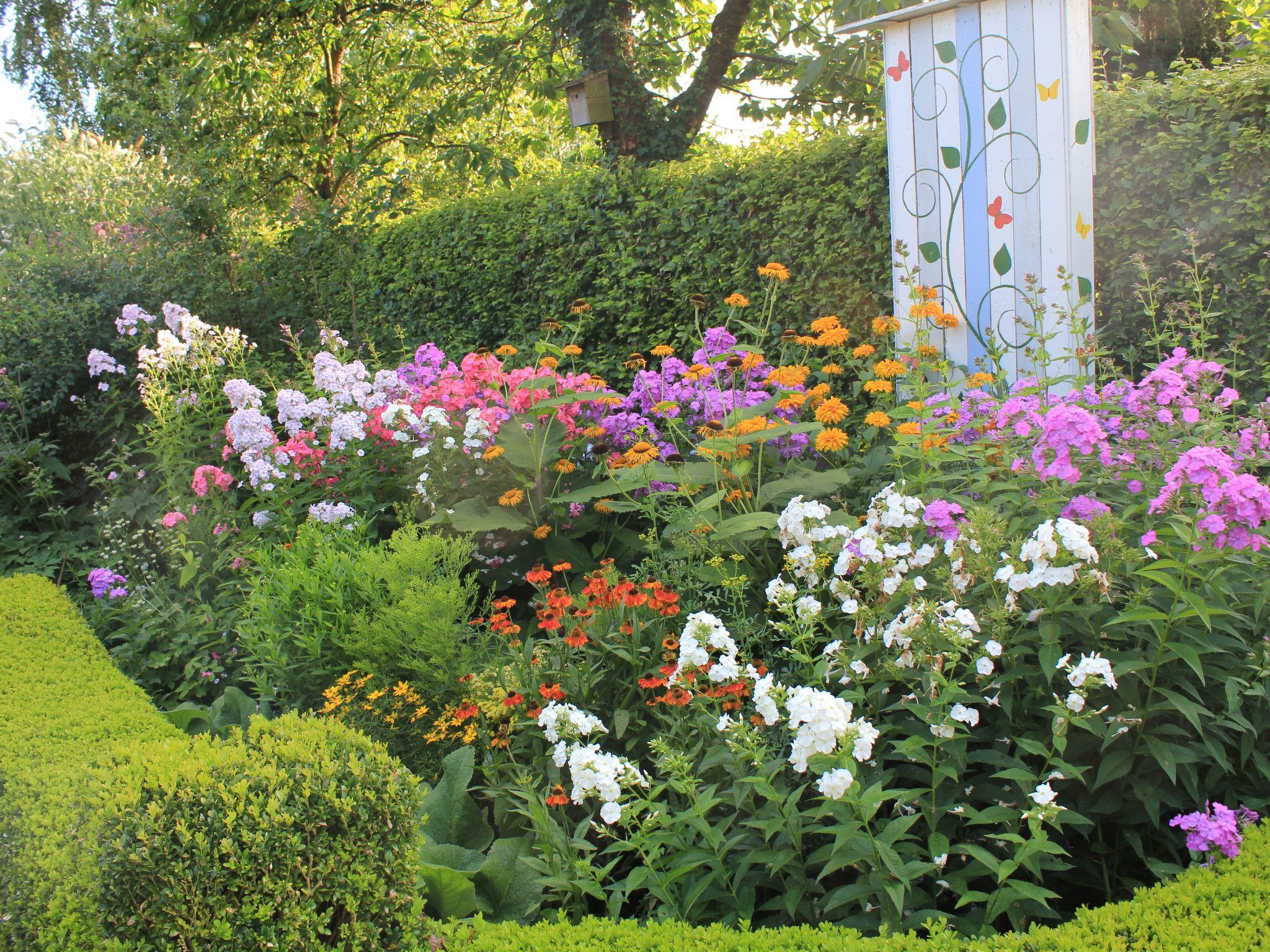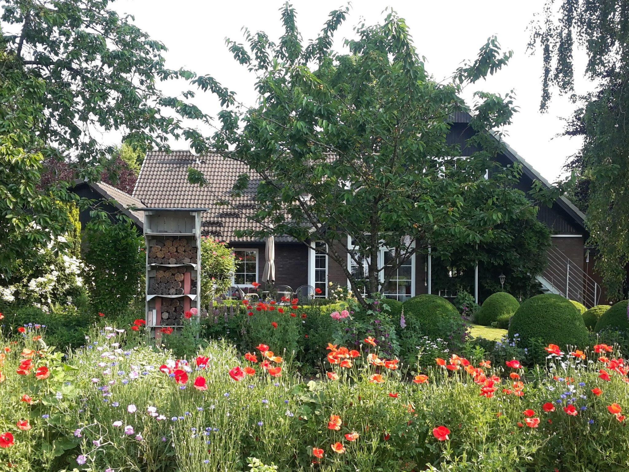 You can enjoy the sun in the afternoon on your large private west-facing balcony. The house with the holiday flat is surrounded by a beautiful garden for communal use. The various garden spaces have been created with a lot of love and energy over the past 30 years. The garden is a cheerful sea of colour from February to October. Boxwood hedges surround the herbaceous beds. A 20 metre long stream babbles past the perennials and flows into a small garden pond with goldfish. Cherries, apples, pears, currants, figs and the vegetable garden invite you to snack. Thanks to the many seating areas, you can always find a sunny or shady place to sit, depending on your needs. A large insect nesting house (bee hotel, insect hotel) provides a home for many hymenoptera, for example, and invites you to observe nature in a special way. Relax on the large furnished terrace for five people, on the garden lounger or in the beach chair. A barbecue and an electric barbecue are also available. The holiday flat also has a separate entrance, a car parking space and a ground-level bicycle garage, and we have recently planted a flowering area of 1000 square metres with 150 different flowers.