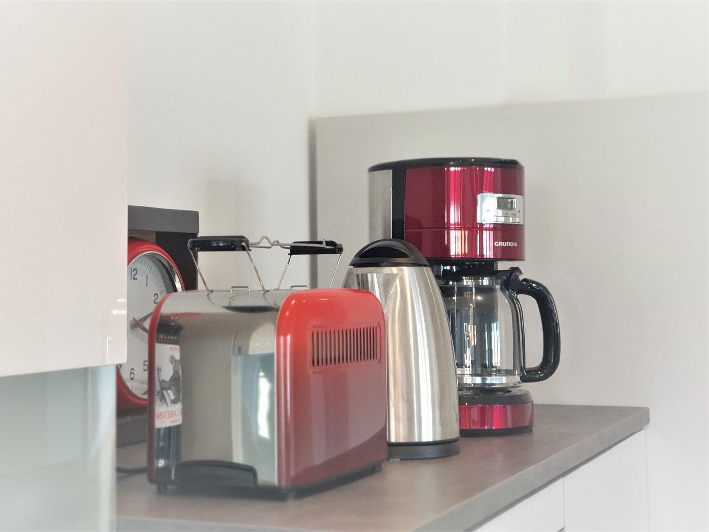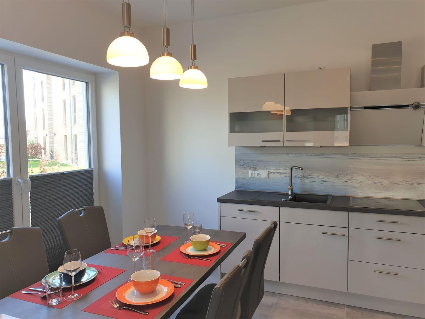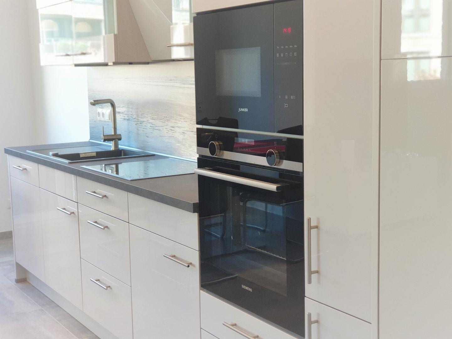 Küche und Haushalt: Einbauküche, Kühlschrank mit Gefrierfach, 4-Zonen Cerankochfeld, Backofen, Dunstabzugshaube, Geschirrspüler, Waschmaschine, Kaffeefiltermaschine, Toaster, Wasserkocher, hochwertiges Geschirr und Besteck
