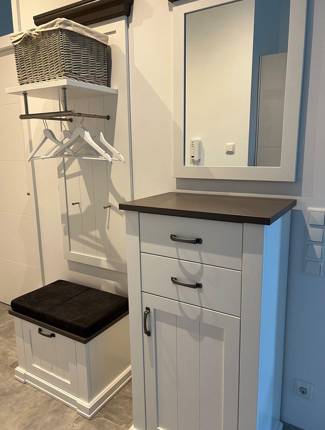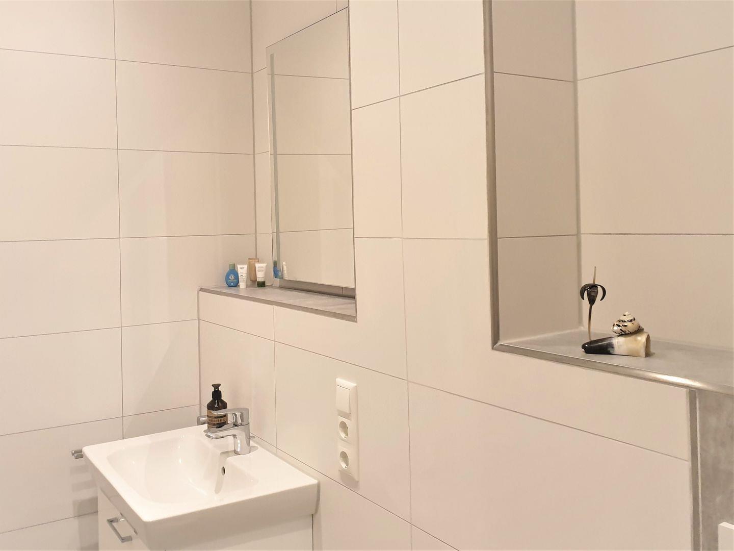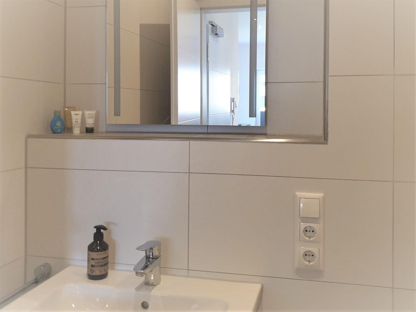 Bad und Sanitär: bodentiefe, barrierefreie Regenwalddusche, Waschtischanlage mit Spiegel, WC, Handtuchheizung, Handtücher (1 Duschtuch + 2 Handtücher) und Bettwäsche auf Anfrage