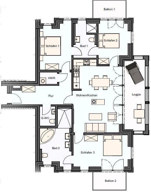 Aufteilung-Zimmer: 130qm, 1 Wohn-Essbereich, 3 Schlafzimmer, 2 Badezimmer, 1 Gäste-WC, 1 Abstellraum, 3 Balkone