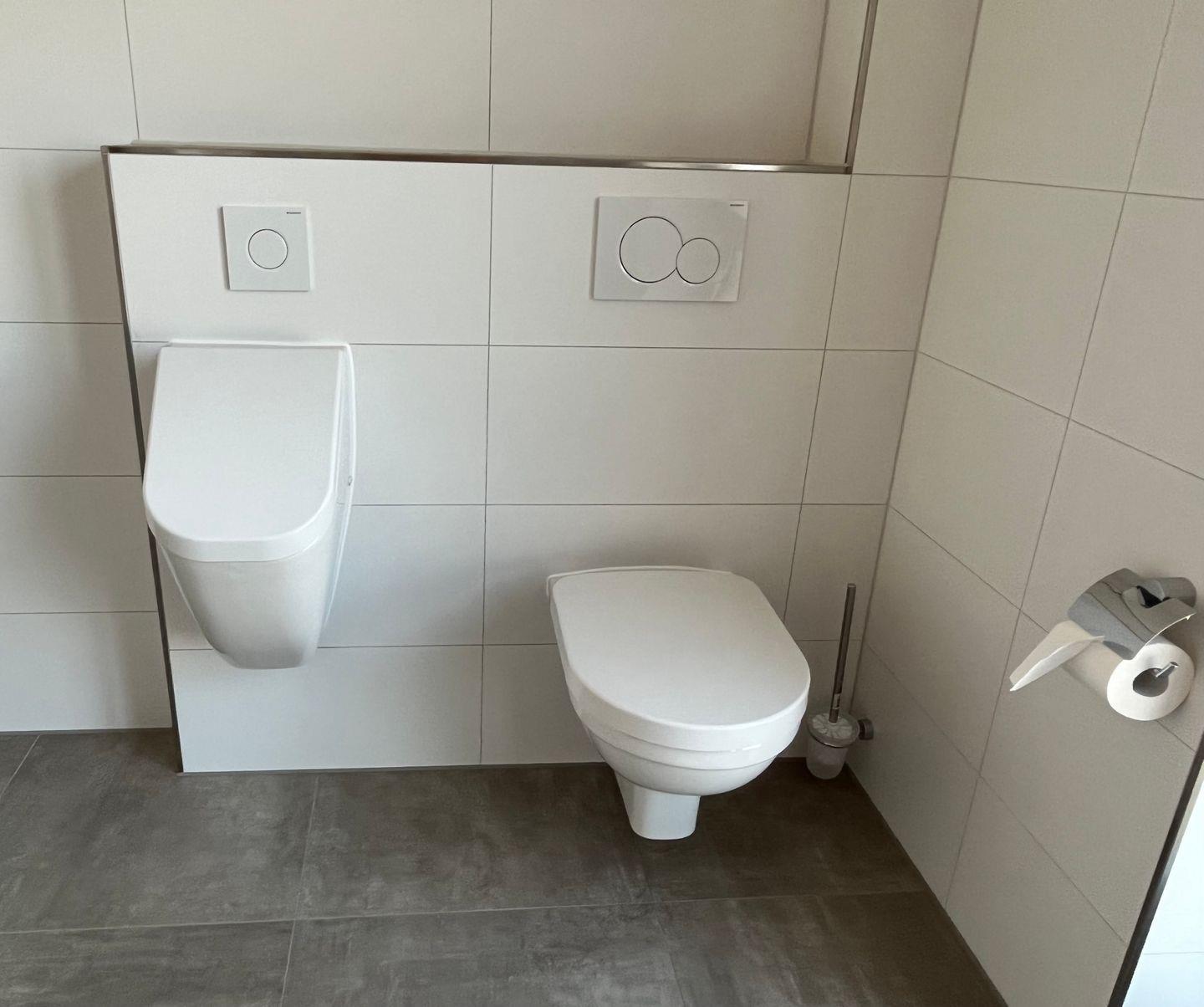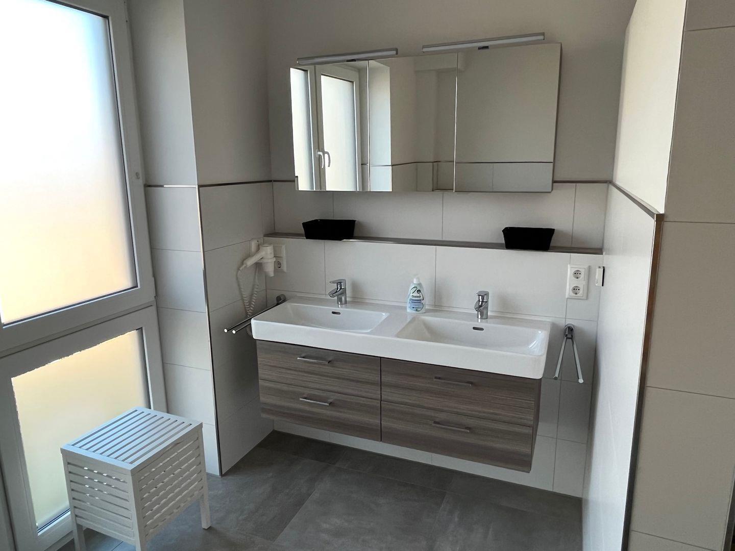 Duschbad im 1. OG: bodentiefe, barrierefreie Dusche, Waschtischanlage mit Spiegel, WC, Handtuchheizung, Föhn