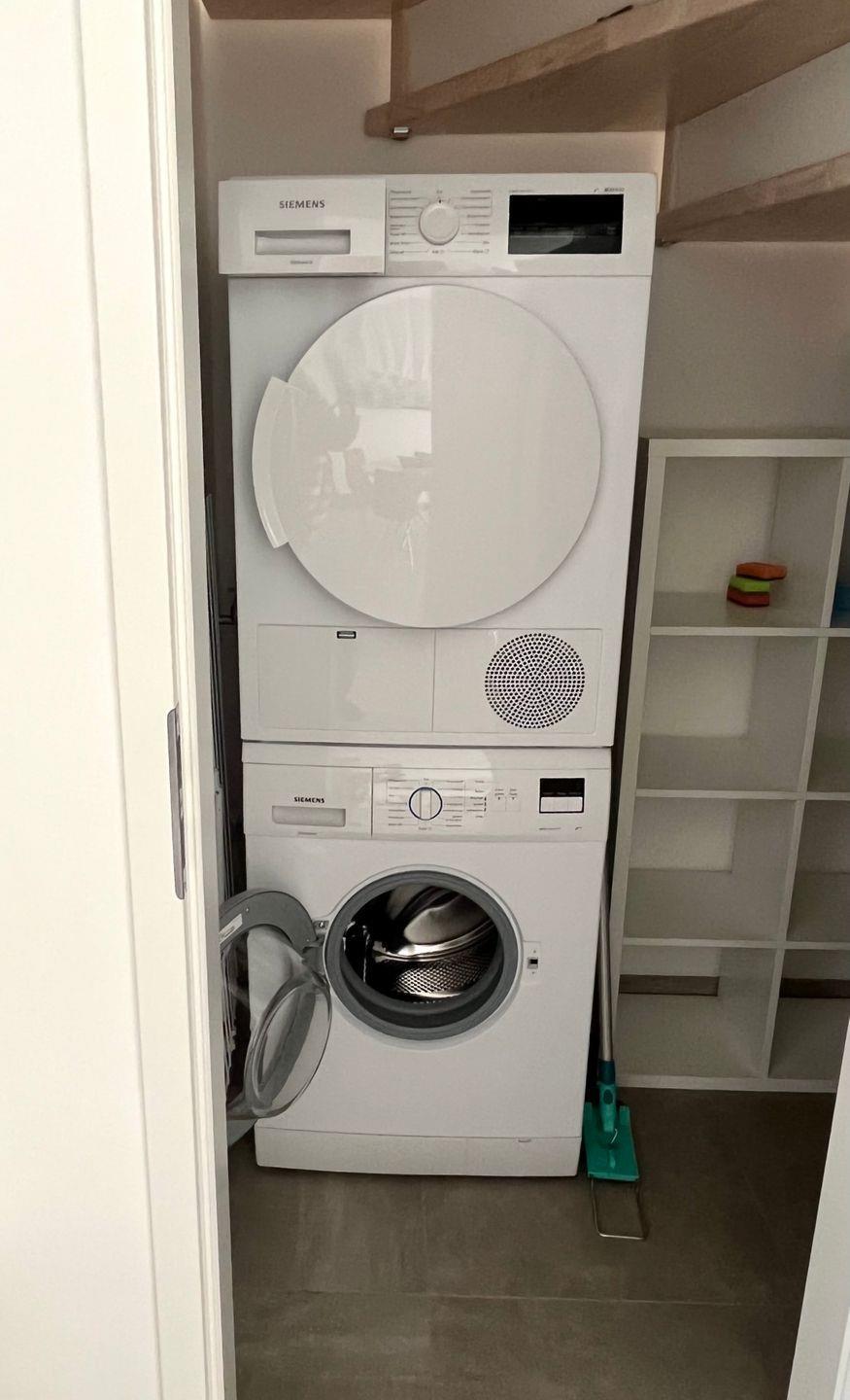 Haushalt: Staubsauger, diverse Reinigungsutensilien, Wäscheständer (im Abstellraum im Flur), Waschmaschine, Trockner