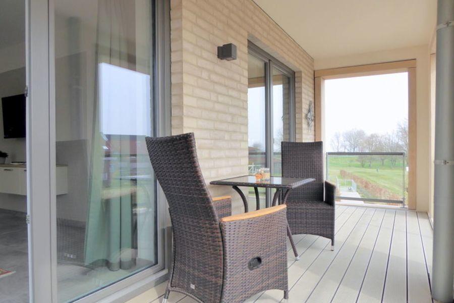 Von der großen Loggia, mit Balkonmöbeln ausgestattet, können Sie den seitlichen Meerblick genießen.