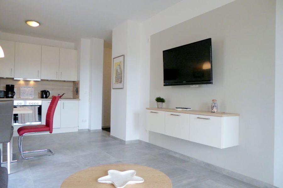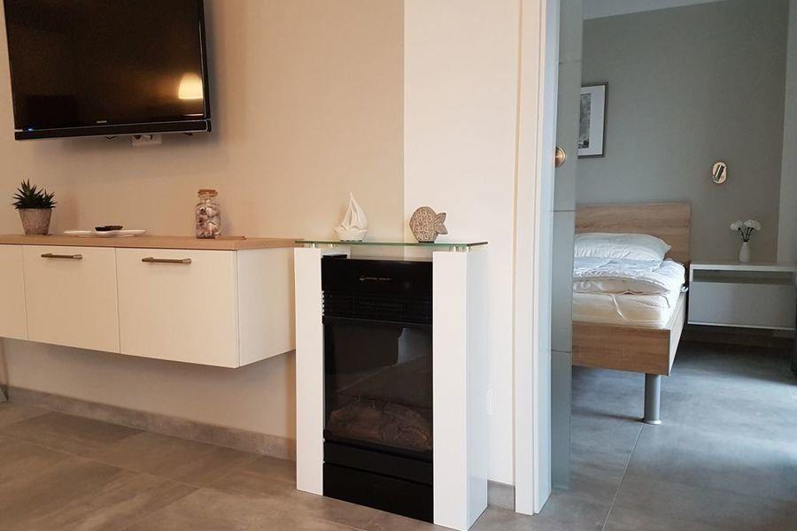 Der moderne Elektrokamin rundet den komfortablen Wohnraum ab.