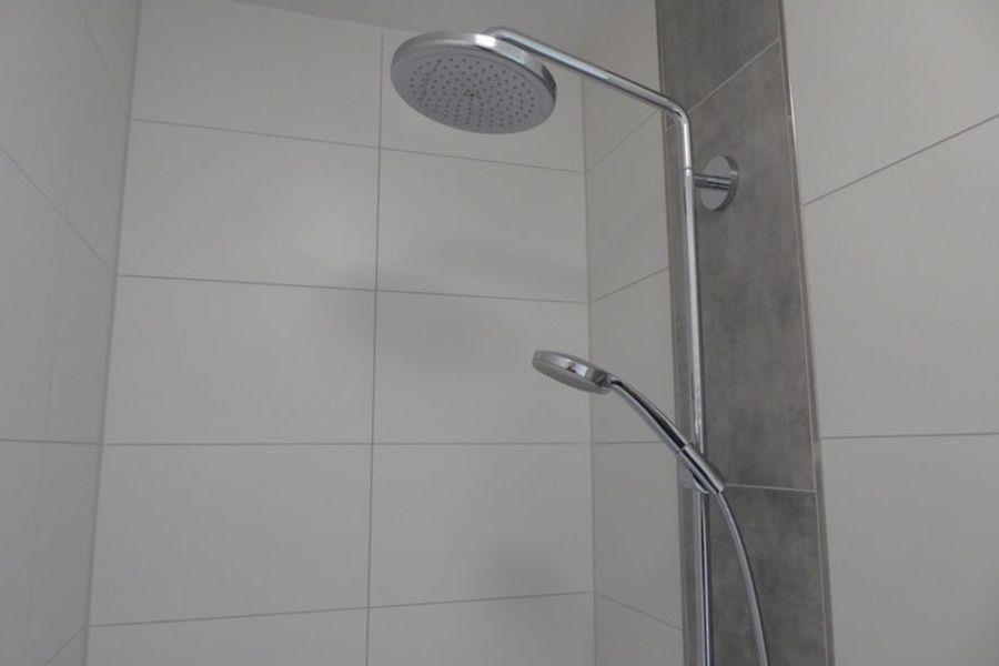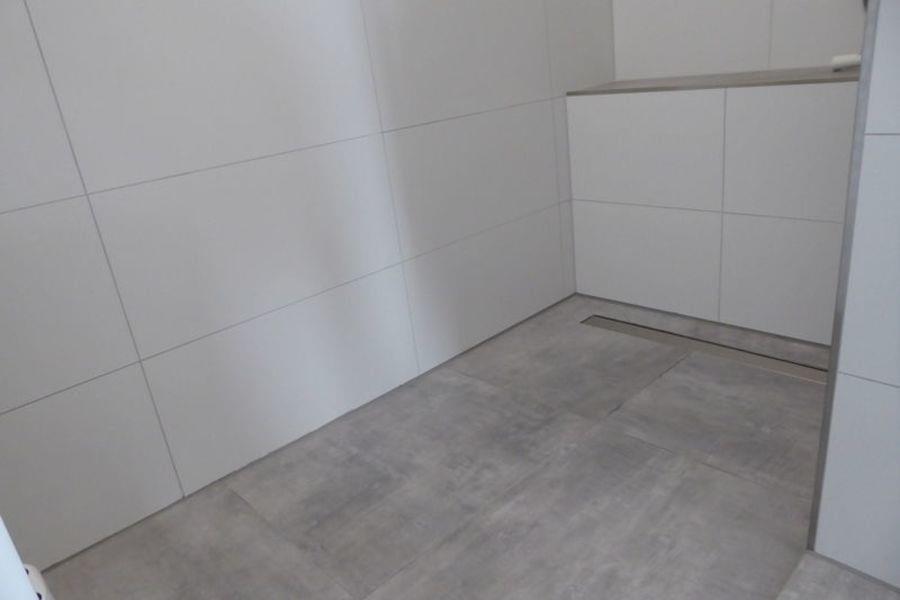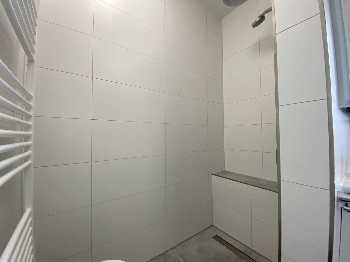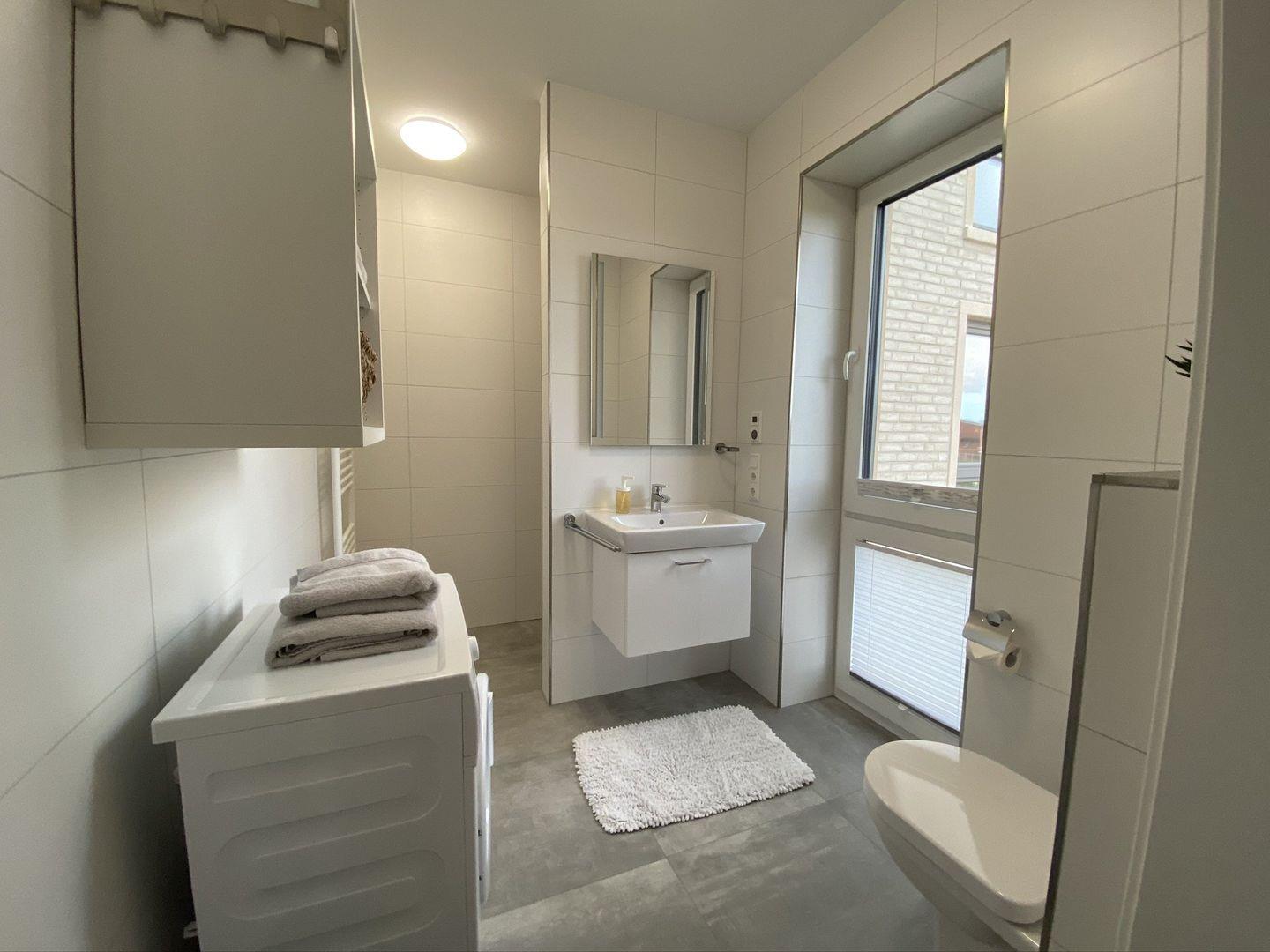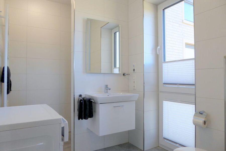 Das moderne Duschbad ist mit bodengleicher Dusche, WC, Handtuchheizung, kleiner Waschmaschine und Fenster ausgestattet.
