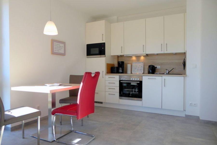 Der Essbereich mit großem Esstisch und moderner Küche ist mit besten Markengeräten ausgestattet.