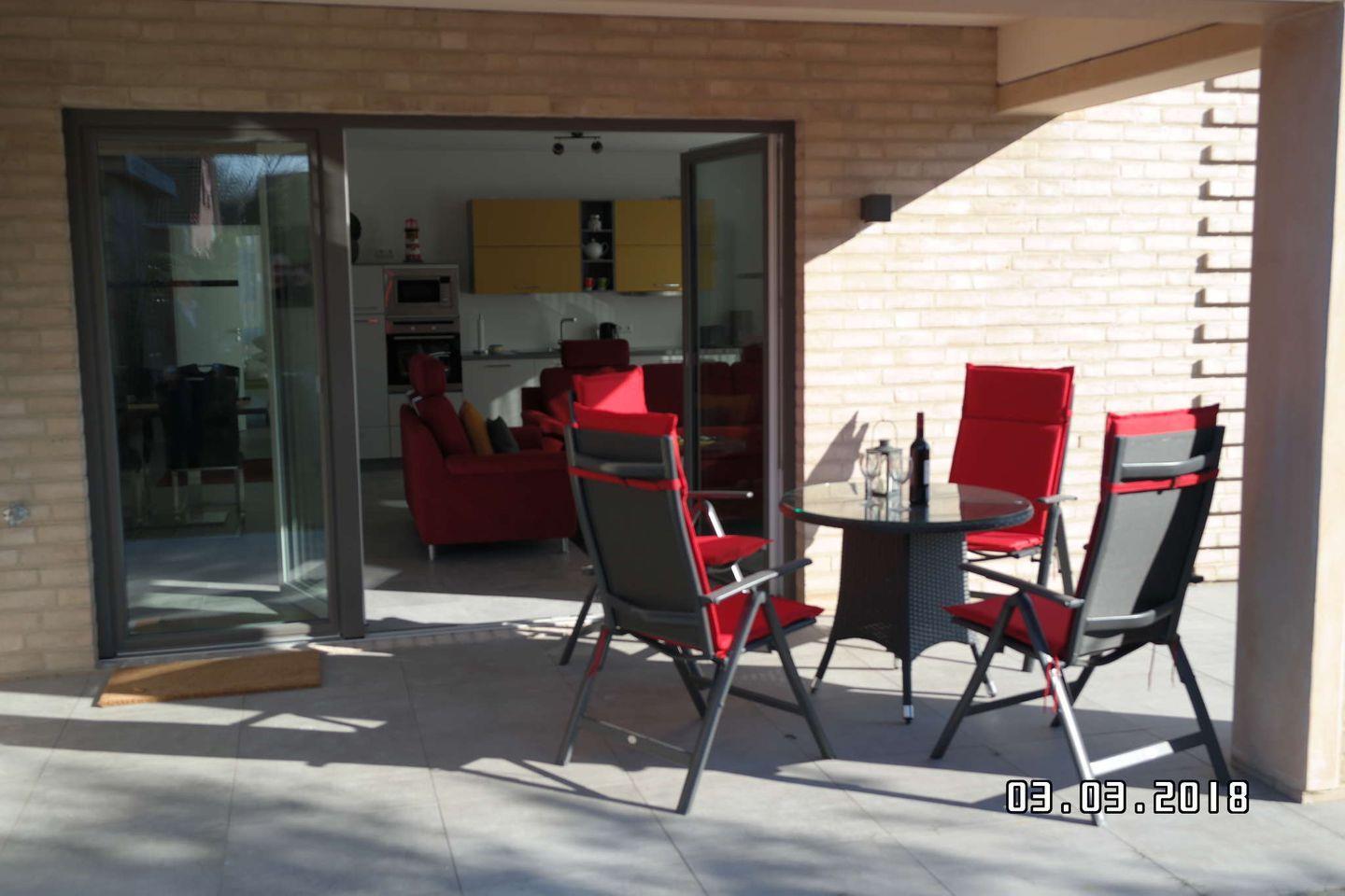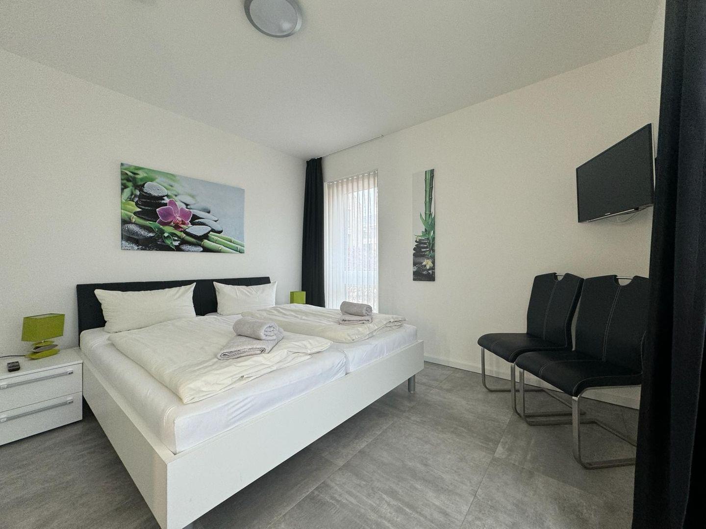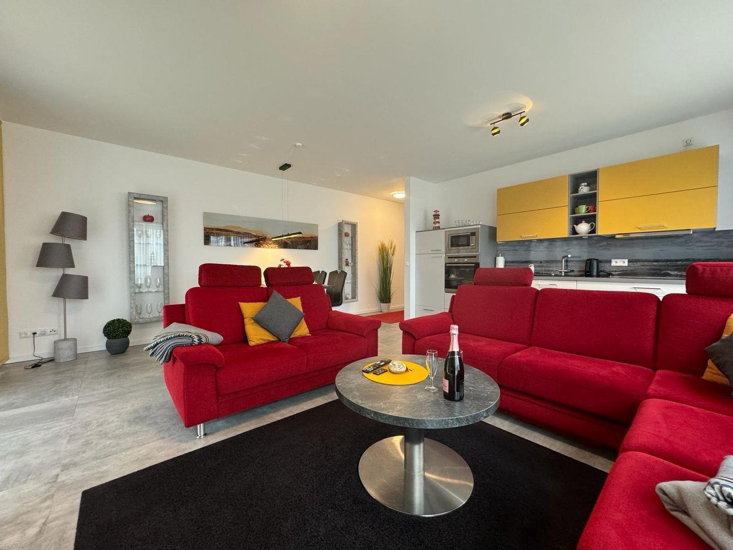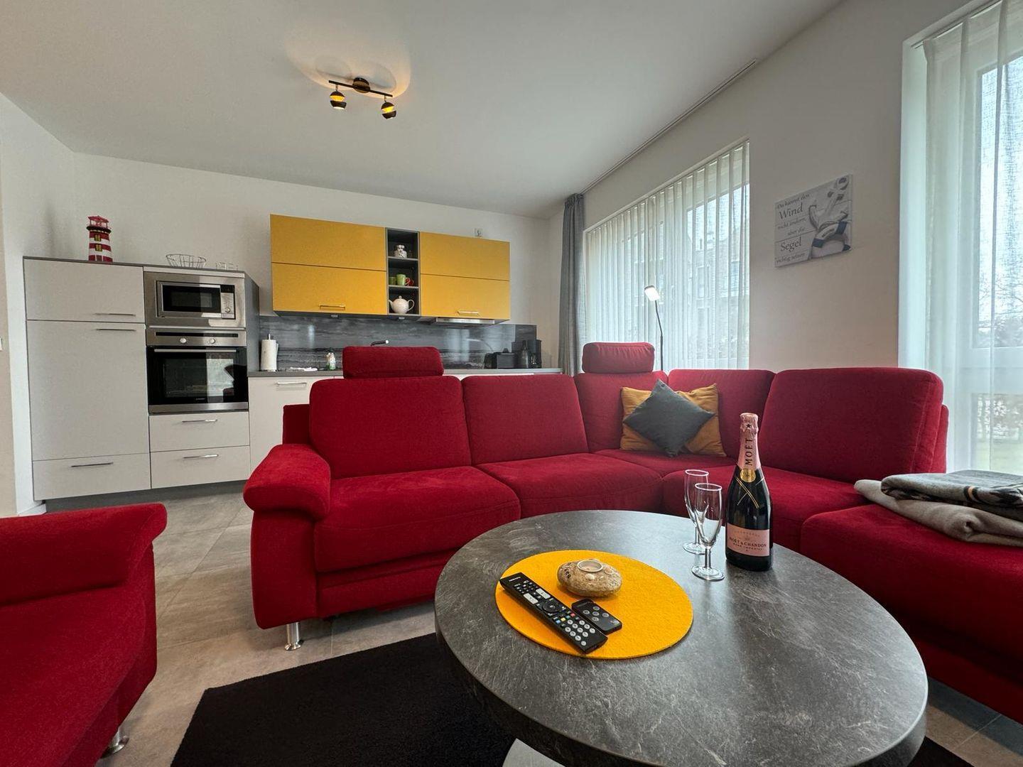 Ihre barrierefreie Erdgeschosswohnung verfügt über ein exklusives Badezimmer in Gray Porina Granit mit Sommerregendusche, abgetönten Wandfliesen, einer Loggia, zwei Schlafzimmern mit 5 Schlafmöglichkeiten, zzgl. Schlafsofa, ein loftiges Wohnesszimmer mit Kamin und modernster Küche. Feinste Materialien, edle Stoffe, ein intelligentes Raumkonzept und moderne Farbkompositionen.