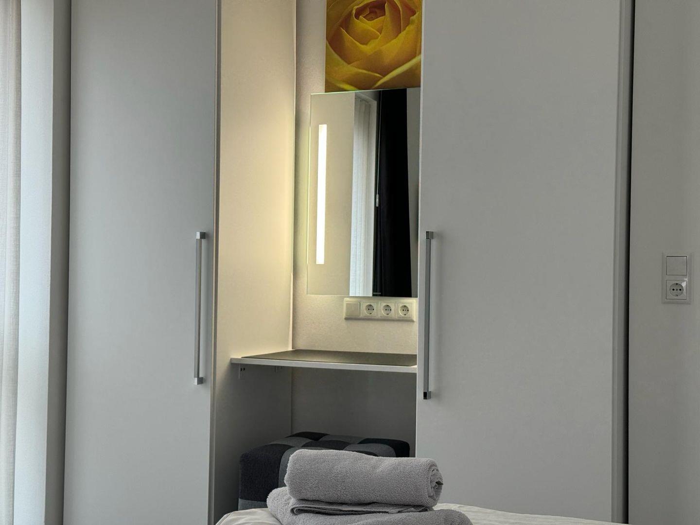 Besonders zu erwähnen ist Barrierefreiheit der gesamten Wohnung. Es gibt ein Seniorengerechtes bzw. behindertenfreundliches Bett. Es ist höher und breiter. Hinzu kommt das Badezimmer mit seiner bodentiefe Dusche und Sitzhocker. Ein großes Extra ist der PKW Stellplatz der direkt vor der Wohnung platziert ist. Somit haben sie nur Max. 10 m zu Fuß. Gerne können sie auch ein E- Seniorenmobil bei uns mieten. Wir bringen es auch gerne bei Ihnen vorbei.