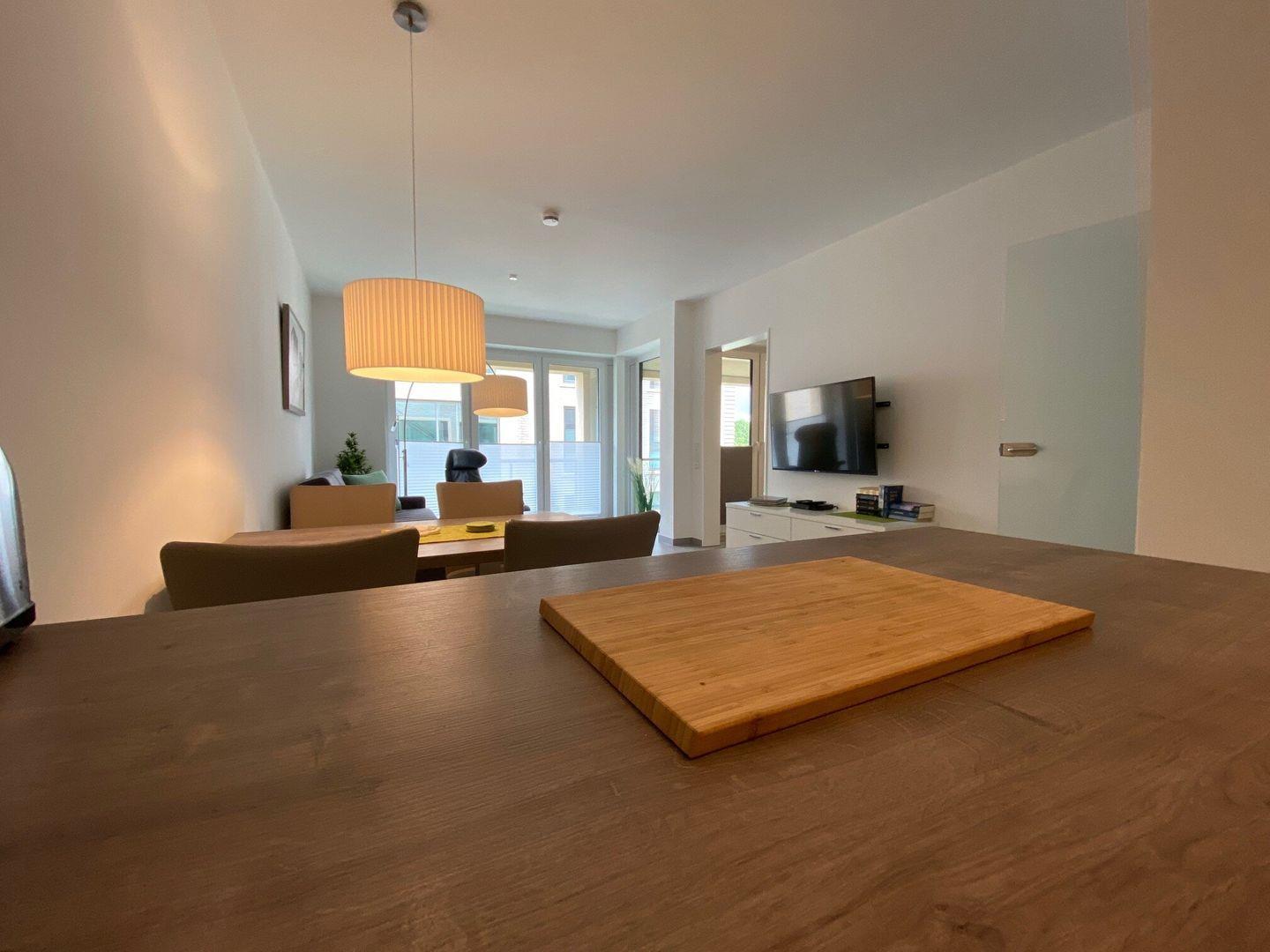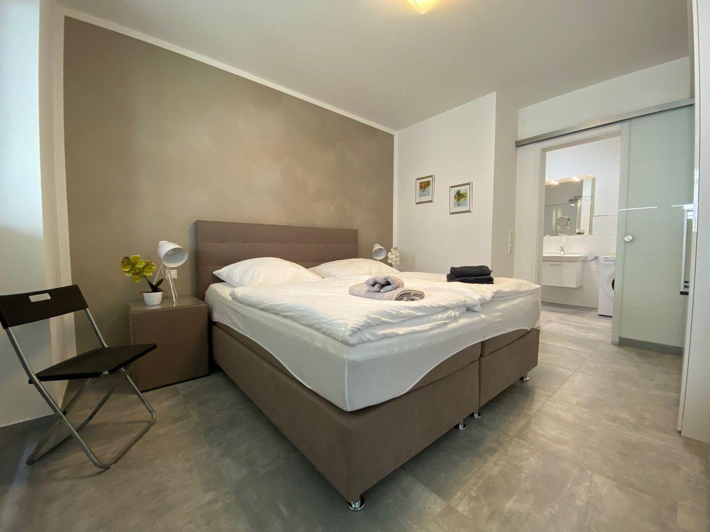 Die Wohnung verfügt über ein geschmackvoll eingerichtetes Schlafzimmer und ein modernes Badezimmer mit einer bodengleichen Dusche, die Ihnen einen komfortablen Aufenthalt garantiert. Die offene Küche zum Wohnzimmer ist mit hochwertigen Geräten ausgestattet, darunter ein Ceranherd, Backofen, Mikrowelle und Geschirrspüler. Hier können Sie Ihre kulinarischen Fähigkeiten entfalten und leckere Gerichte zubereiten. Alles, was Sie dafür benötigen – vom Kühlschrank bis zur Kaffeemaschine – ist vorhanden. Genießen Sie Ihre Mahlzeiten am großzügigen Esstisch oder auf dem Balkon mit Blick ins Grüne, der einladend zum Verweilen einlädt.