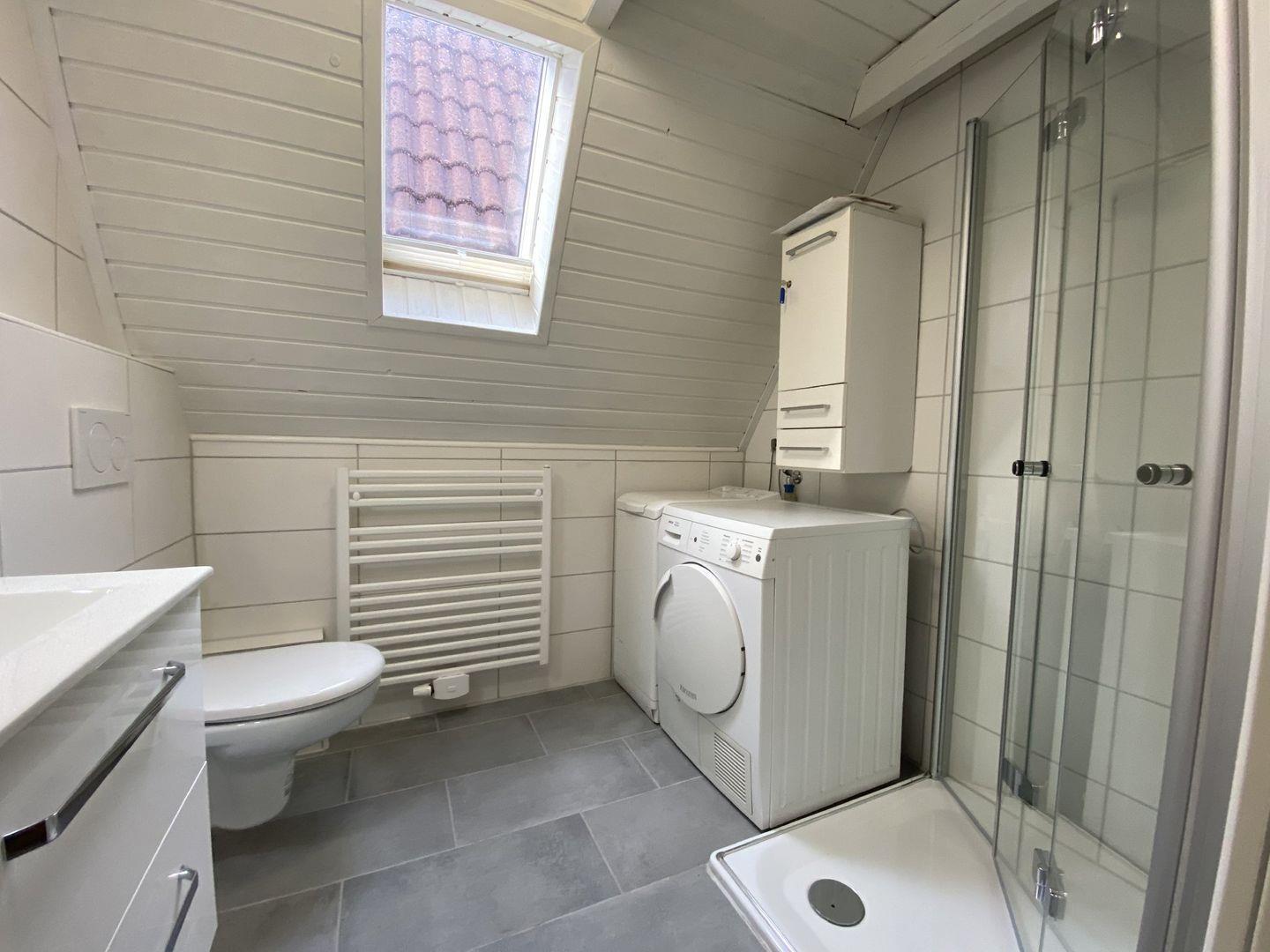 Das helle, durch das Dachfenster lichtdurchflutete Badezimmer, besitzt neben einer Dusche auch eine Waschmaschine und einen Trockner, sodass lebendige Ausflüge an den Nordseestrand ohne Bedenken erlebt werden können.
