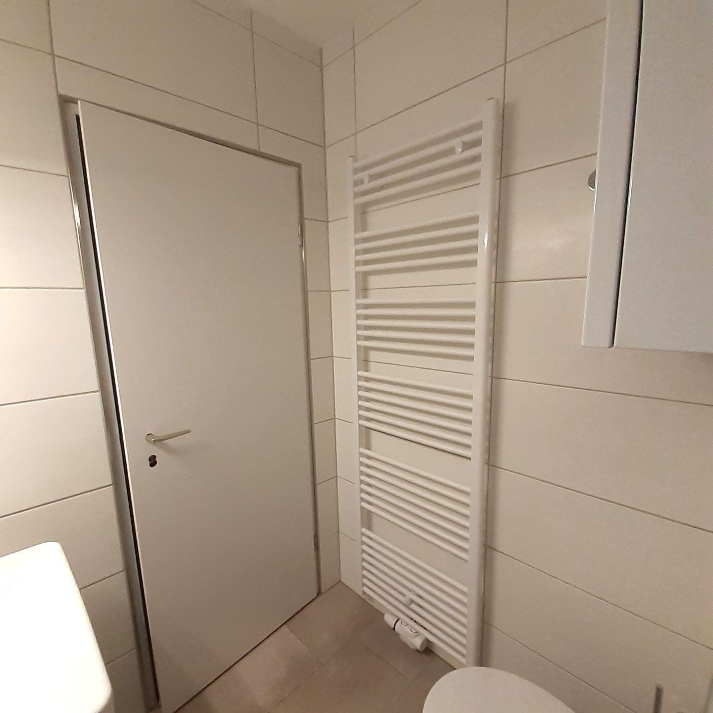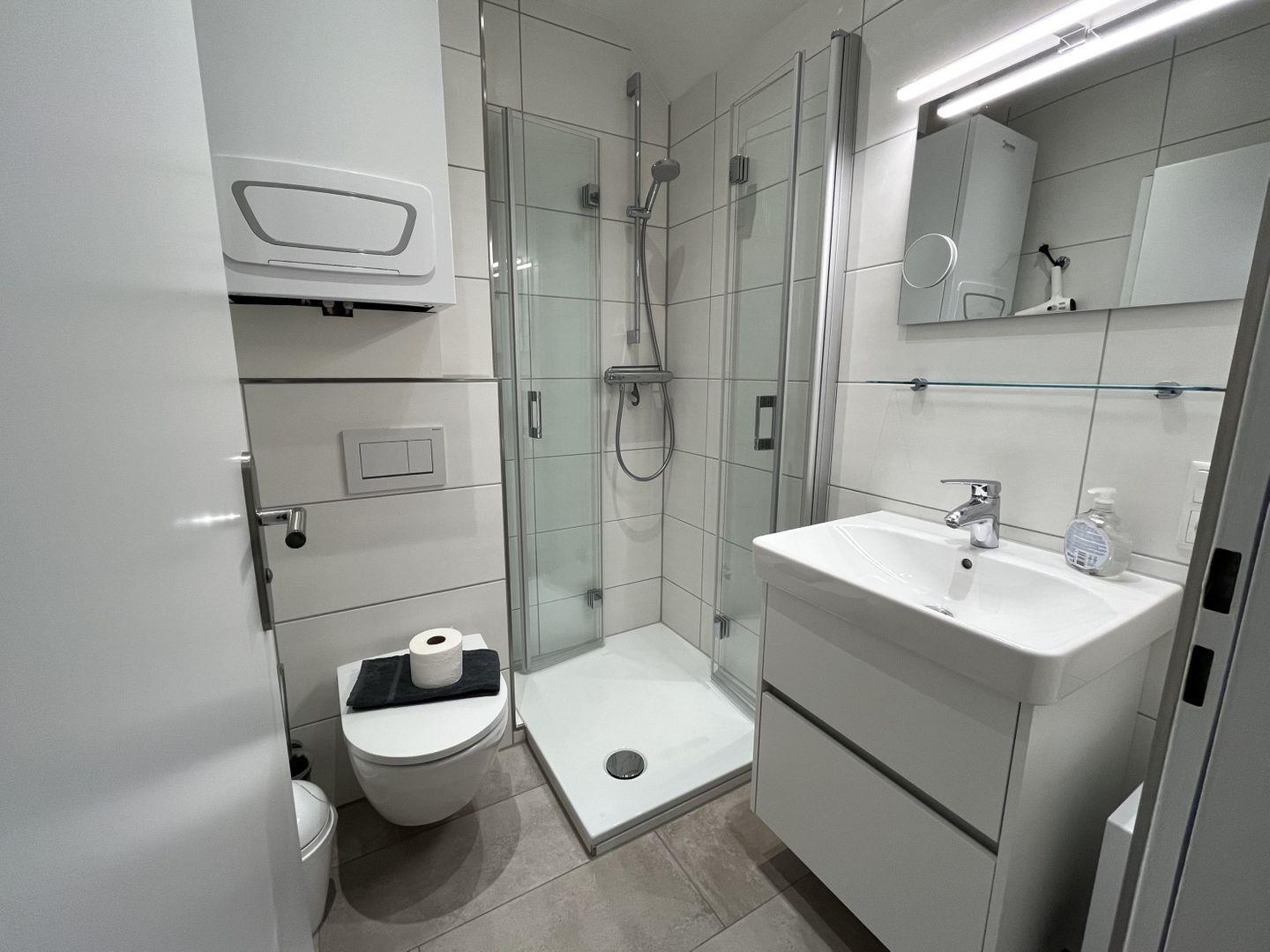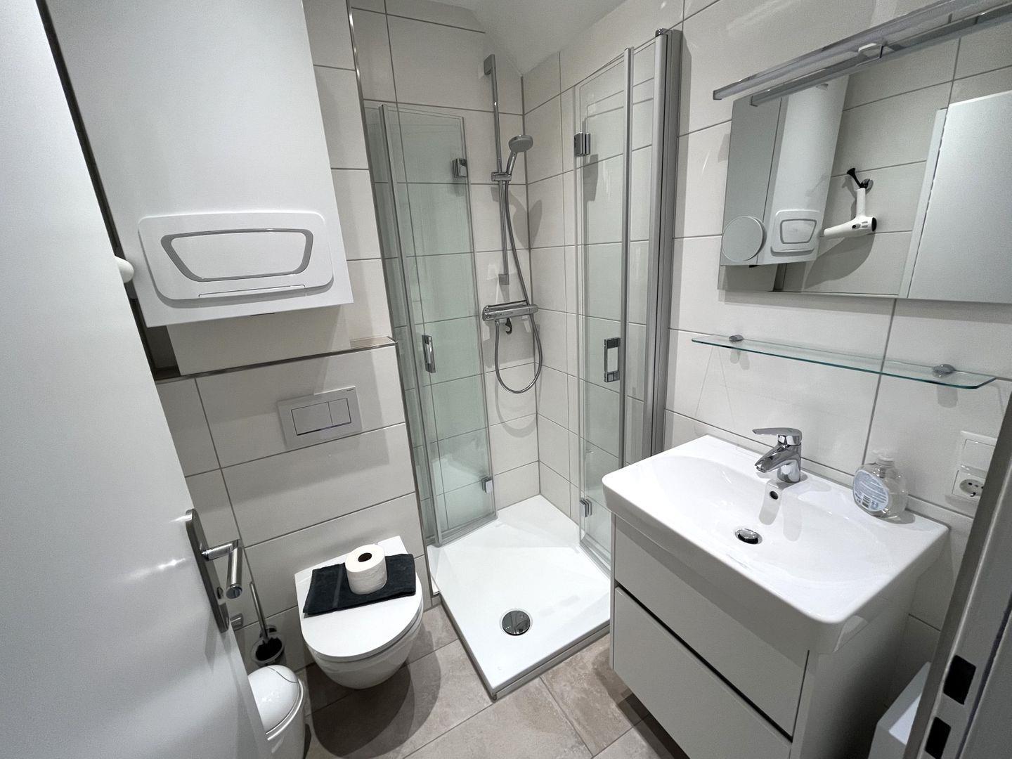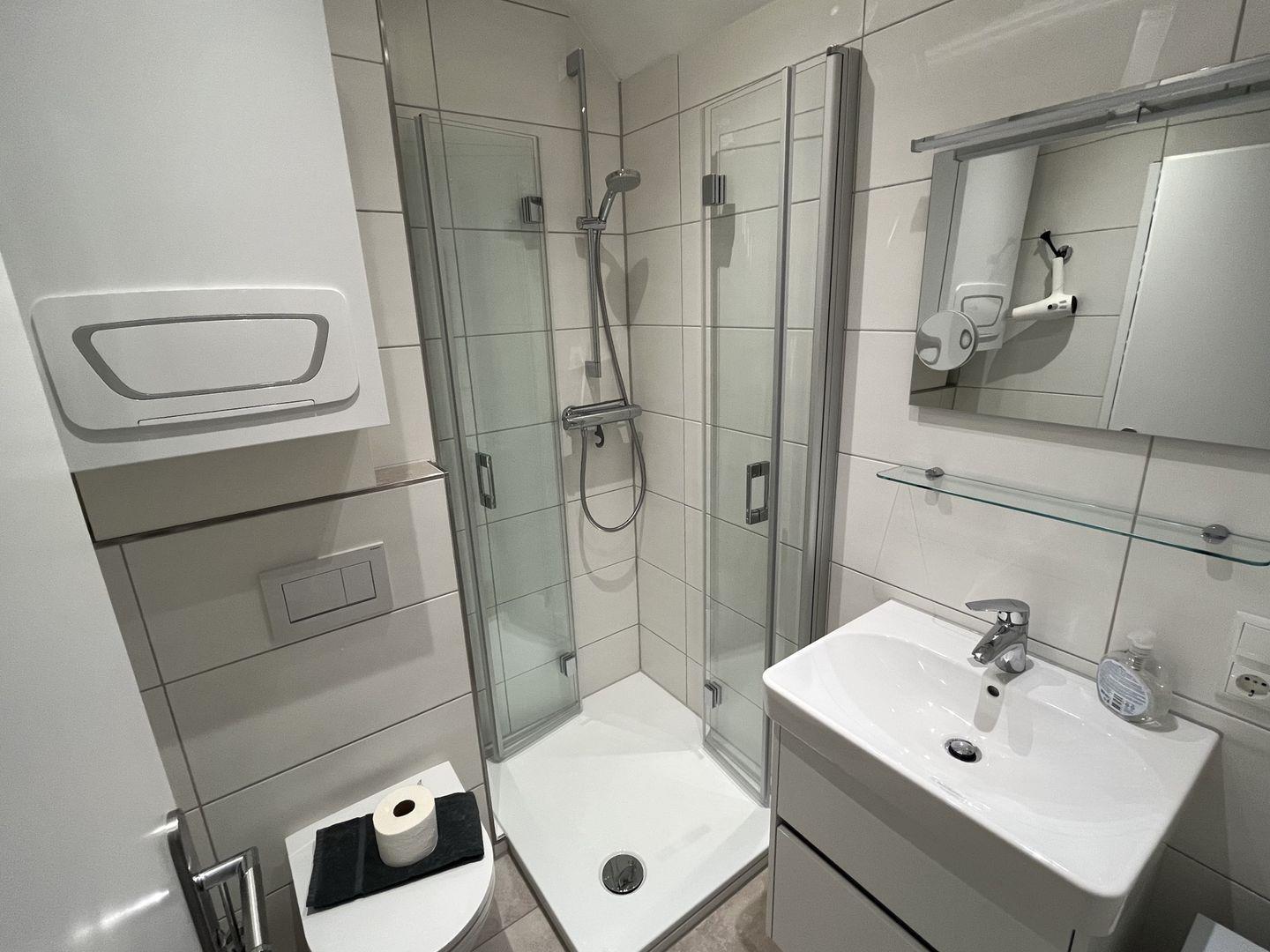 Das in 2025 komplett neu renovierte Bad ist mit einem Spiegel, Fön, Waschtisch, Dusche und WC ausgestattet.