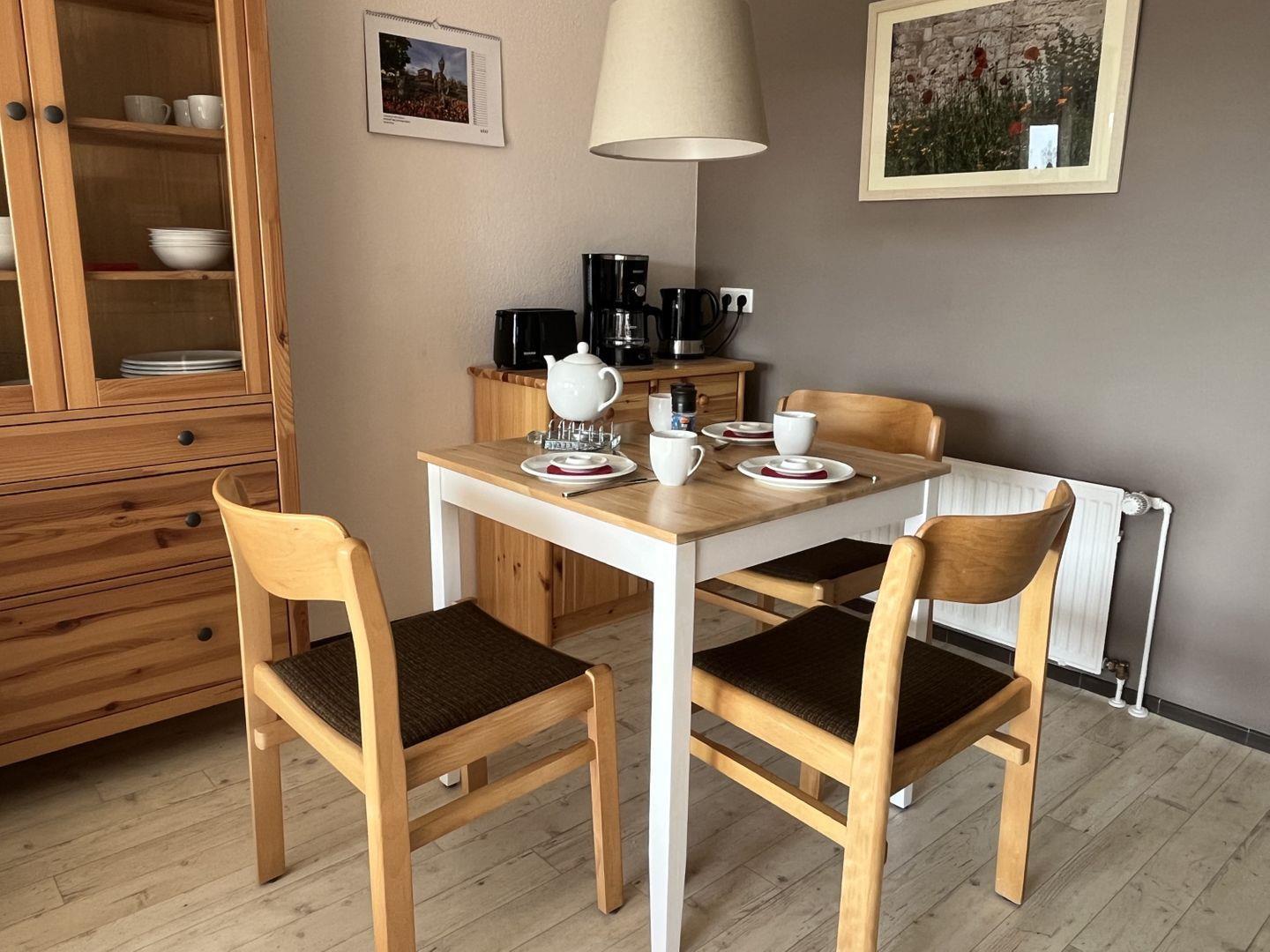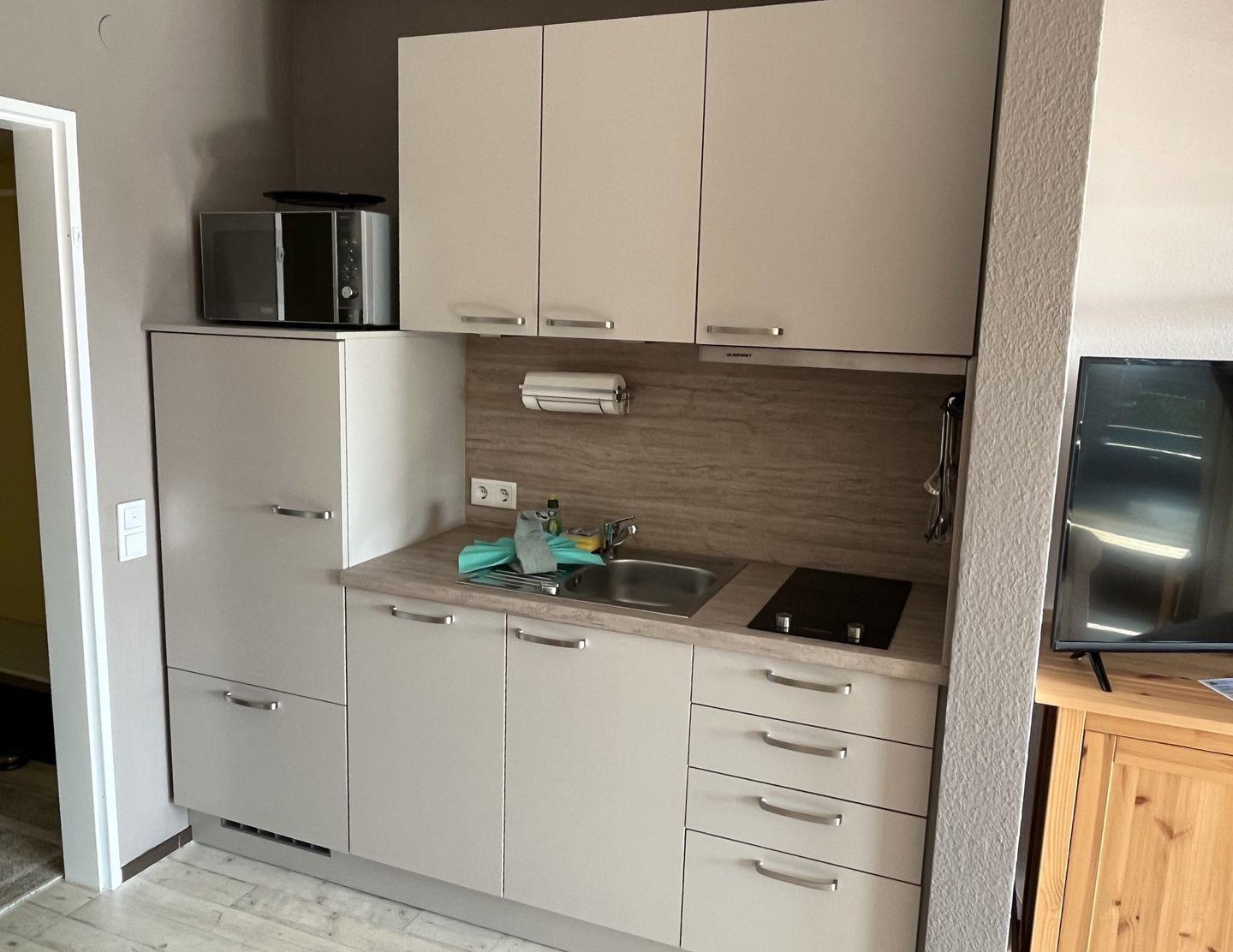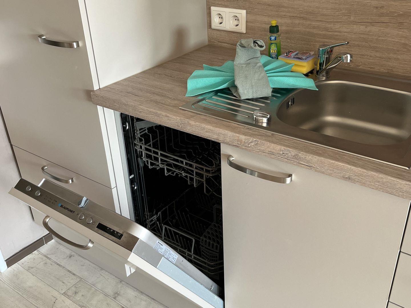 Die Küche enthält ein 2-Platten Kochfeld, Kühlschrank mit Gefrierfach, Geschirrspüler, Mikrowelle, Wasserkocher, Kaffeemaschine, Toaster sowie ausreichend Geschirr, Gläser und Besteck.