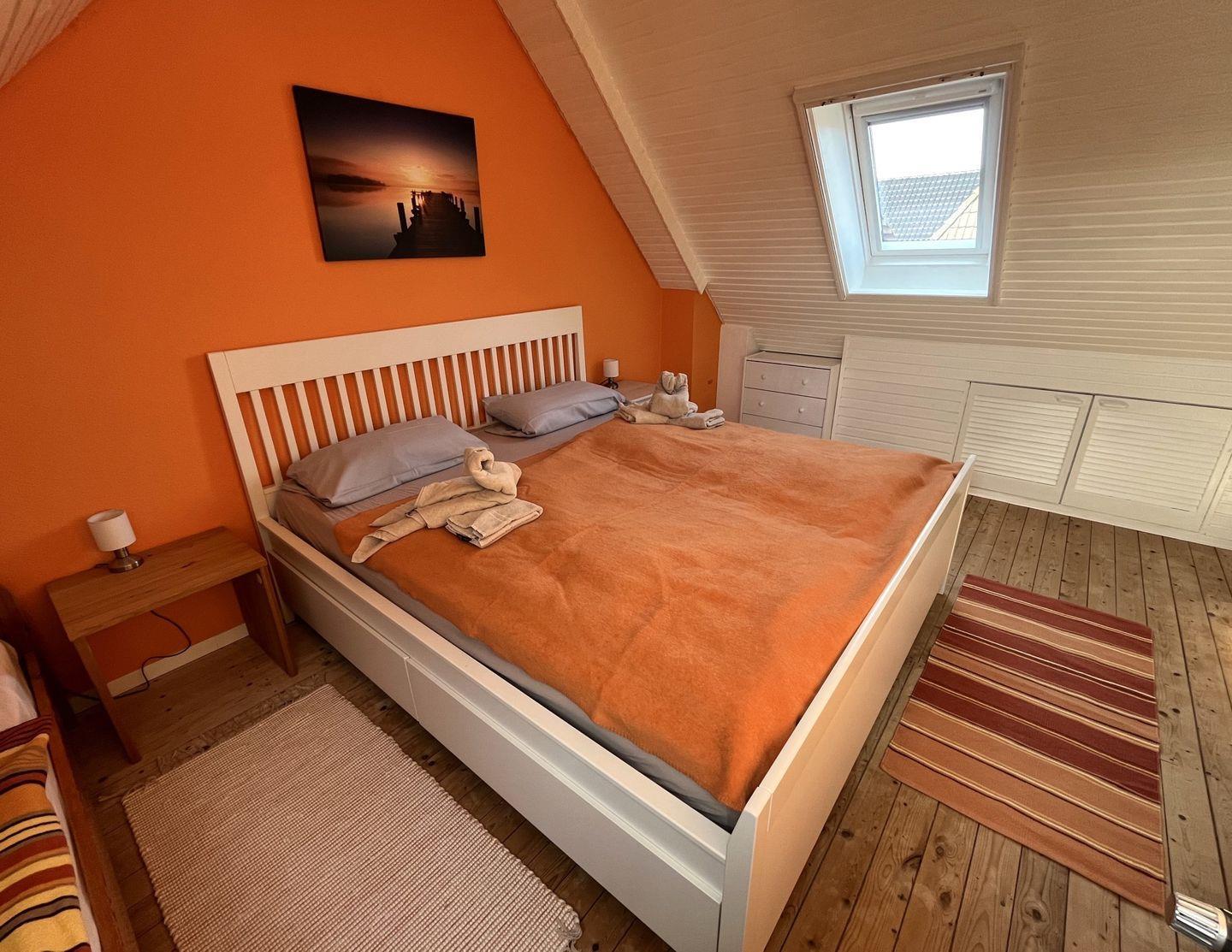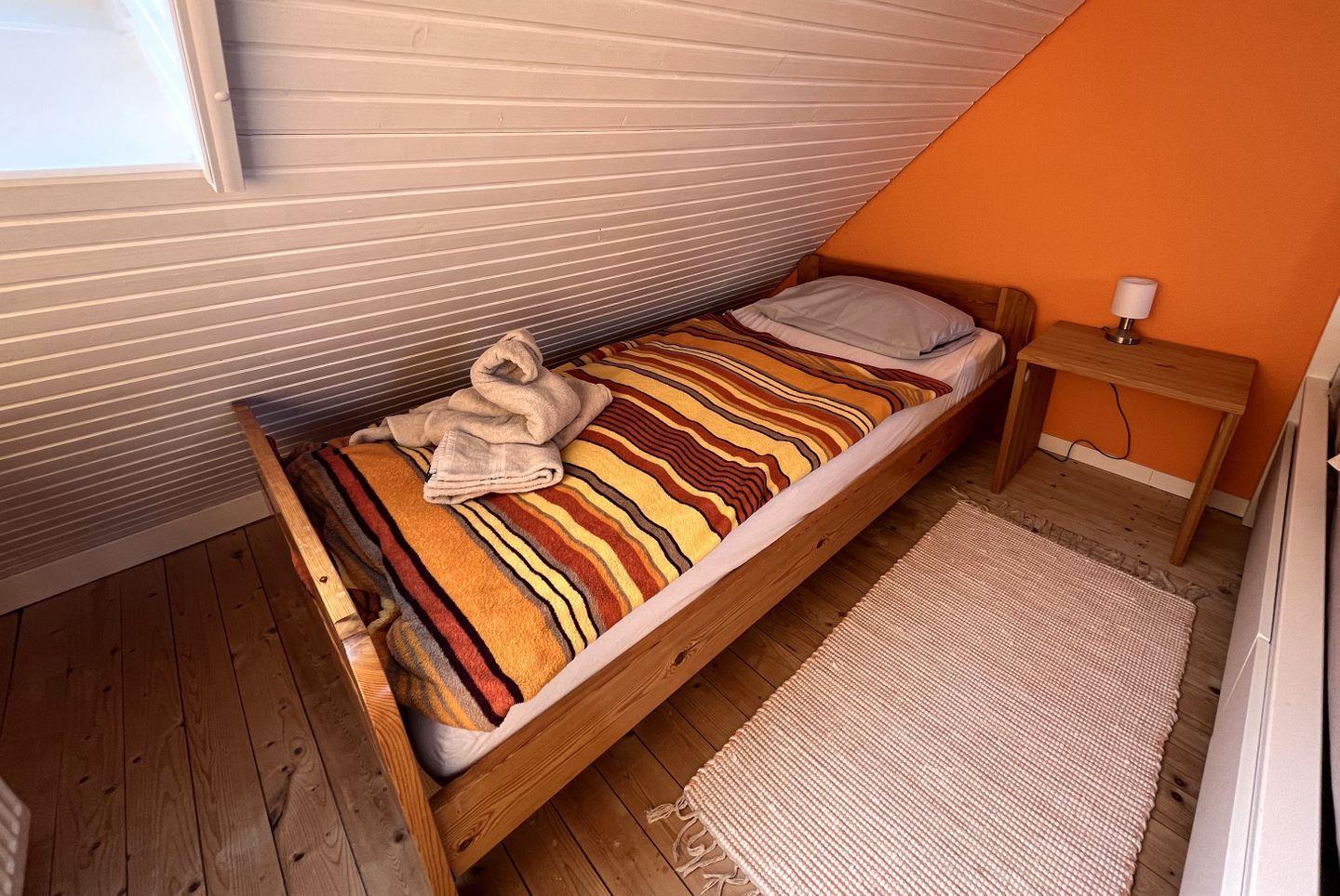 In das separate Schlafzimmer führt eine Treppe nach oben und es ist ausgestattet mit einem Kleiderschrank sowie ein Bett in der Größe von 180 x 200 cm sowie ein Einzelbett mit den Maßen 90x200 cm.
