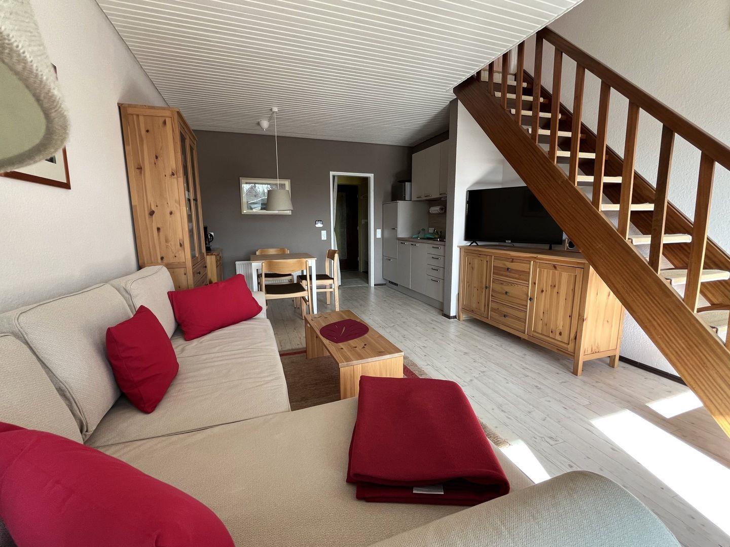 Es besteht aus einem großzügigen Wohn-, Ess- und Küchenbereich mit einer großen Fensterfront zum überdachten Balkon und herrlichem weiten Blick. Auf dem Balkon können Sie Ihre Urlaubstage ausklingen oder den Tag genießen und die Seele baumeln lassen. Im Schlafzimmer und der Balkontür finden Sie Fliegengitter vor.