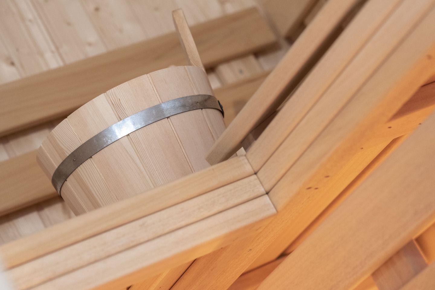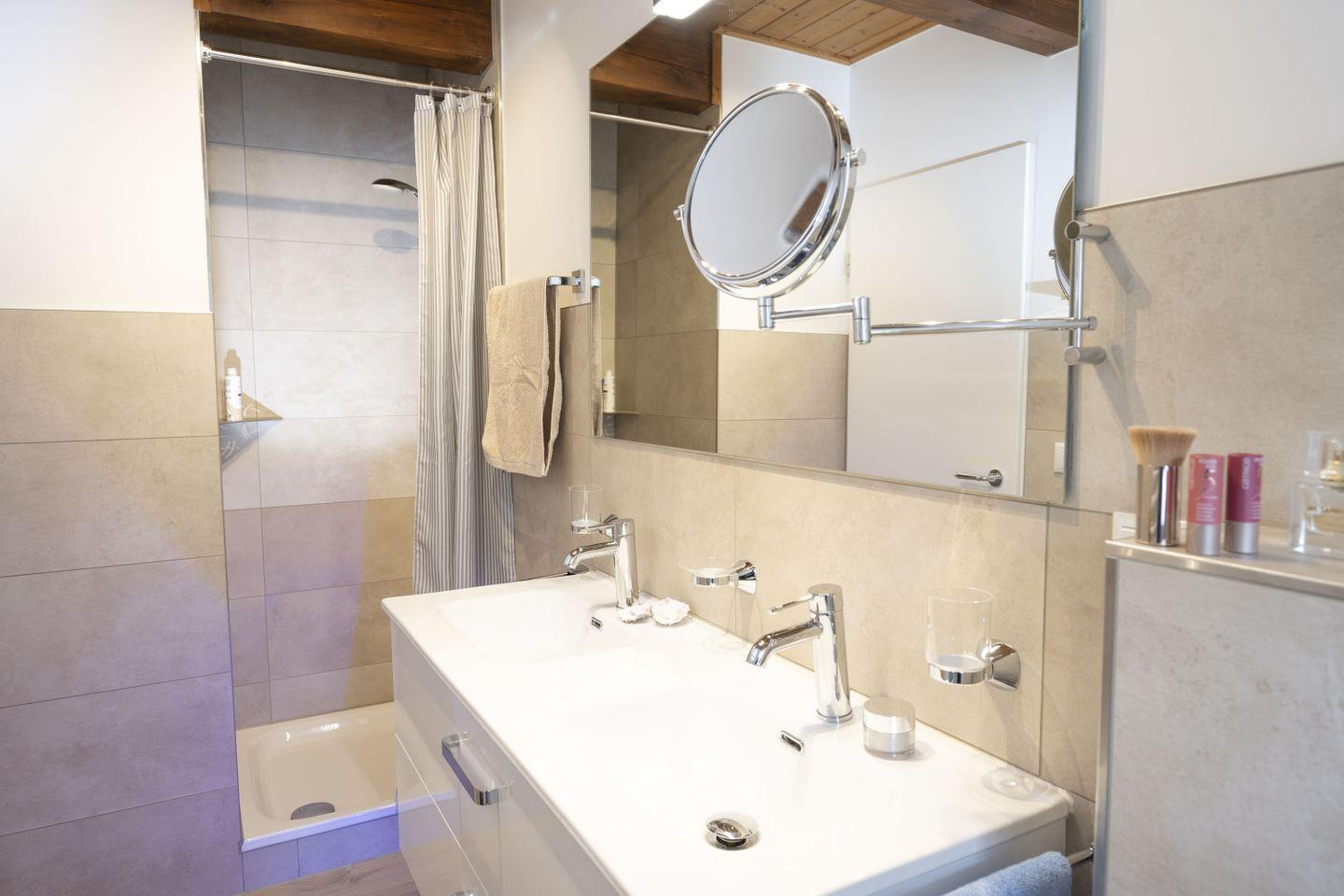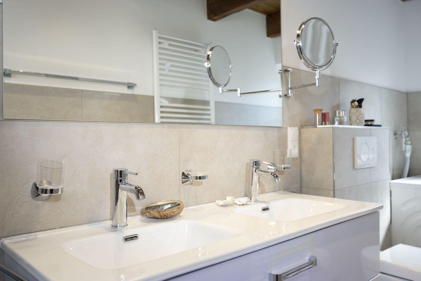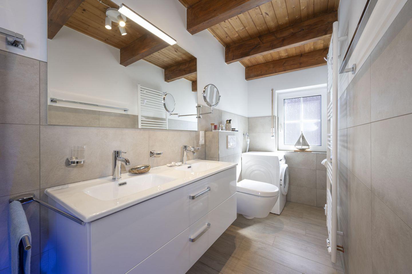 Besonderen Wert wird auf das Designer-Badezimmer mit Doppelwaschbecken, WC und Kosmetikspiegel, sowie ein Waschtrockner gelegt. Ein Fenster ist ebenfalls im Bad vorhanden, sowie ein Saunaraum (für die Sauna ist ein Münzautomat vorhanden, pro 64 Minuten wird eine 2€ Münze benötigt) mit zusätzlicher Dusche.