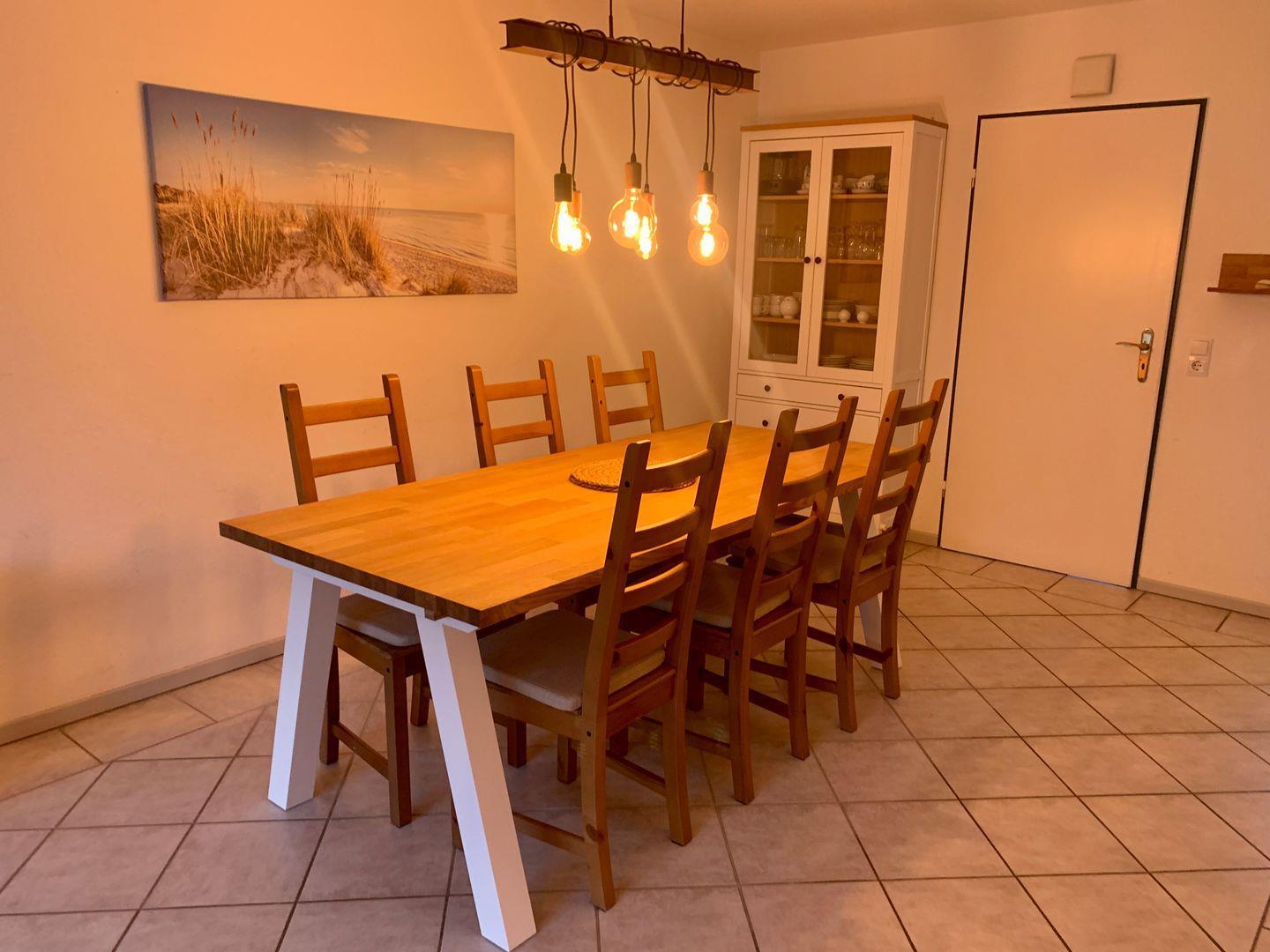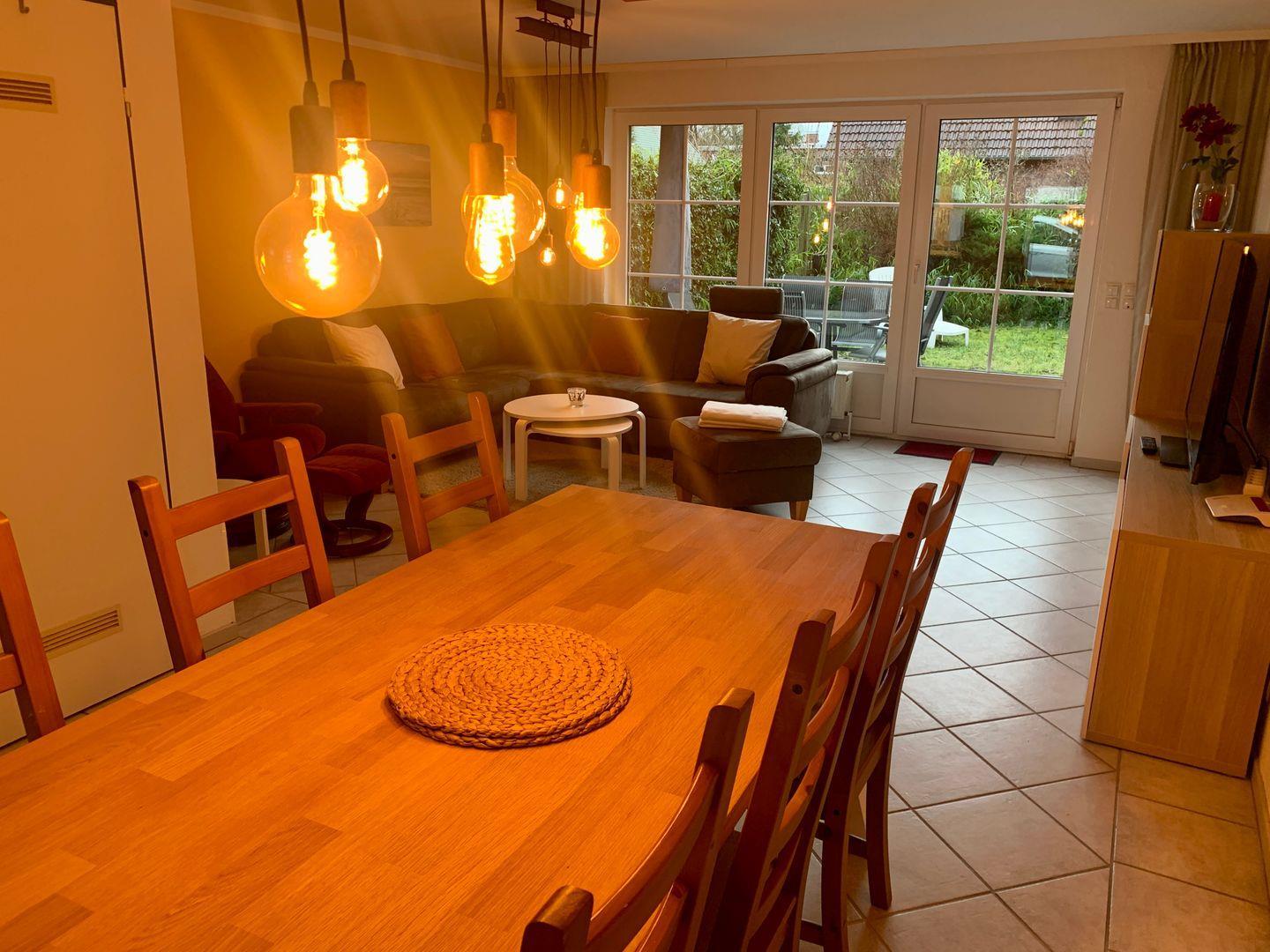 Dieser teilt sich in Esszimmer und Wohnzimmer auf, in dem der Blick direkt auf den schönen Esstisch und die Sofalandschaft fällt.