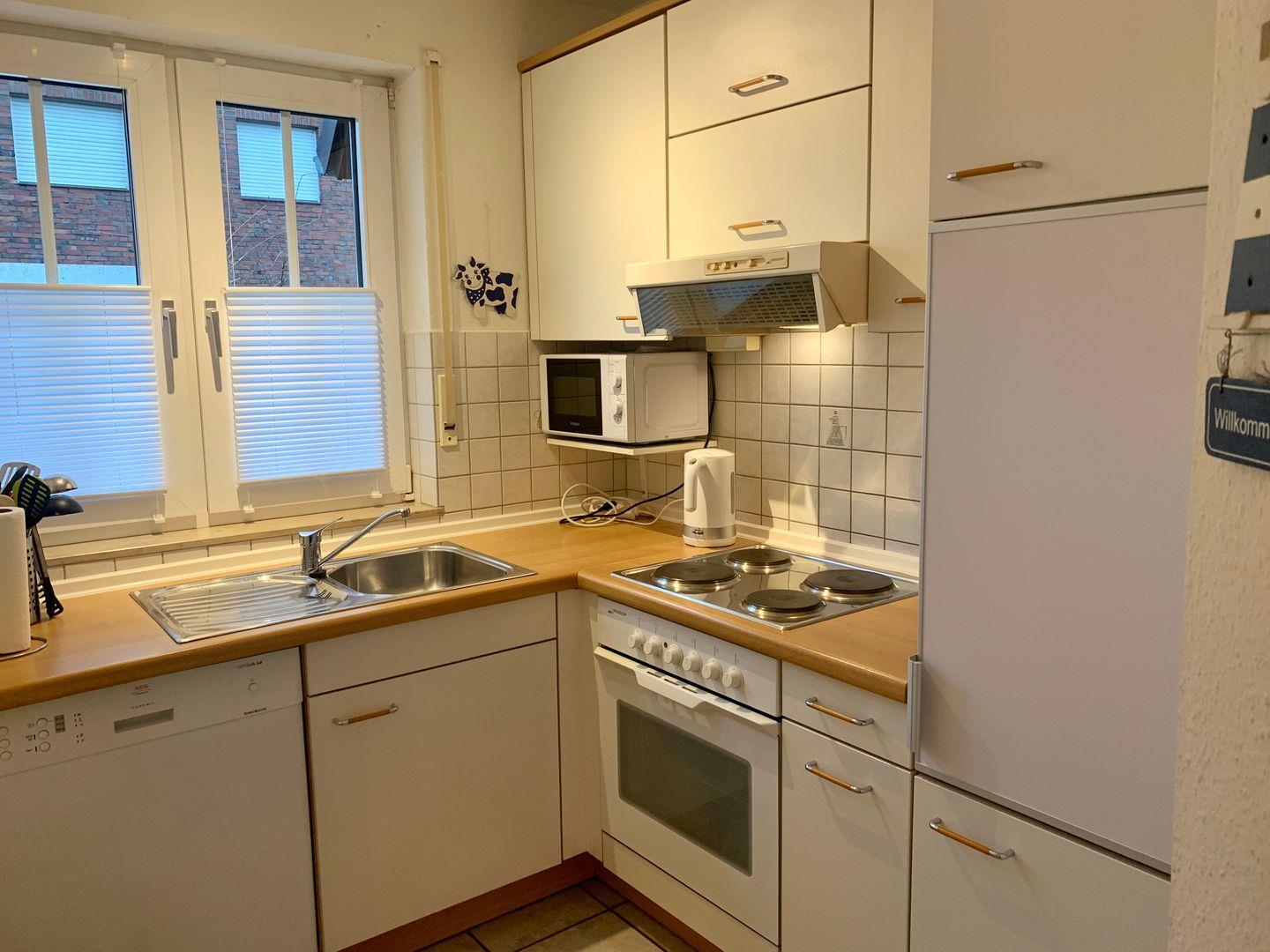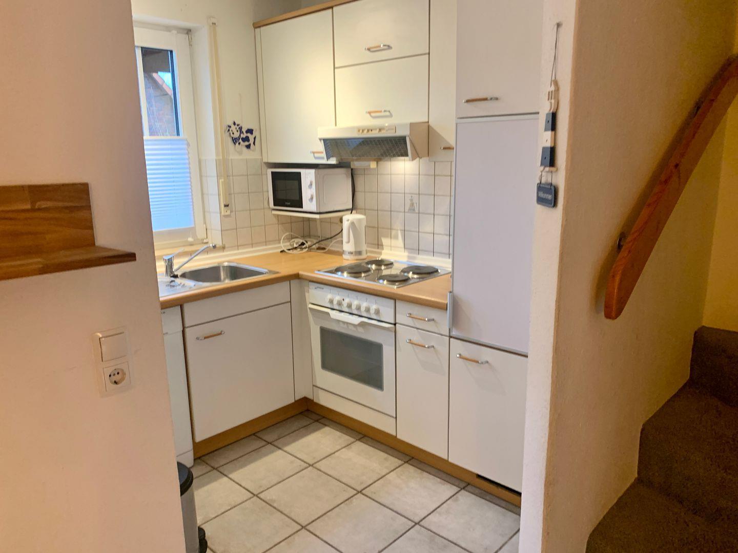 Vom Wohnraum hat man direkten Zugang zur offenen Küche, die mit Ihrer Ausstattung die Basis für ein schönes Abendessen bietet.