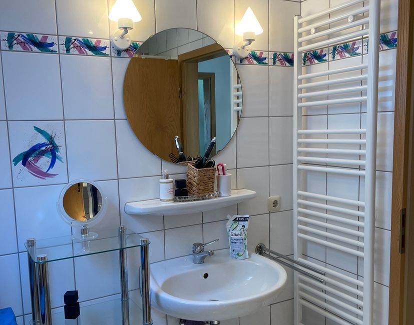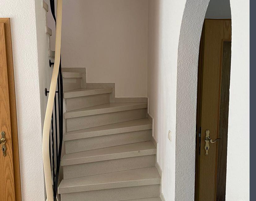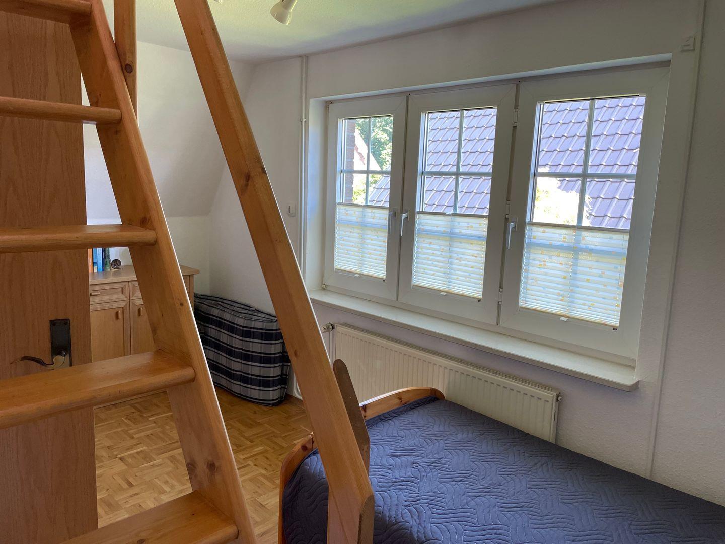 Eine geschlossene Treppe führt in das Obergeschoss. Hier befindet sich das Schlafzimmer mit einem Doppelbett gegenüber ist das kleinere Schlafzimmer mit 1 Einzelbett, auf der gleichen Ebene ist das Duschbad mit Fenster und eine Waschmaschine.