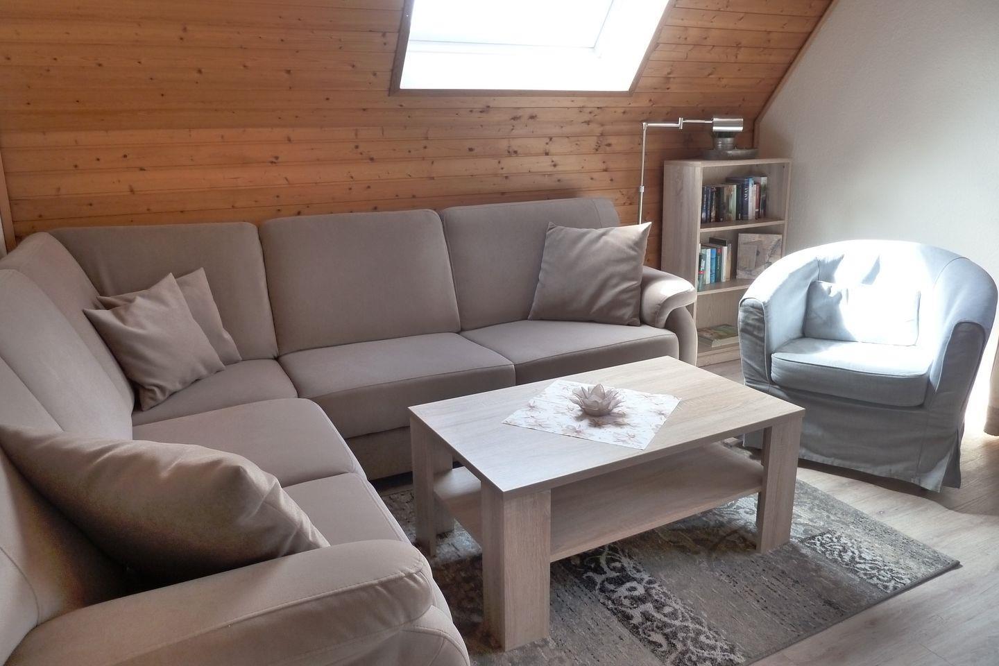 Das Wohnzimmer ist mit einem Rundecksofa eingerichtet und mit einem Tisch und 2 Sesseln. Auch sind ein SAT – Flachbildschirmfernseher, DVD-Player sowie Spiele und Bücher zum Zeitvertreib vorhanden.