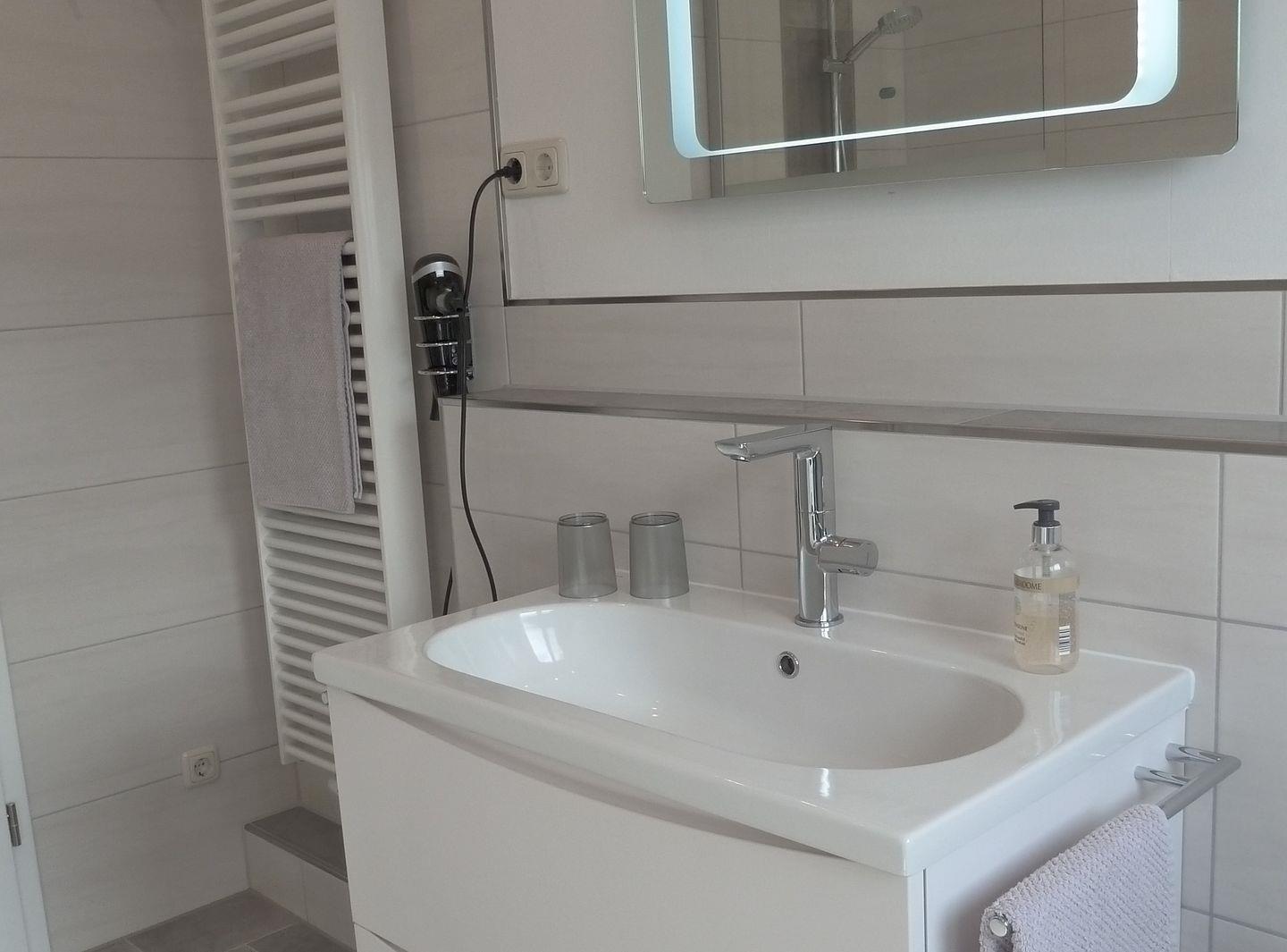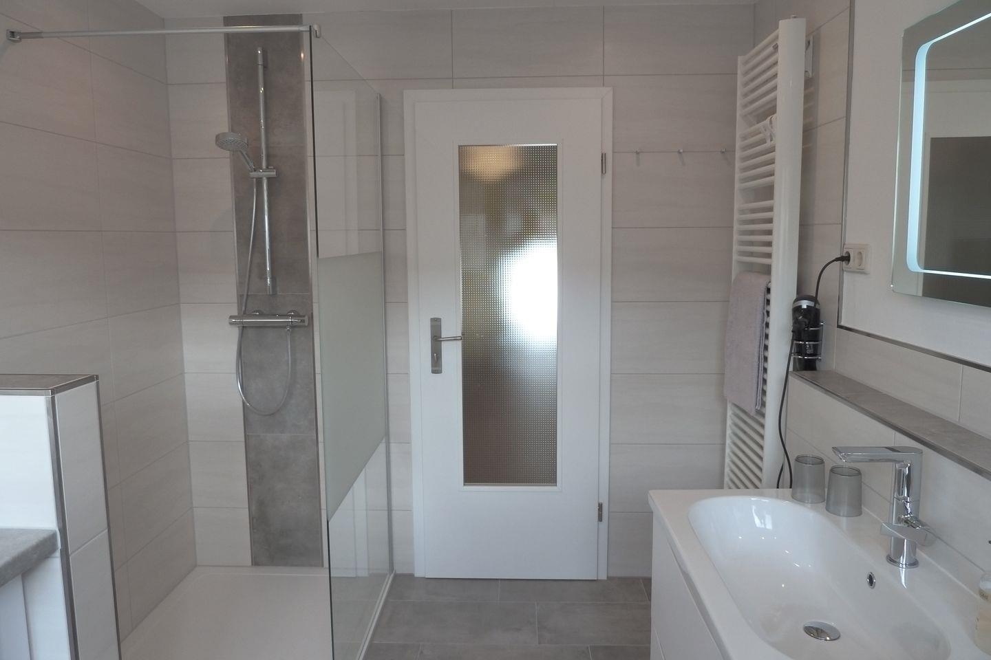 Das Tageslichtbad finden Sie modern gestaltet mit einem ebenerdigen Duscheinstieg vor. Die Dusche hat eine Größe von 90 x 160 cm. Im Badezimmer finden Sie des Weiteren eine Waschmaschine, einen Trockner, ein WC und einen Waschtisch mit Schubladenunterschrank. Hier ist jetzt eine kleine Wohlfühloase entstanden.