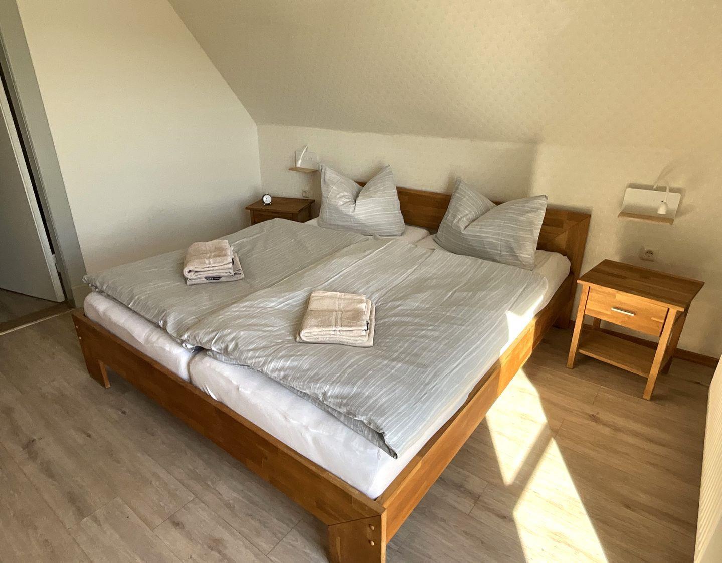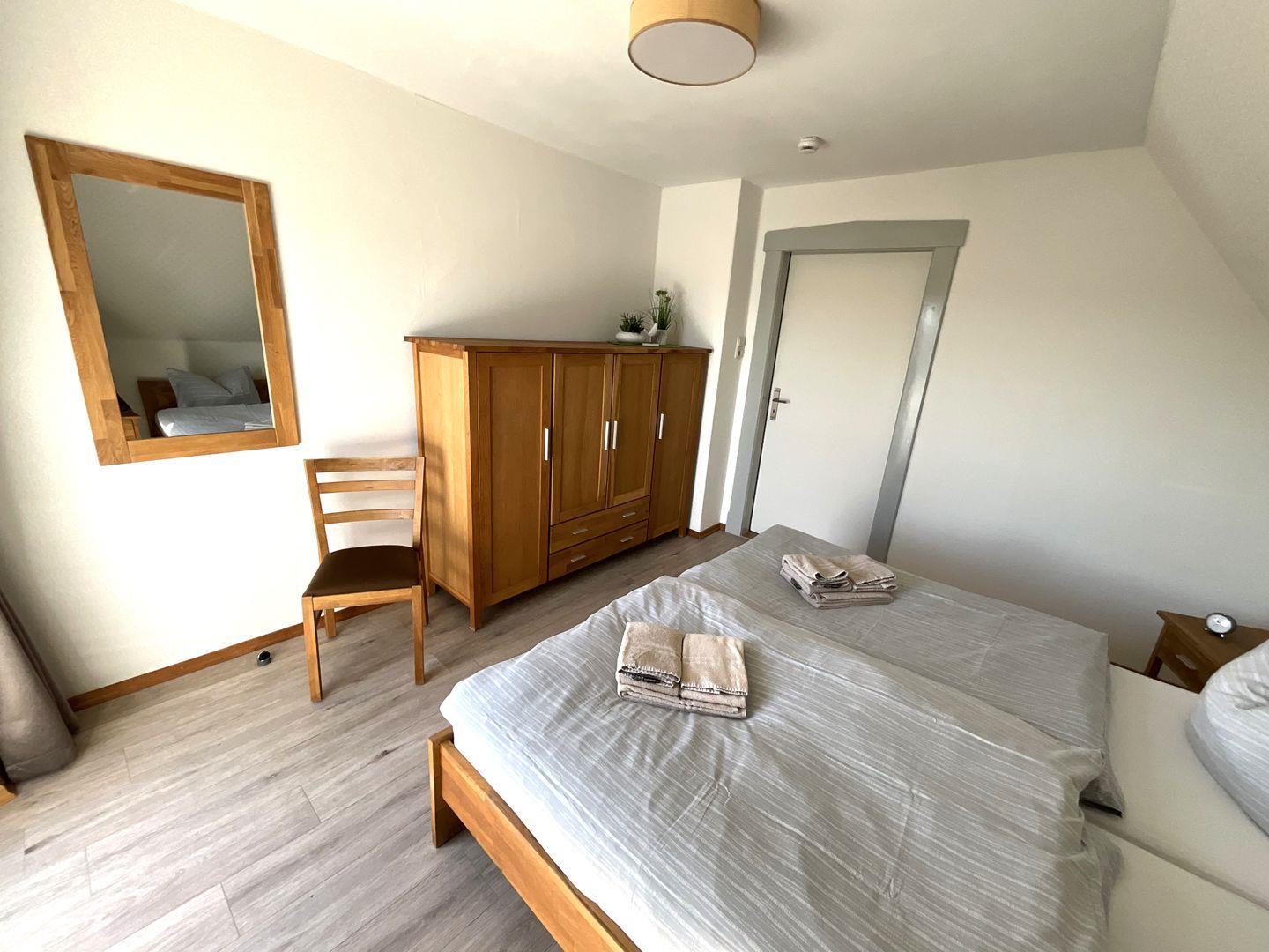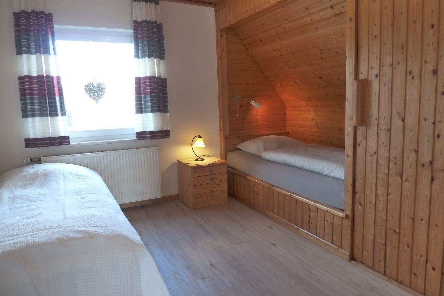 Im gemütlichen Alkhovenschlafzimmer ist unter der Dachschräge ein Alkovenbett (100 x 200 cm) sowie ein großer mit Schiebetüren zu schließender Schrank eingebaut. Für die vierte Schlafmöglichkeit steht ein weiteres Bett gegenüber vom Alkovenbett. Ein Waschbecken mit Spiegelschränkchen ermöglicht in diesem Zimmer die kleine „Katzenwäsche“.