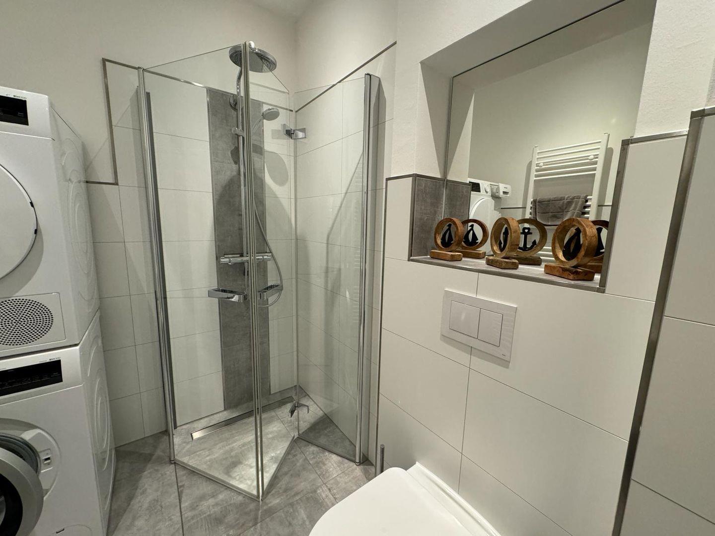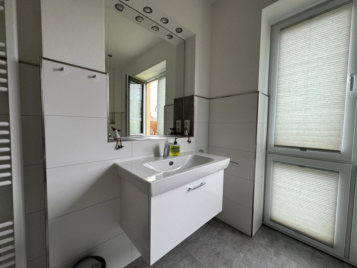 Vom Flur gelangt man in das zweite, komfortable kleinere Bad mit Dusche und WC.