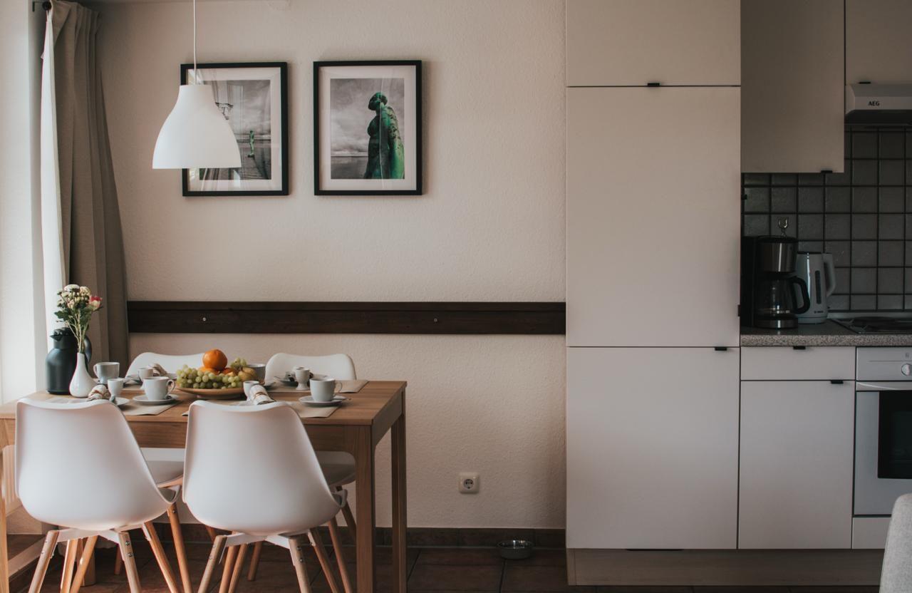 Die Arngast Suite in Dangast bietet auf 60 m² Platz für bis zu vier Personen. Diese modern eingerichtete Ferienunterkunft verfügt über zwei Schlafzimmer, ein Badezimmer sowie eine offene Küche, die zum Wohnzimmer hin übergeht.