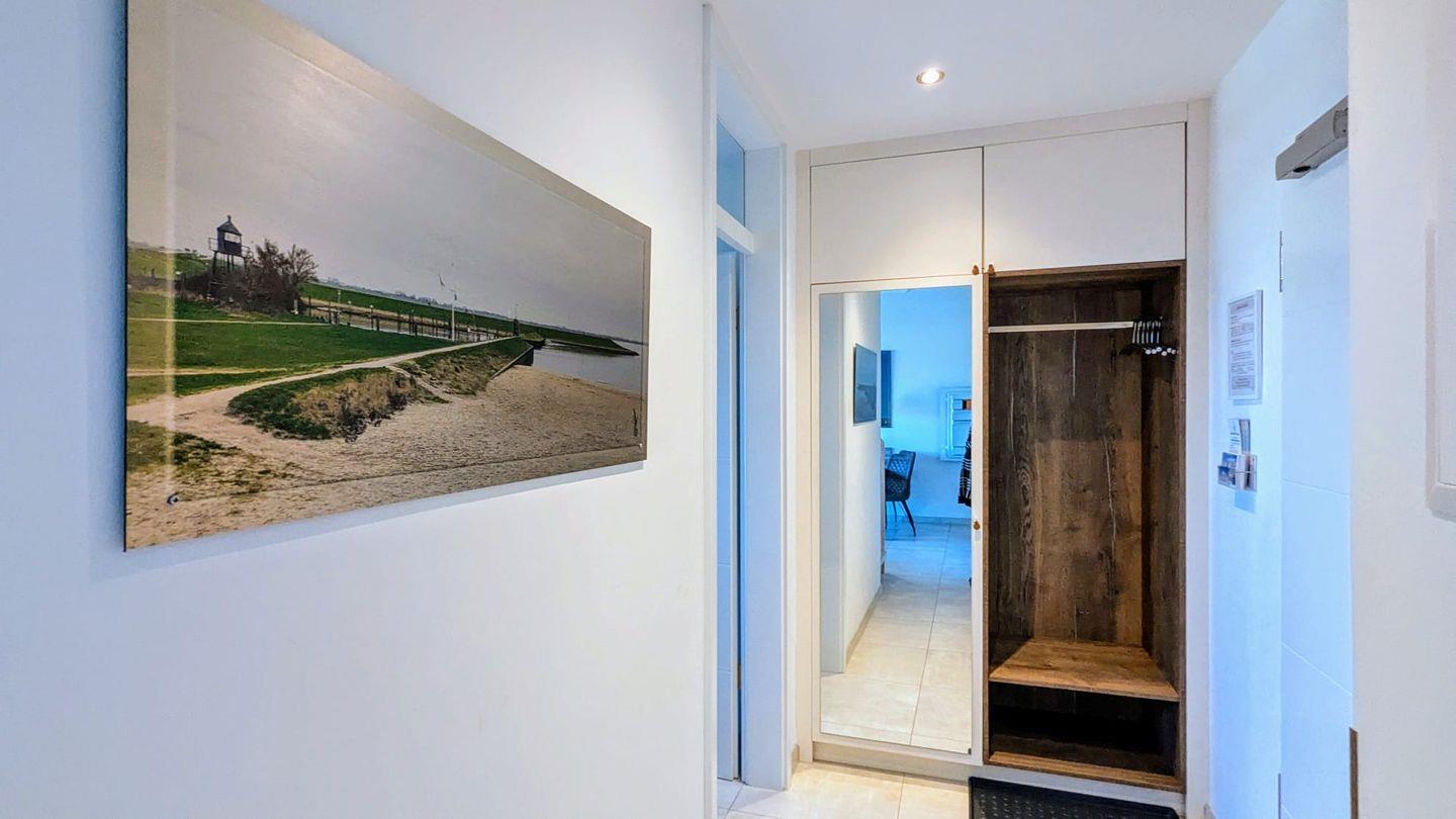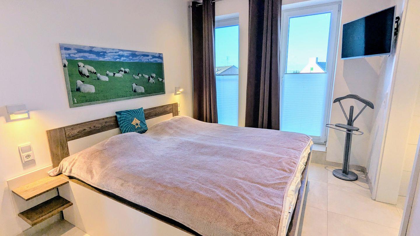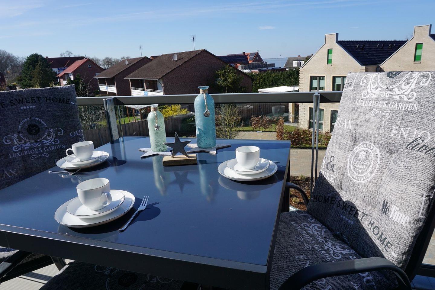 Ein weiteres Highlight ist der Zugang zum Balkon, von dem Sie eine herrliche Sicht auf die Umgebung genießen können. Die großen Fenster der Ferienwohnung sorgen nicht nur für einen großzügigen Lichteinfall, sondern bieten auch einen Blick auf das nahegelegene Meer. Bei schönem Wetter können Sie nach einem aufregenden Tag an der Nordsee auf dem Balkon entspannen und den Sonnenuntergang bewundern.
