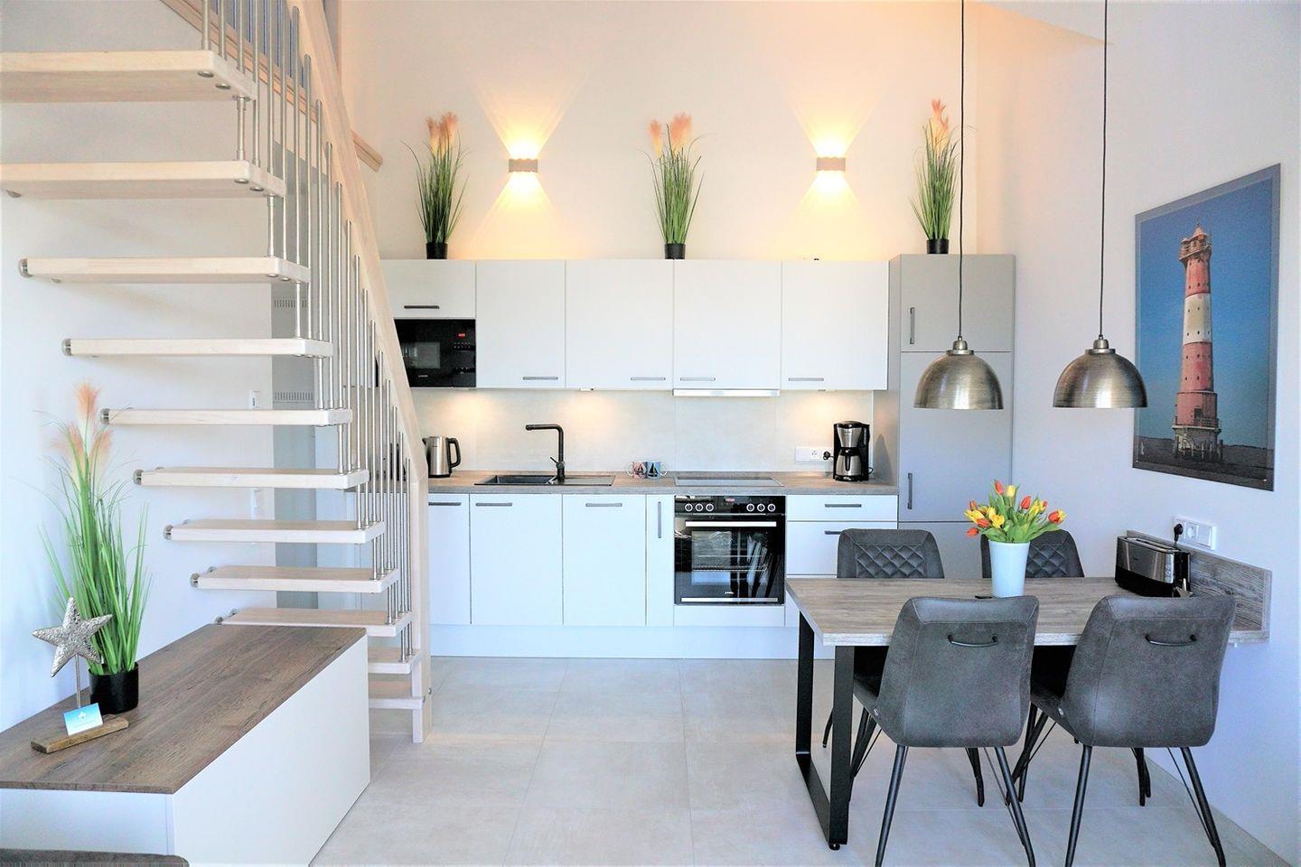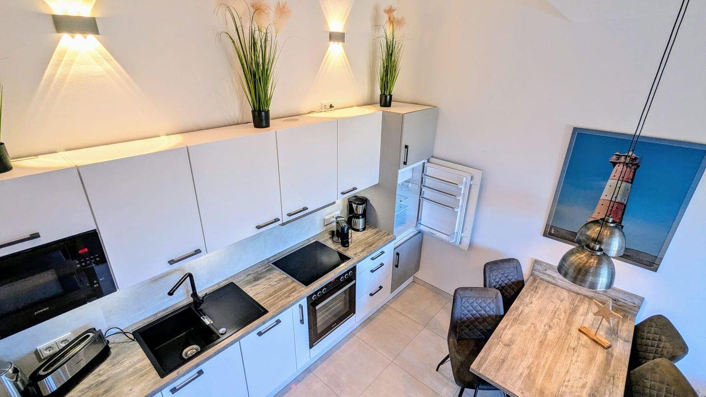 Die voll ausgestattete offene Küche lädt zum Kochen ein.