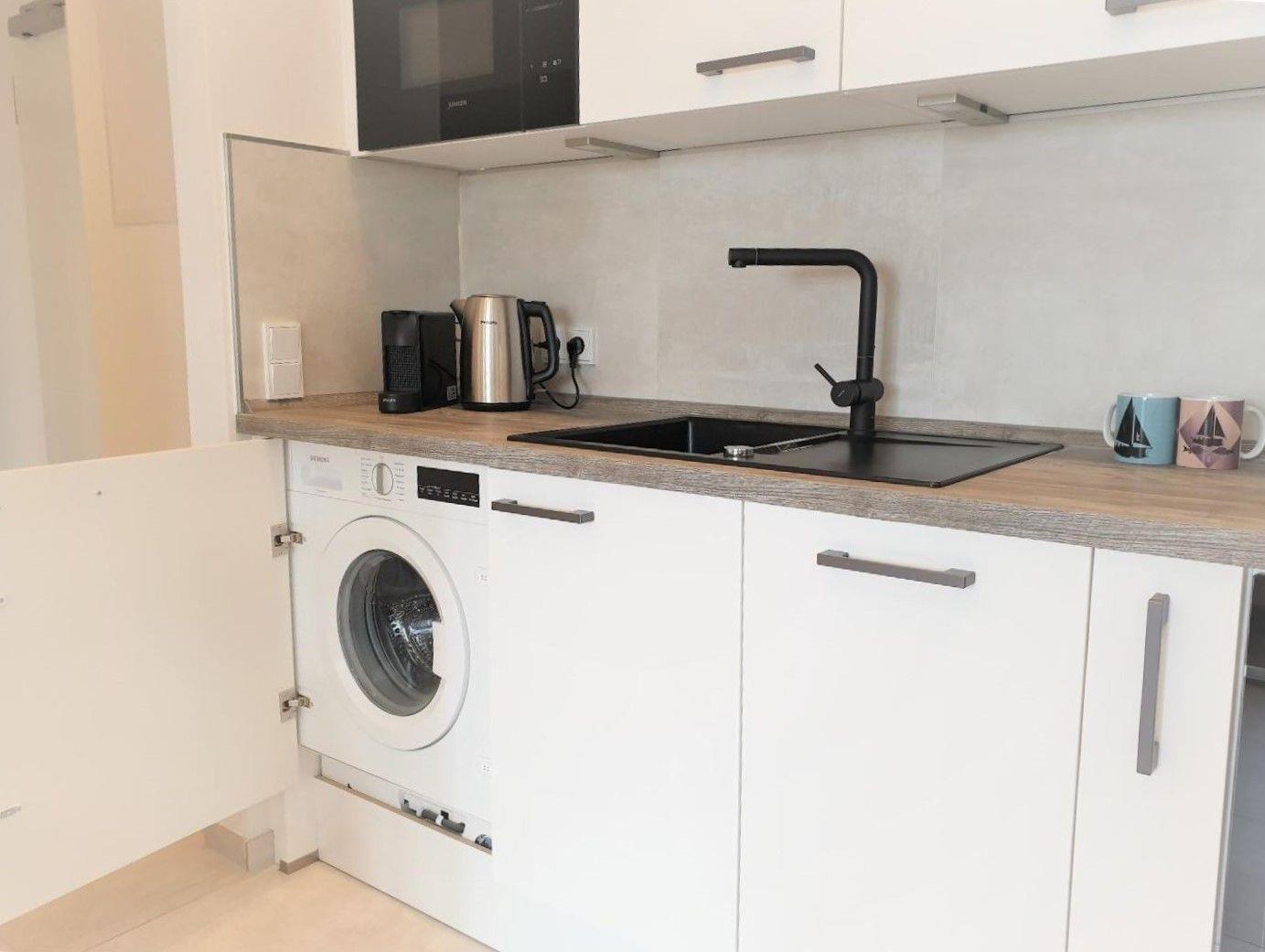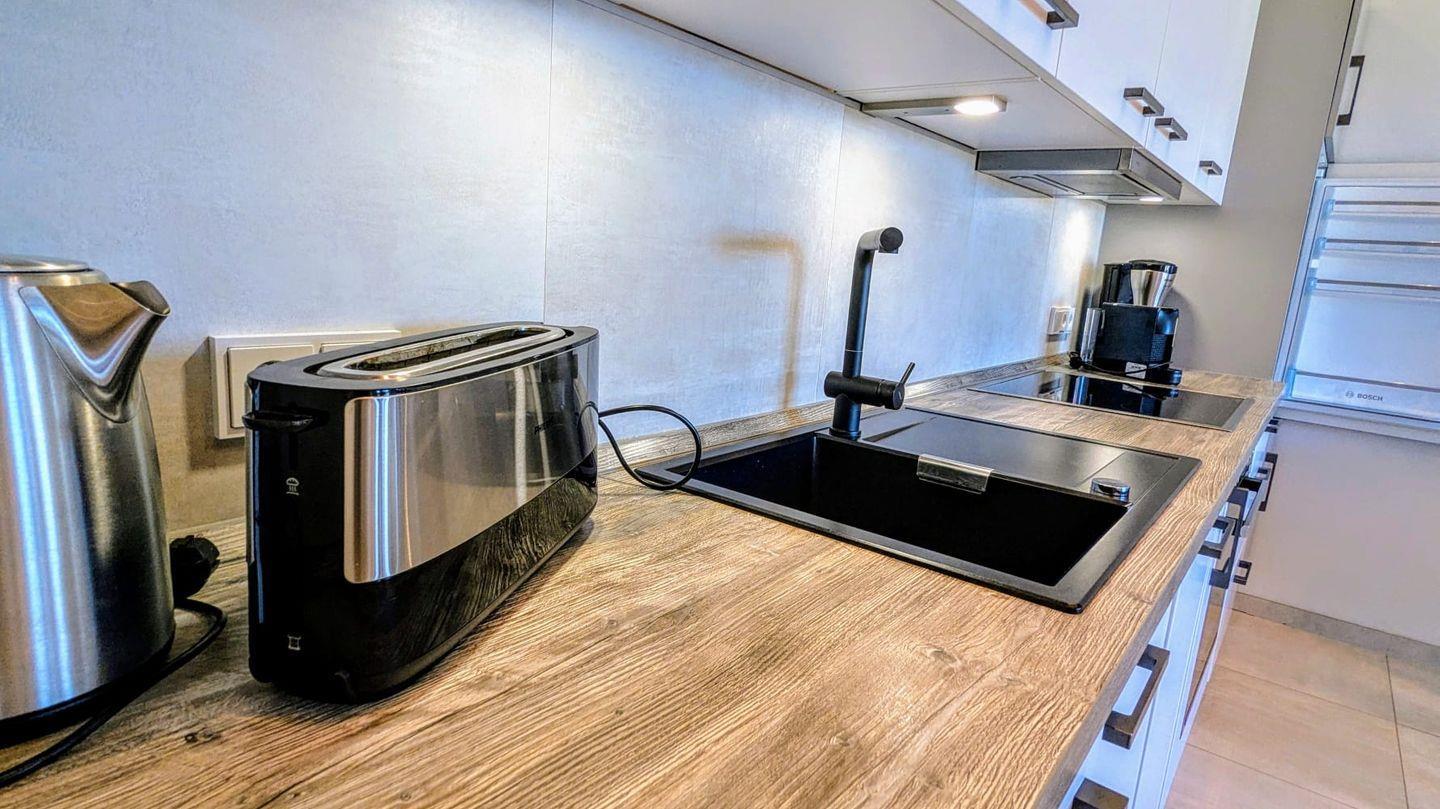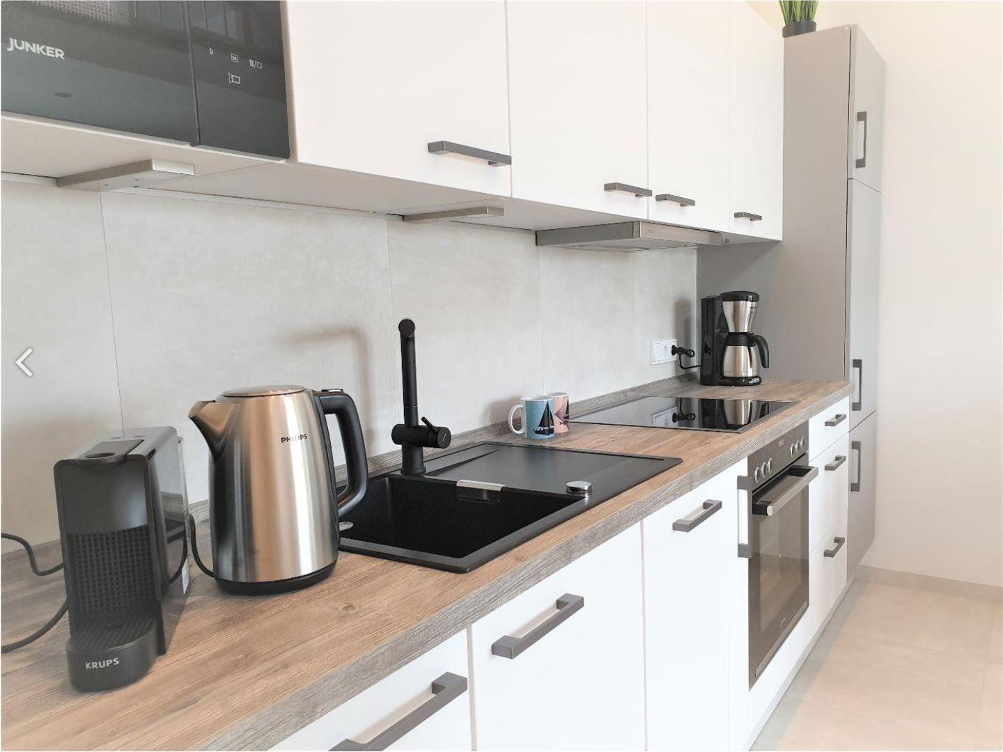 Die Ferienwohnung verfügt über zwei Zimmer: ein gemütliches Schlafzimmer mit ausreichend Platz für Ihre Erholung und einen offenen Wohnbereich, der mit einer voll ausgestatteten Küche kombiniert ist. Hier finden Sie alles, was Sie benötigen, um sich während Ihres Aufenthalts kulinarisch verwöhnen zu können – von einem Herd, einer Mikrowelle, einem Geschirrspüler bis hin zu einer Kaffeemaschine für den perfekten Morgenkaffee. Der Essbereich lädt zum gemeinsamen Frühstück und Abendessen ein und schafft einen geselligen Rahmen für schöne Stunden.